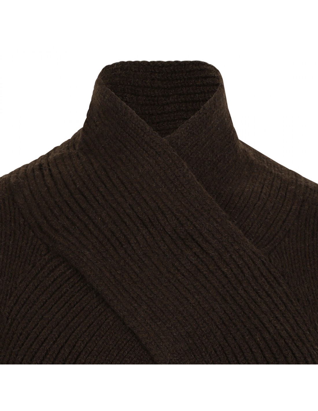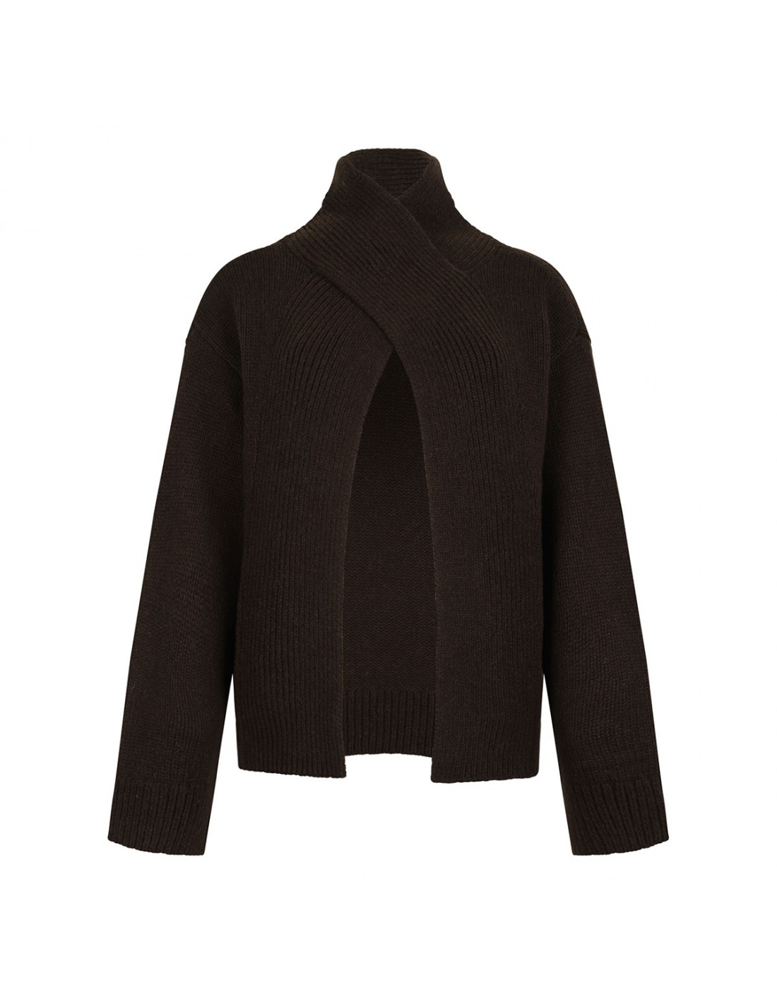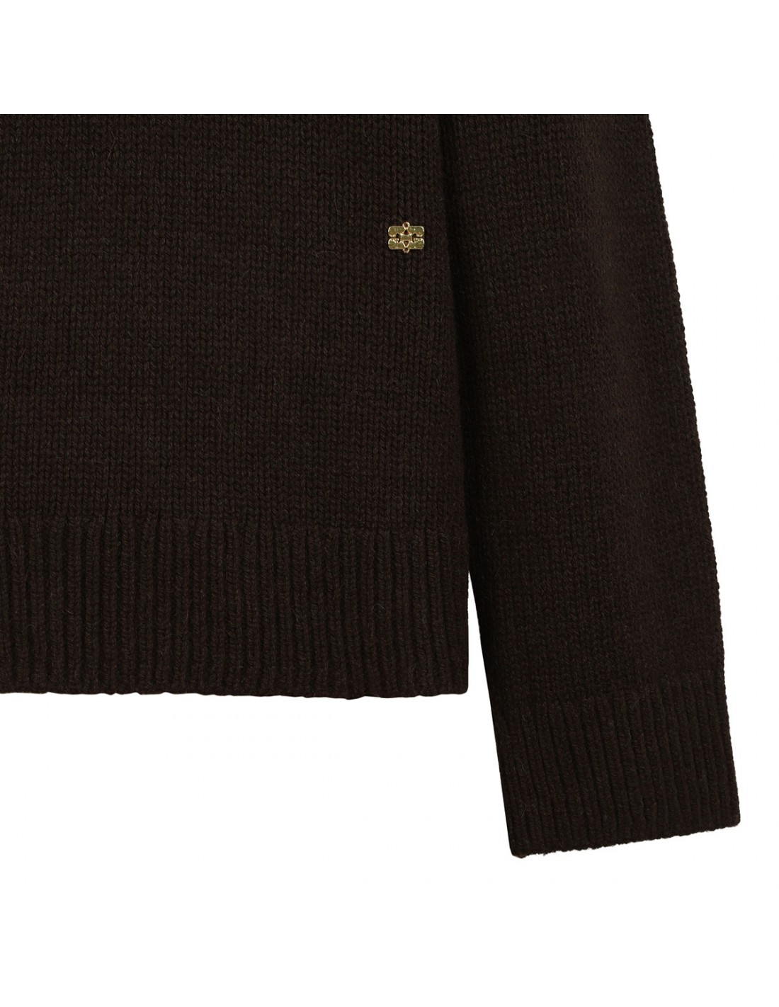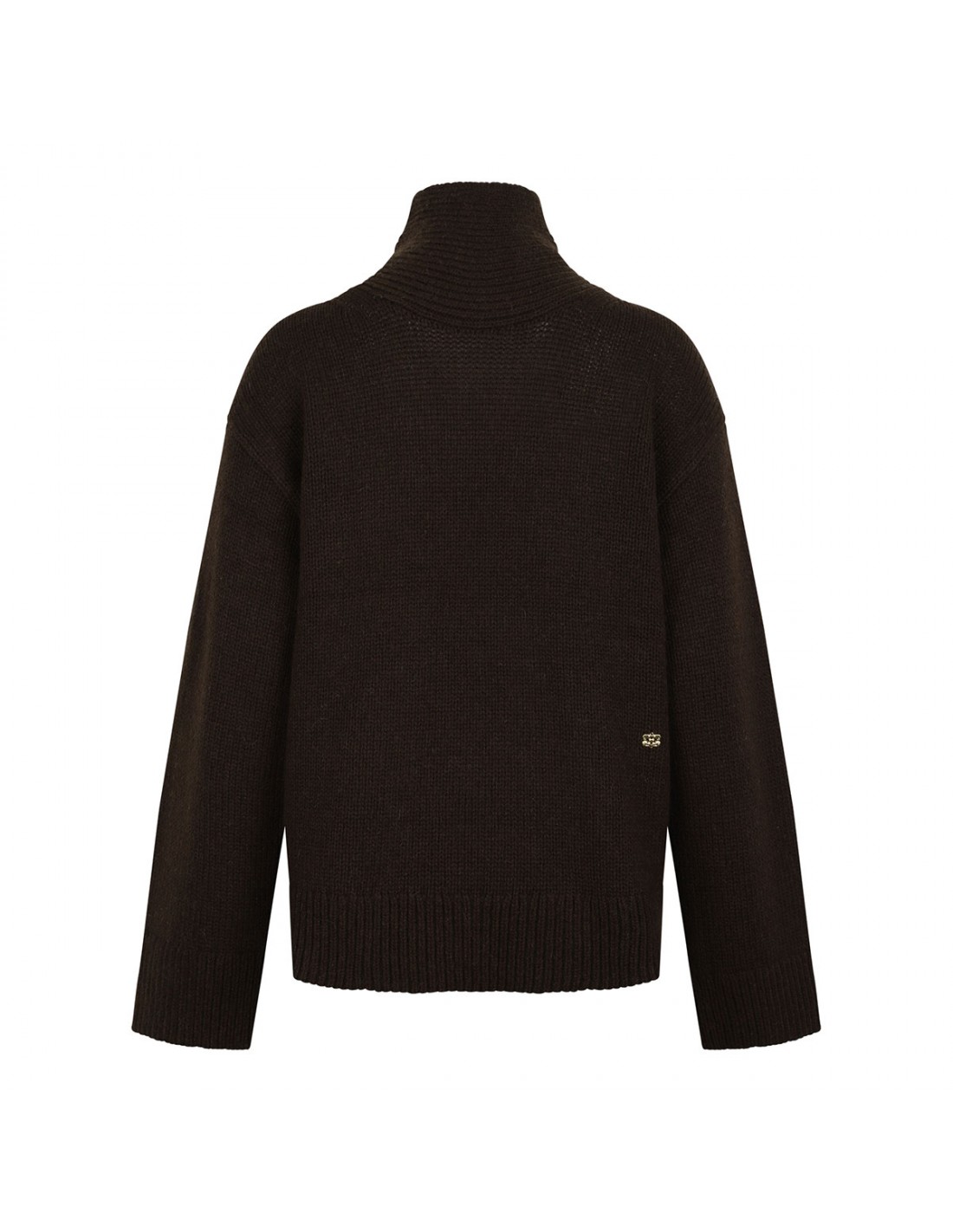 Chocolate hue wool and yak blend sweater from Ganni featuring turtleneck, open back, Butterfly logo embroidered at the hem, relaxed fit, ribbed-knit edges.