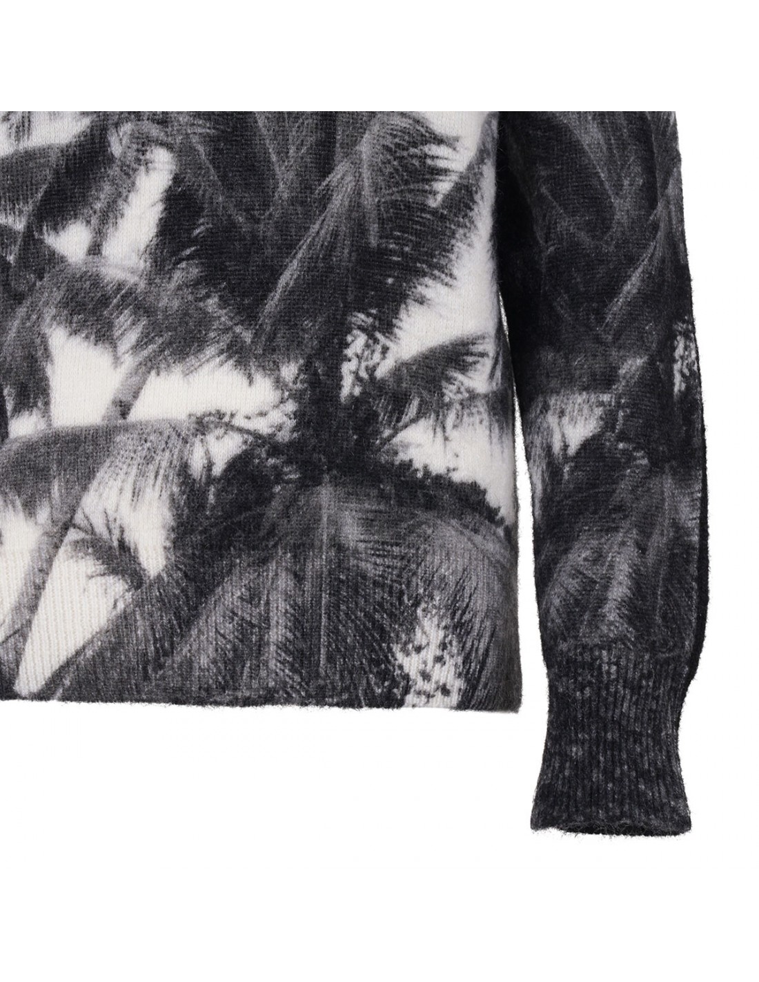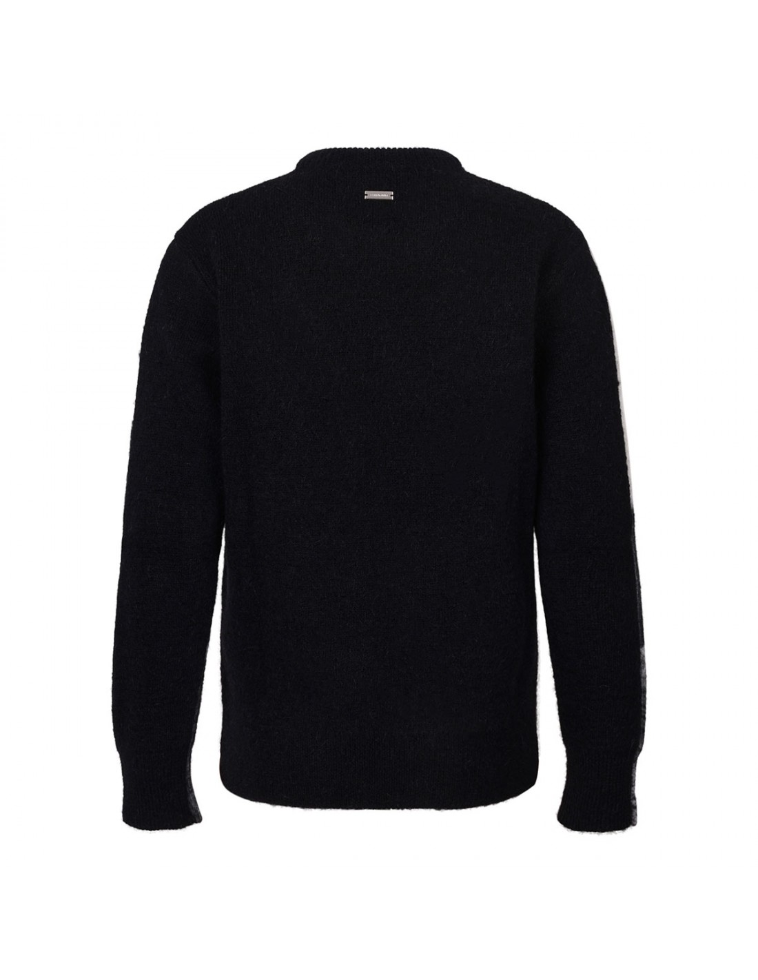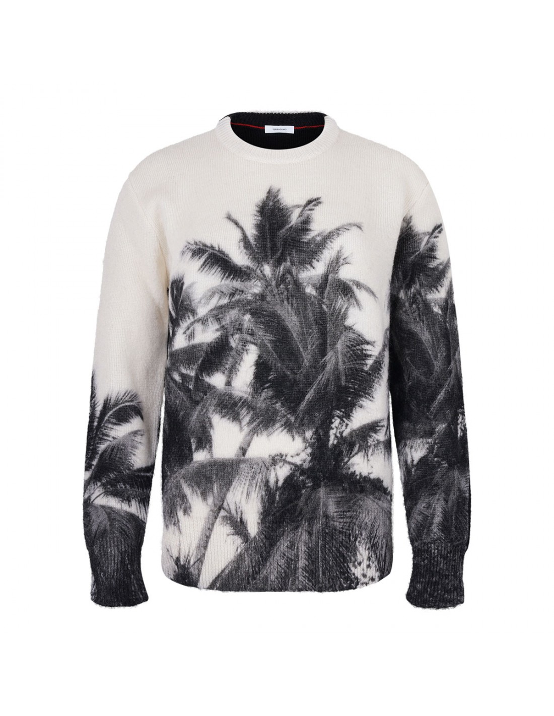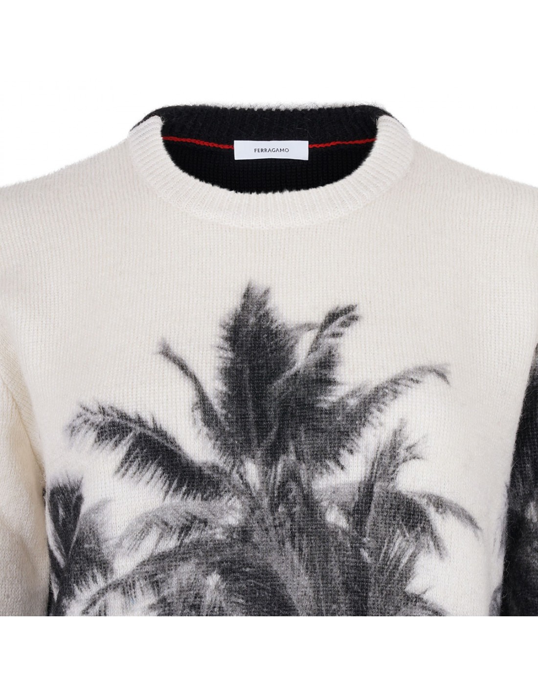 White and black wool blend sweater from Ferragamo featuring Trinidad motif intarsia, black back, crew collar, long sleeves, ribbed knit edges.