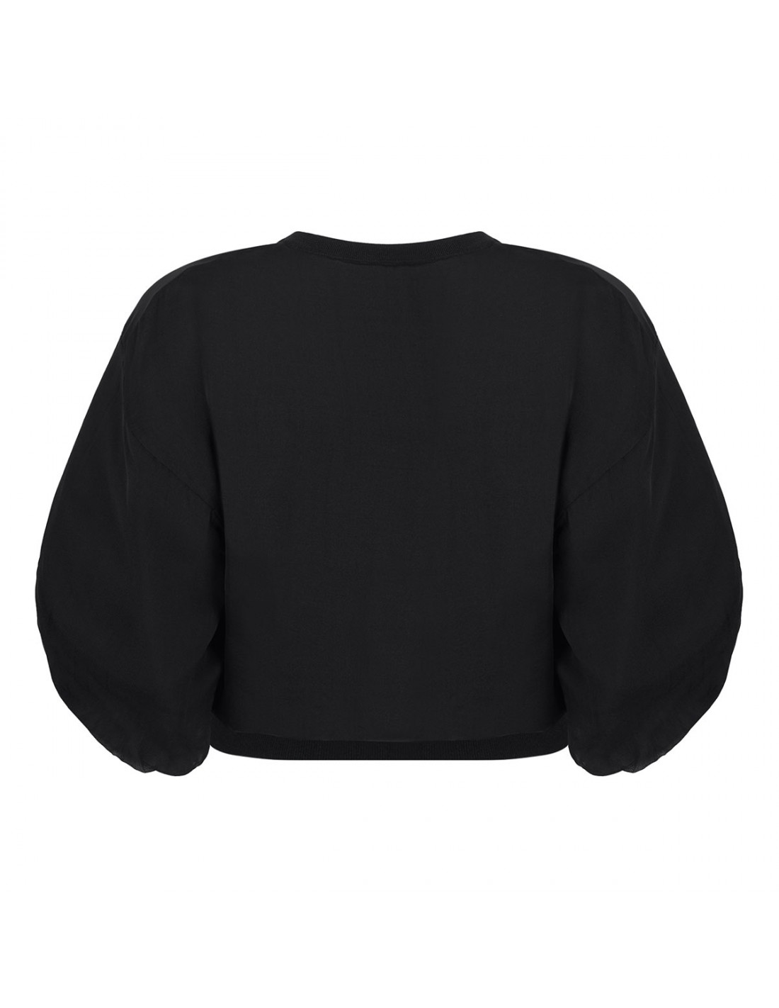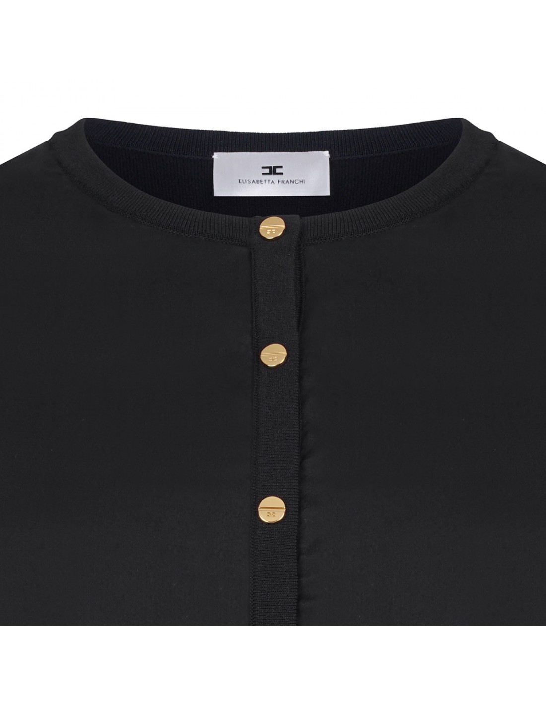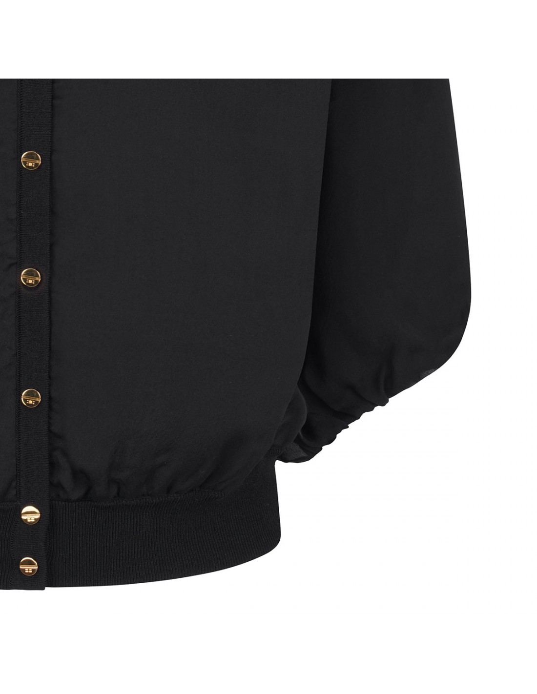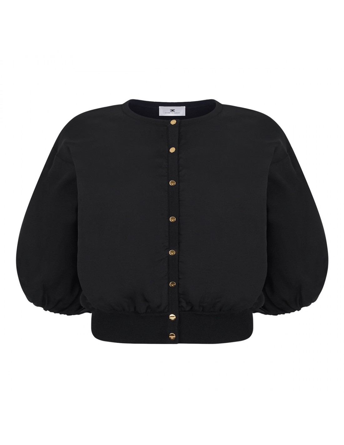 Black voile cardigan from Elisabetta Franchi featuring oversized silhouette, wide puffed sleeves with elastic cuffs, golden metal logo button closure.