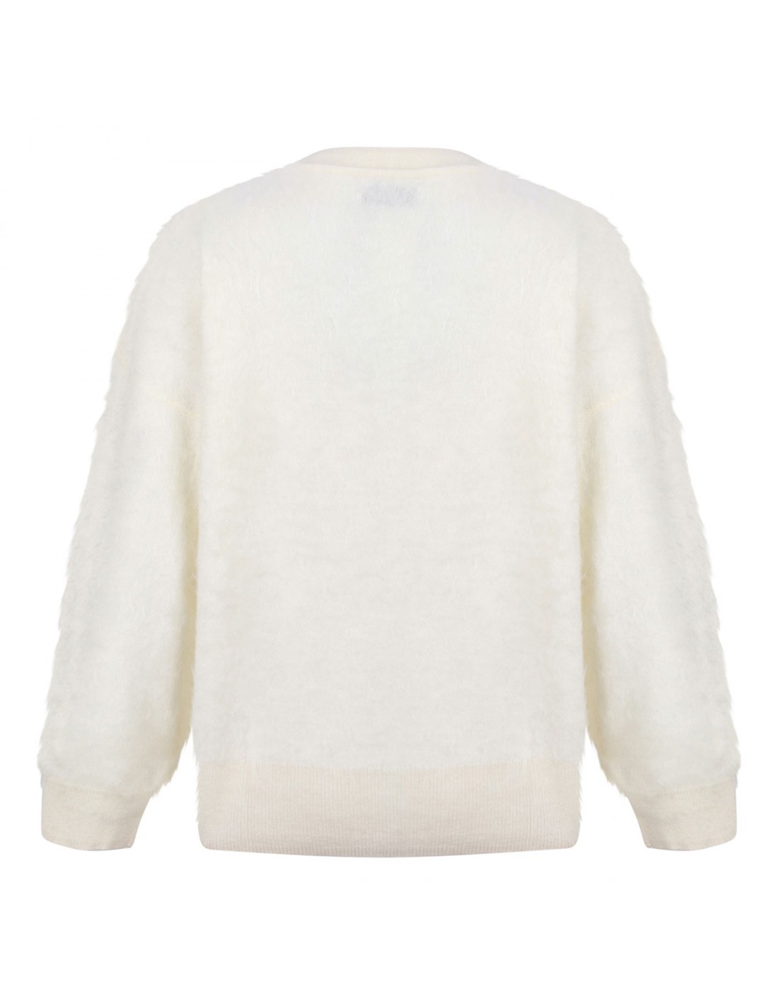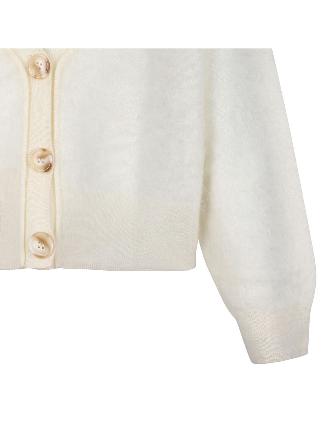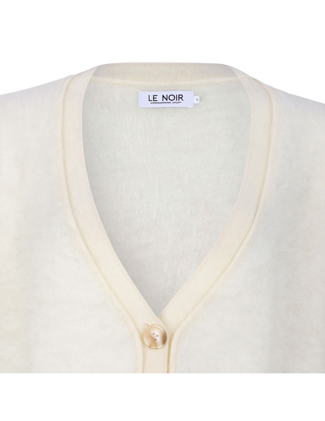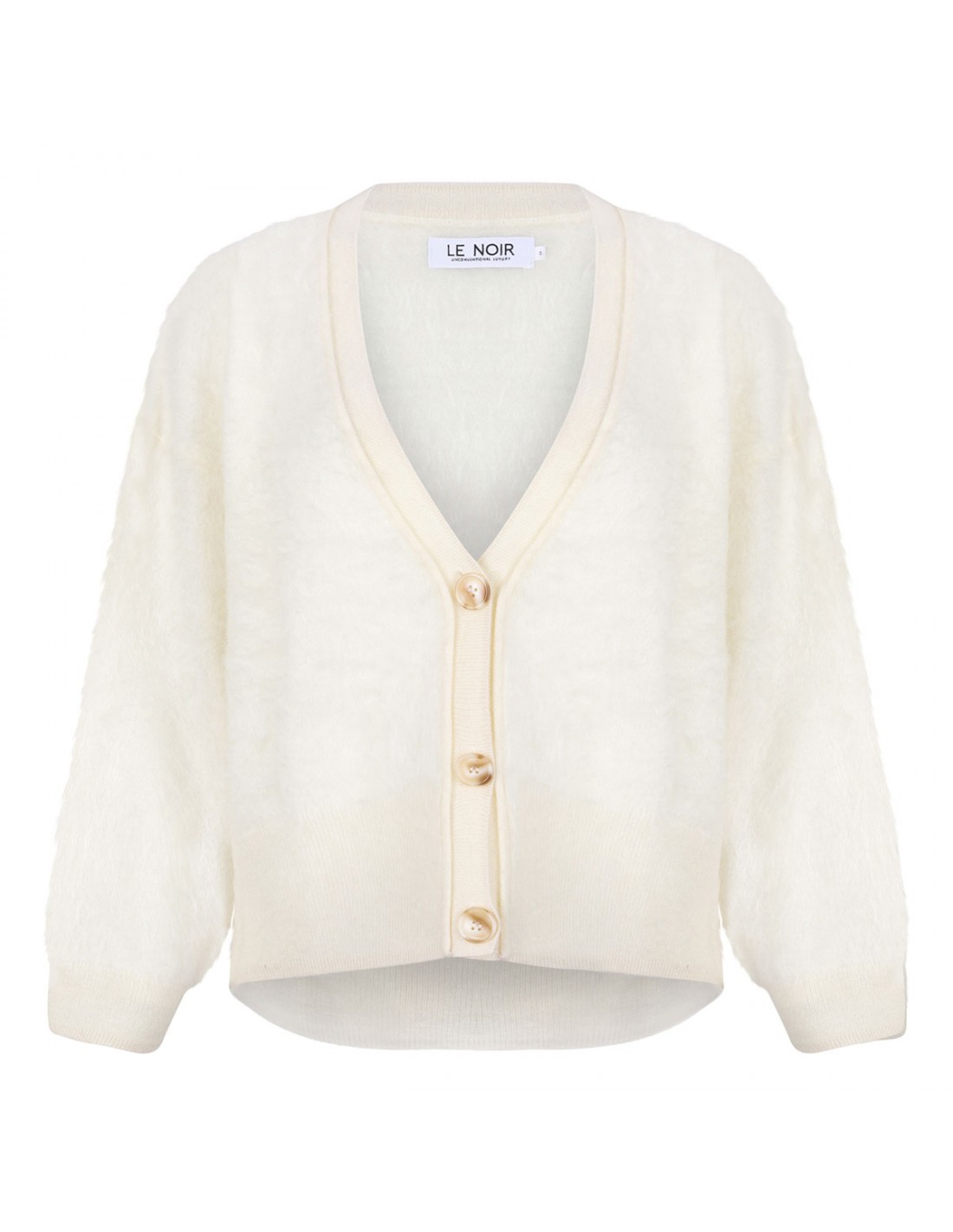 Ecru fluffy knit Lee cardigan from Le Noir featuring button closure on front, V-neck, long sleeves, ribbed-knit edges.