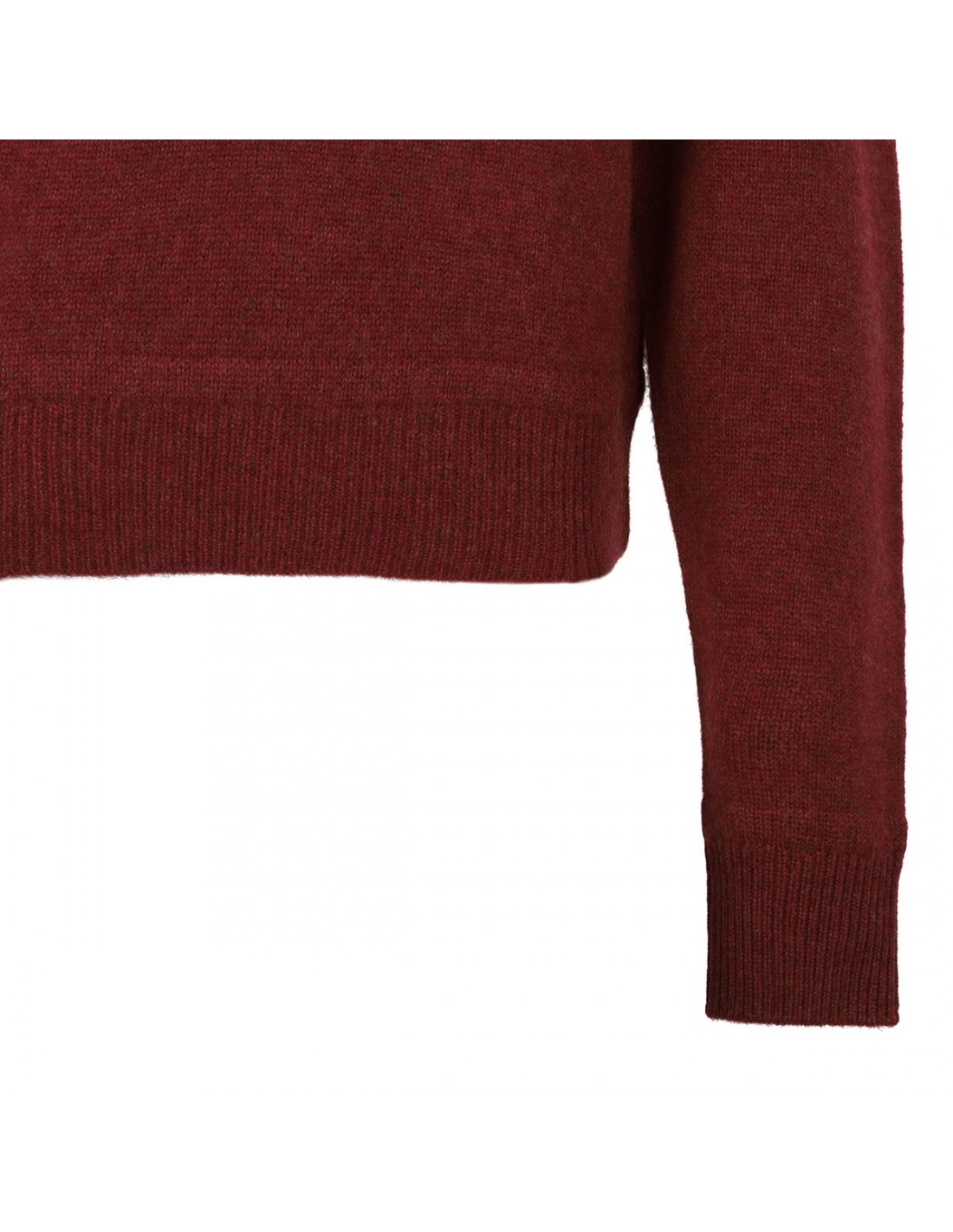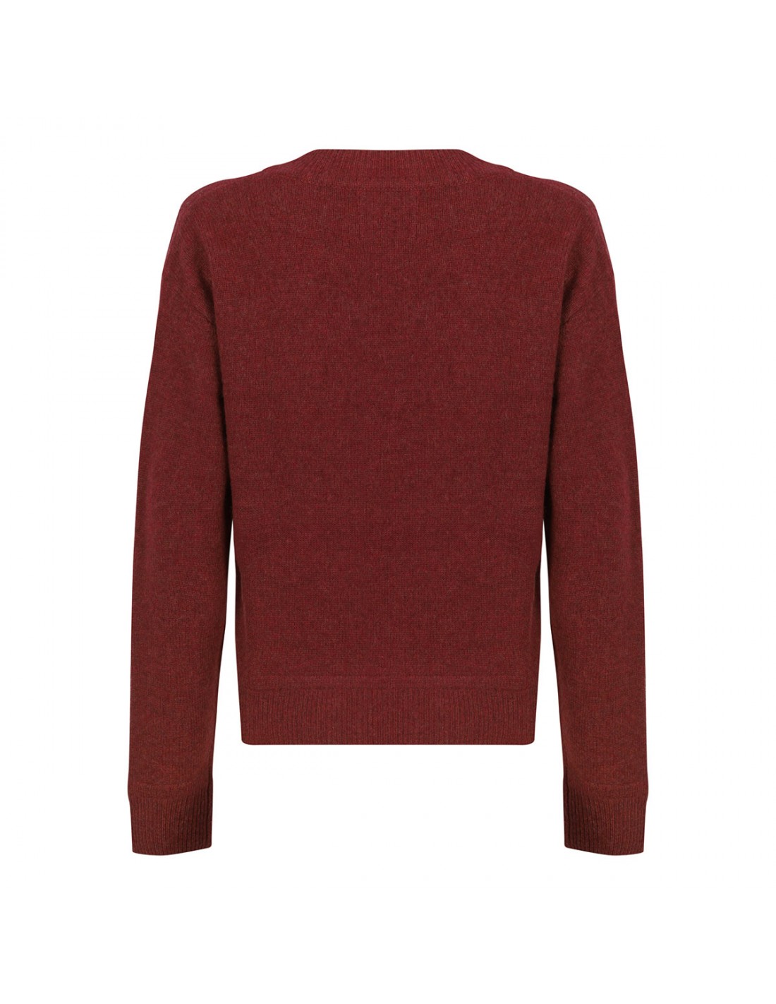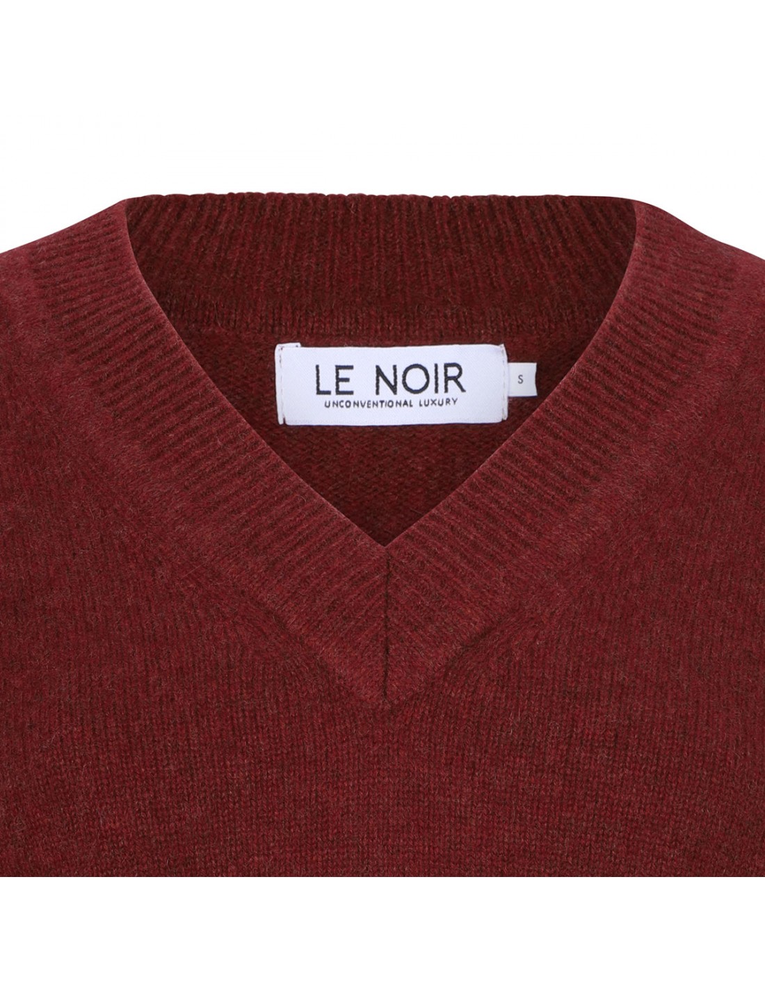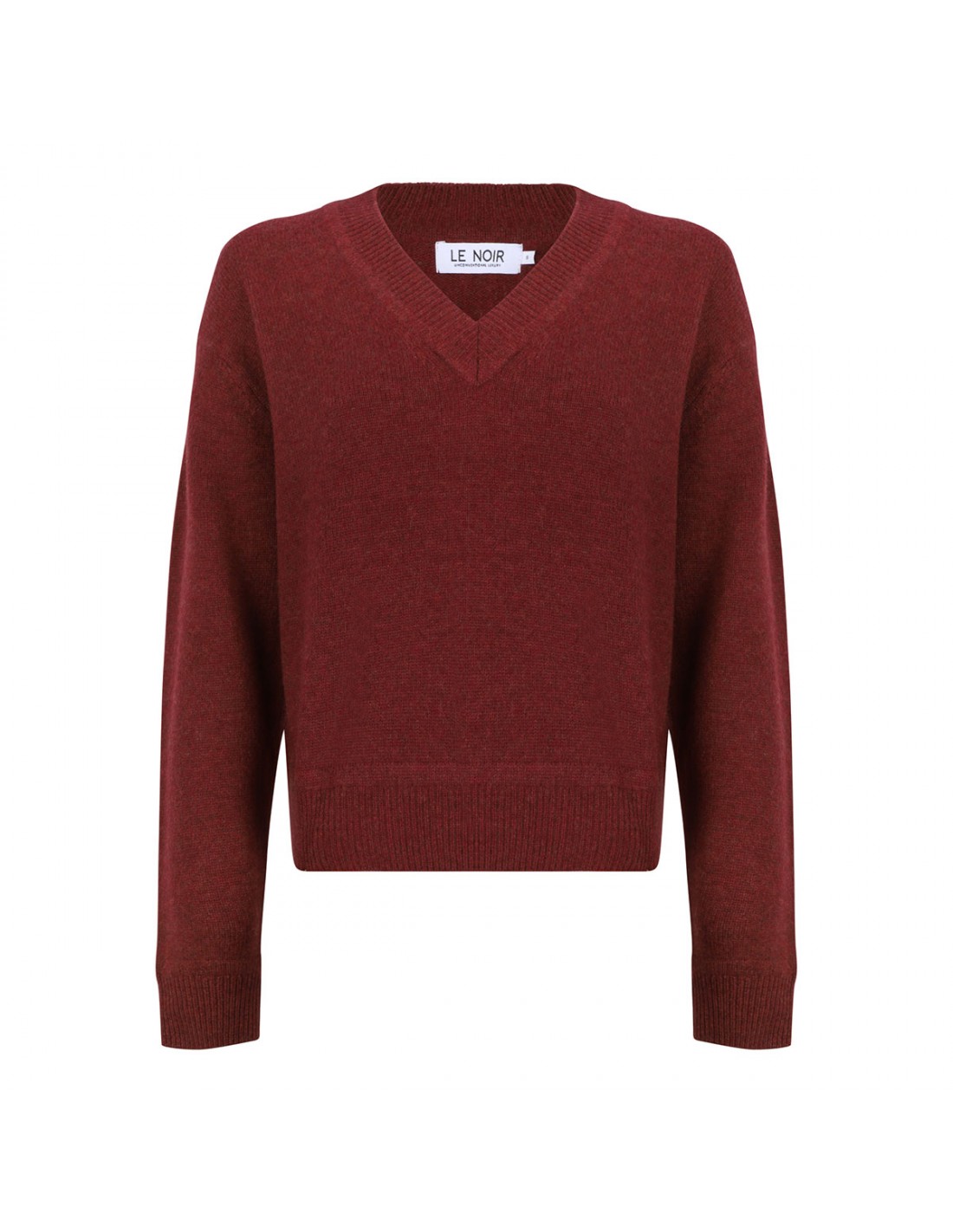 Burnt red hue knit Themis sweater from Le Noir featuring V-neck, long sleeves, dropped shoulders and ribbed knit edges.