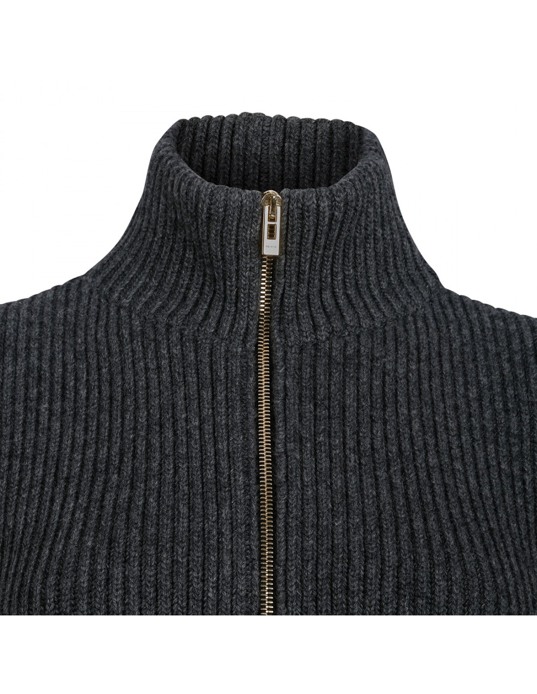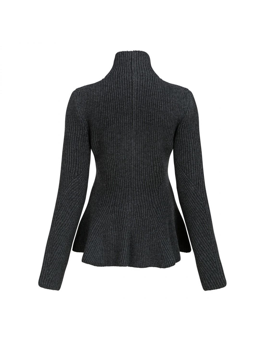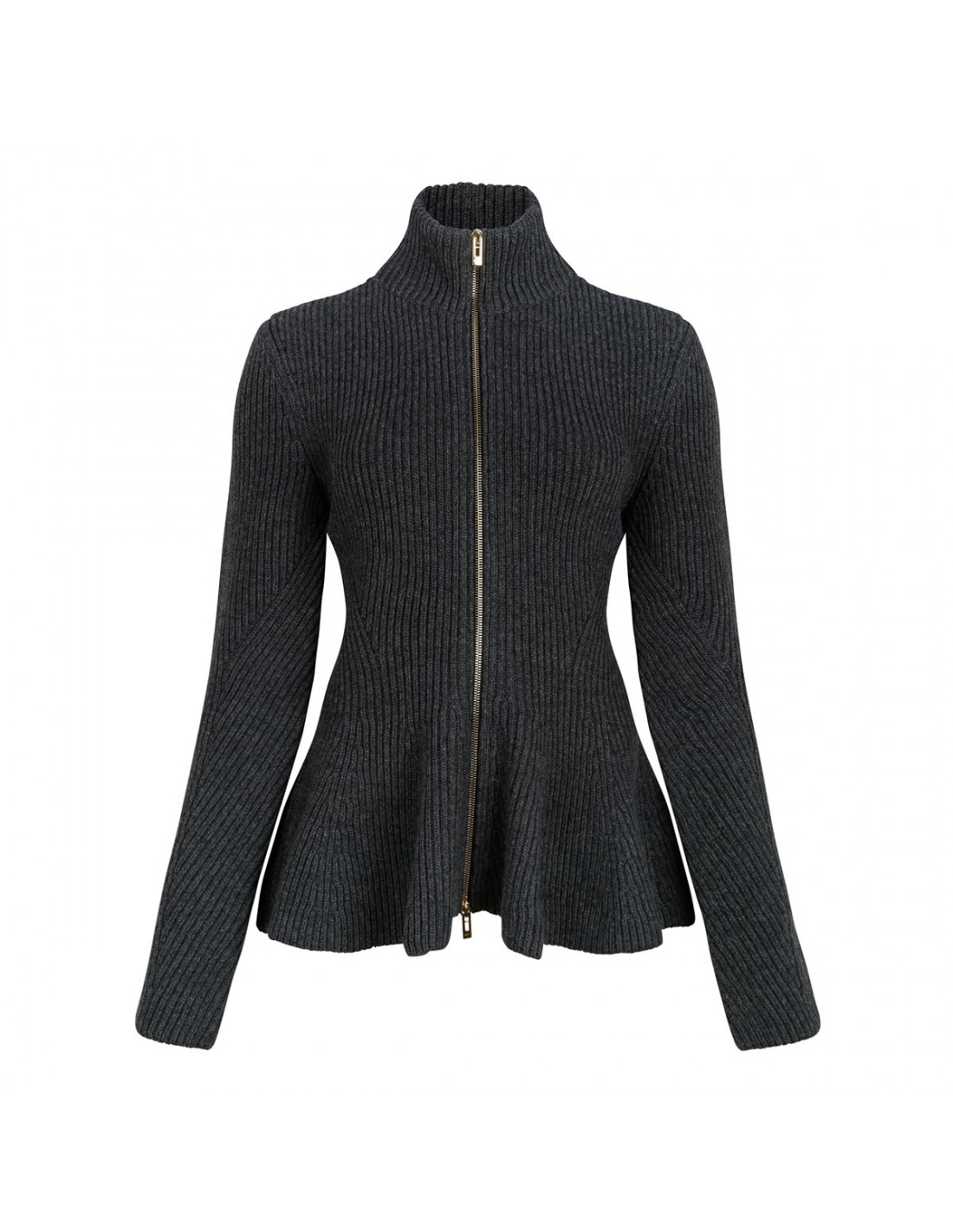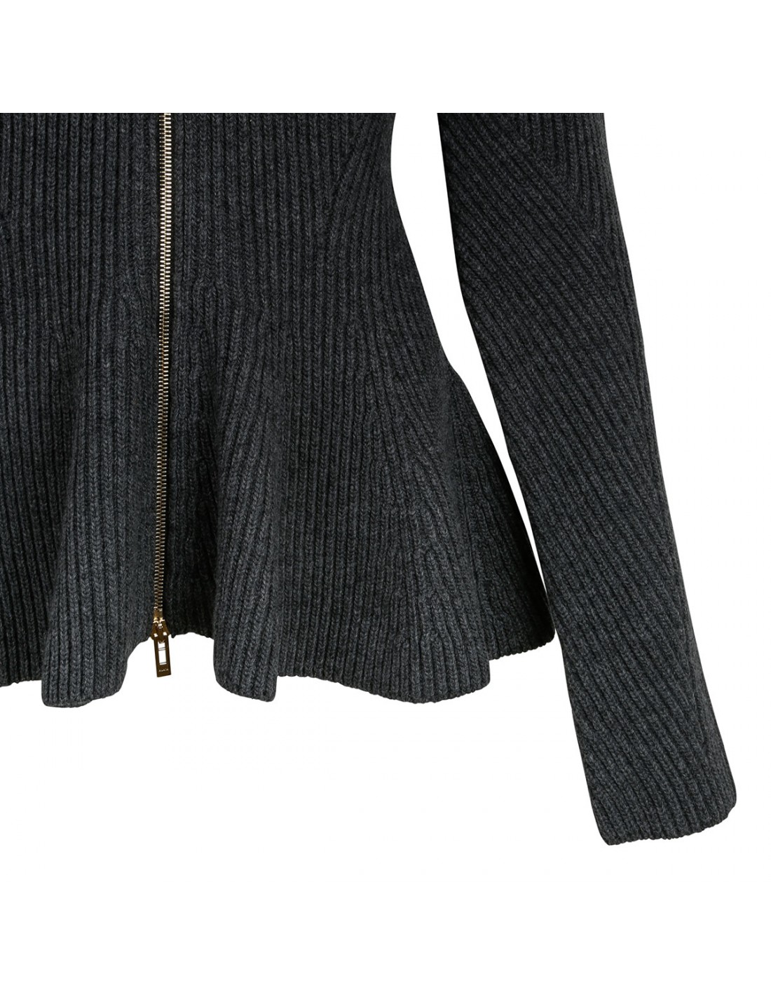 Dark gray knitted cashmere and wool cardigan from Alaia featuring peplum hem, high neck, long sleeves, zip fastening and fitted silhouette.