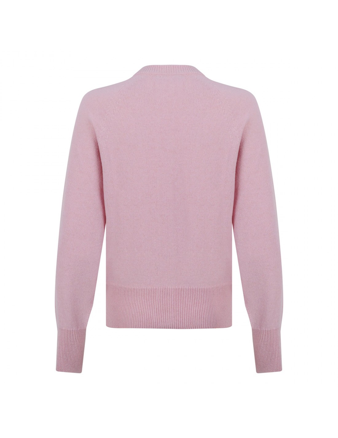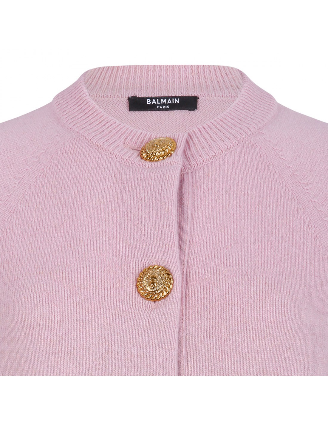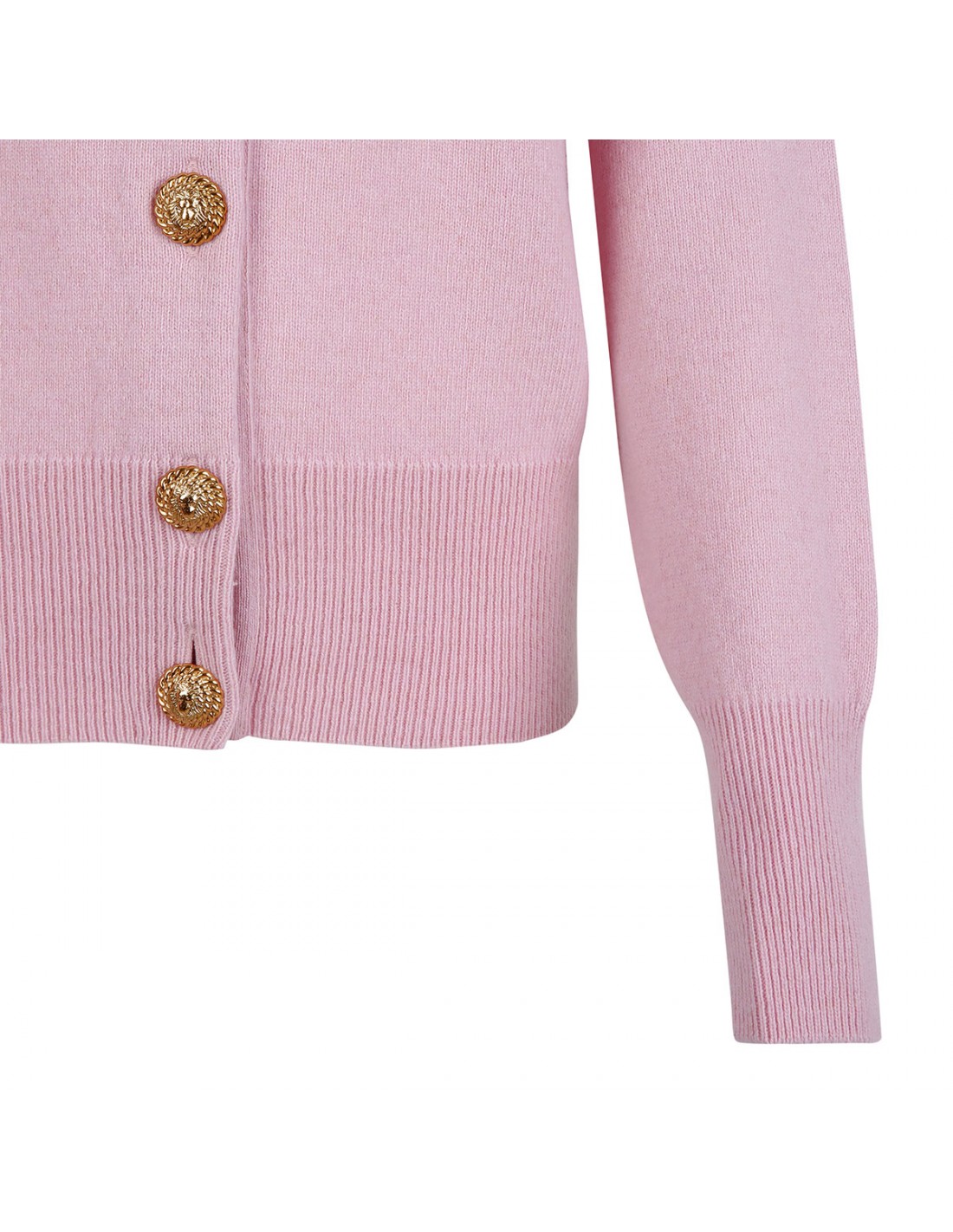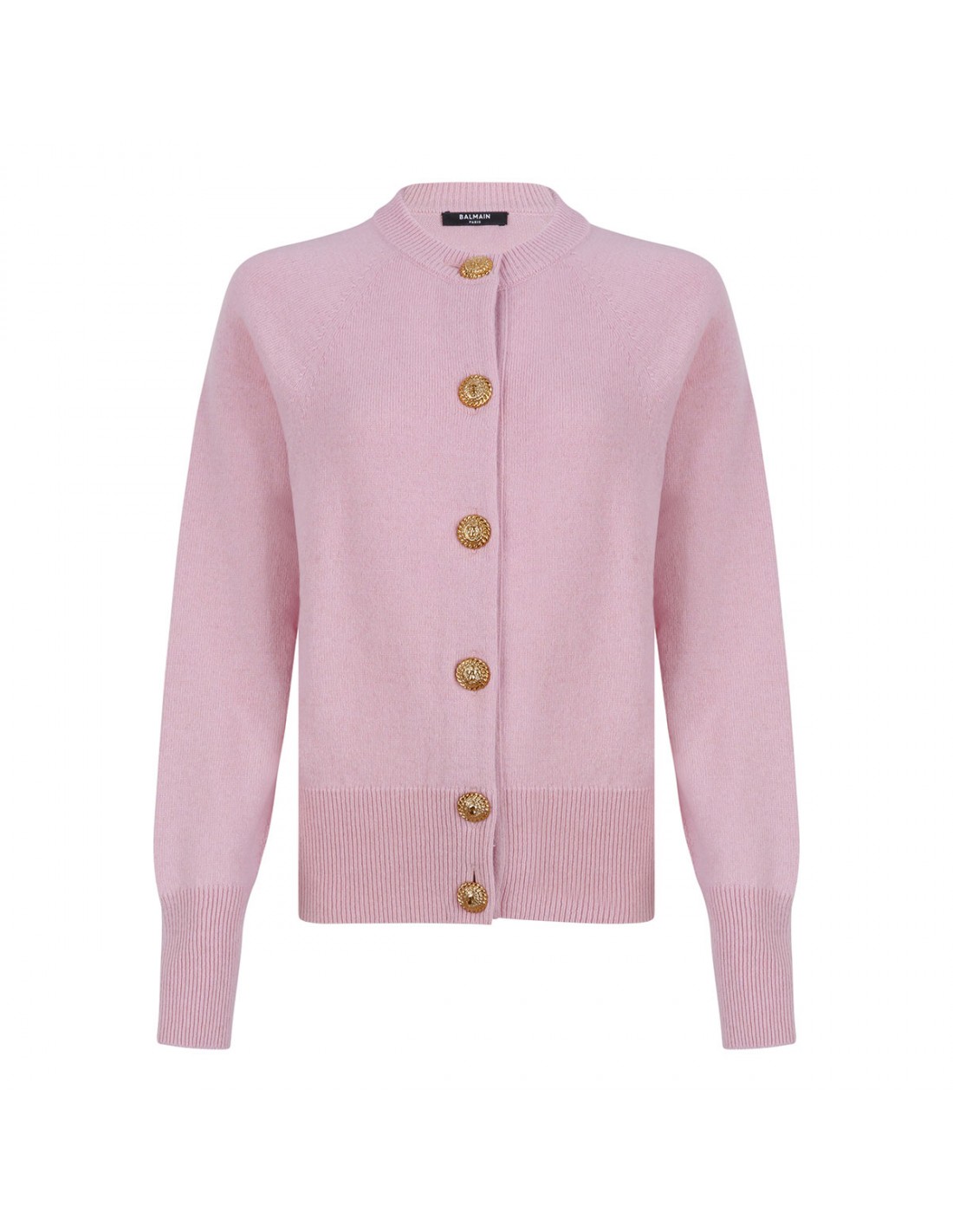 Pink eco-cashmere cardigan from Balmain featuring lion head embossed button fastening, round neck, long raglan sleeves, ribbed-knit edges.