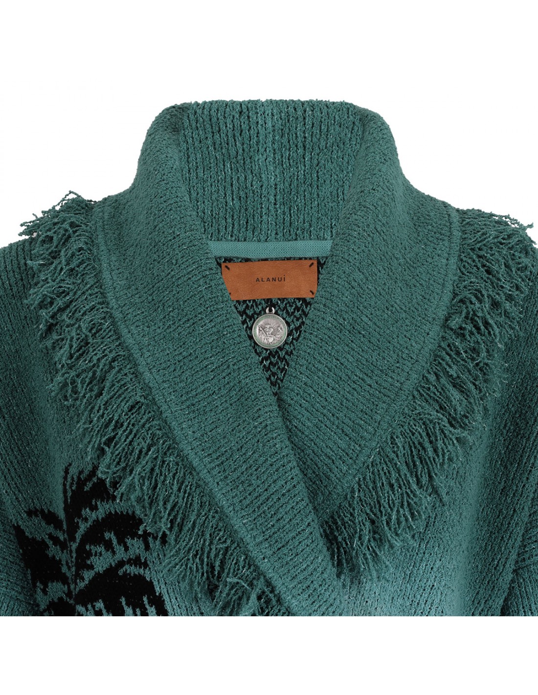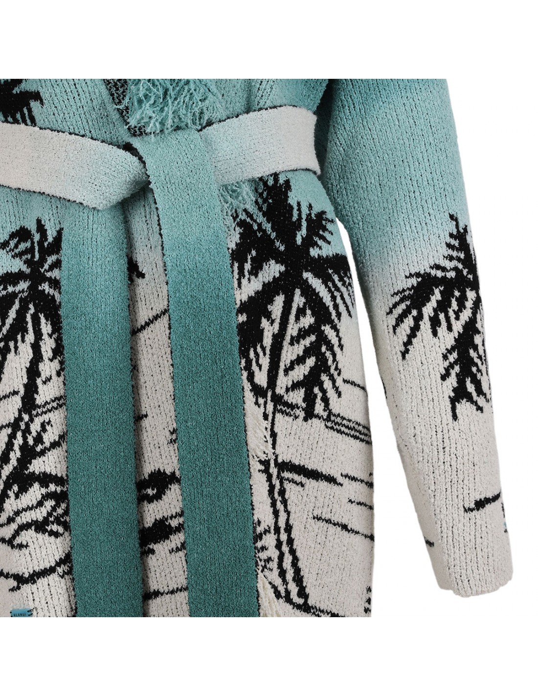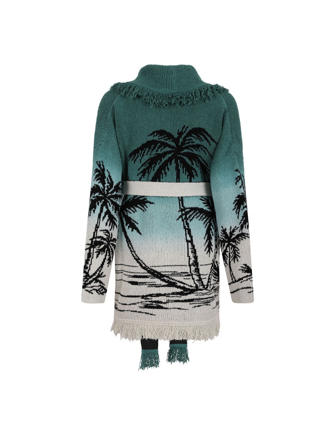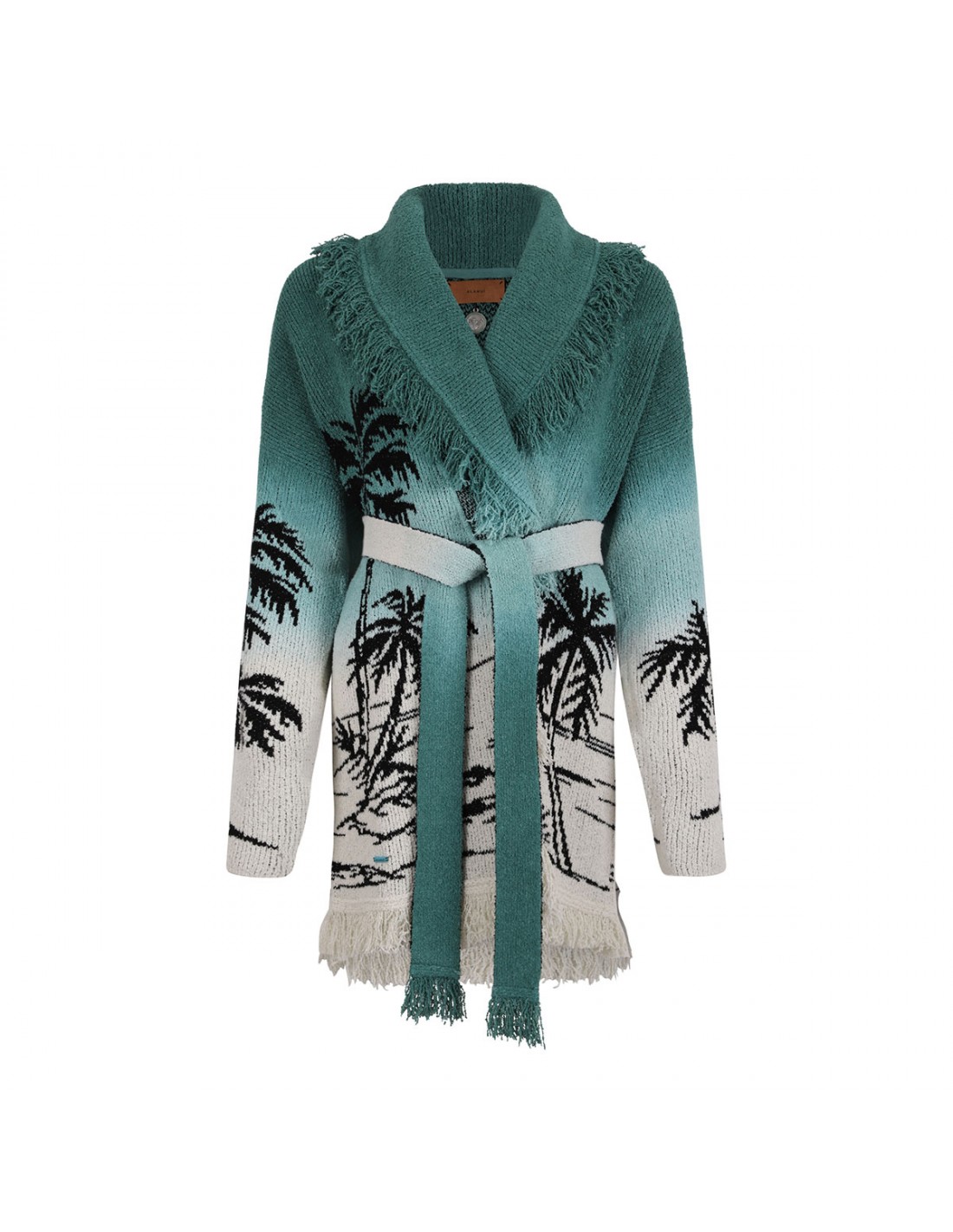 Green tide and chalk cotton blend Icon cardigan from Alanui featuring Wave bloom motif, original Icon fit, matching self-tie belt at waist, shawl collar, gradient dye, fringed edges, long sleeves, dropped shoulders.