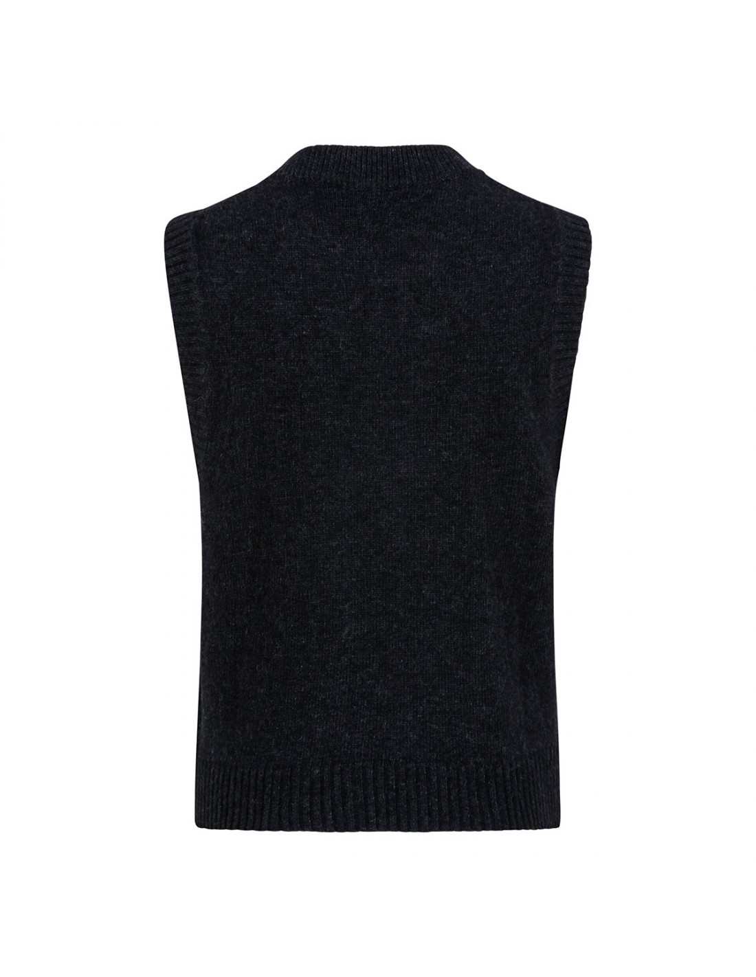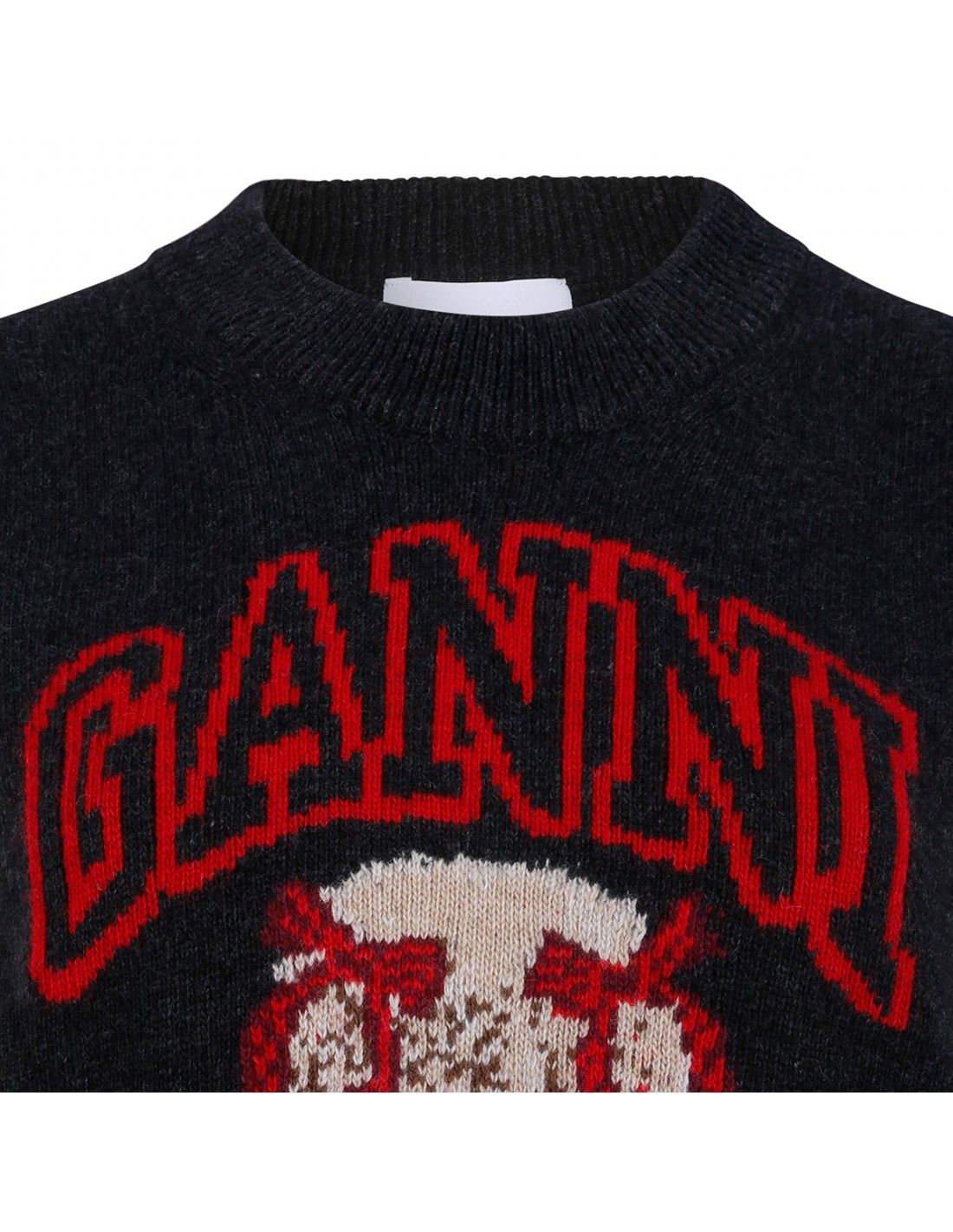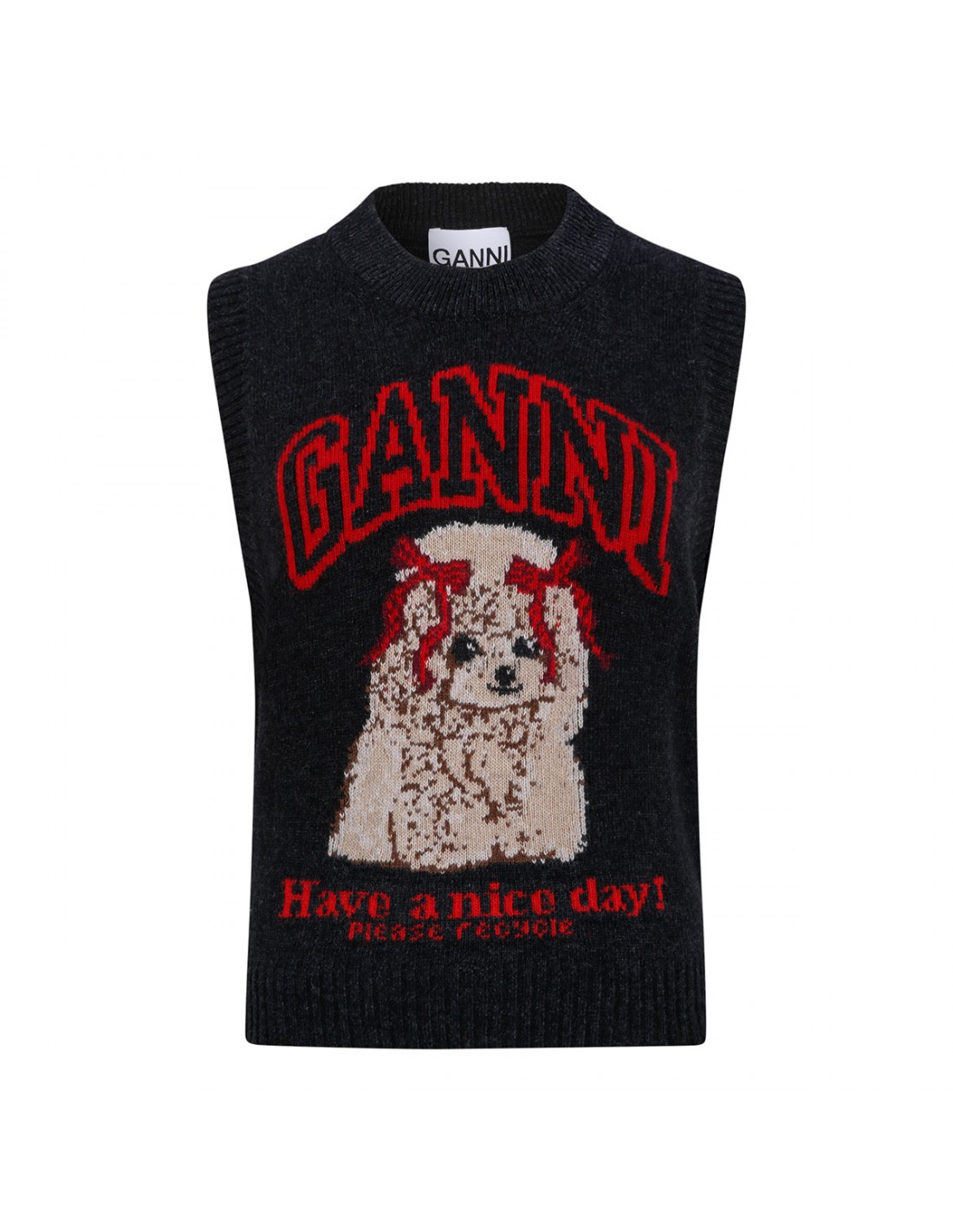 Black knit wool blend vest from Ganni featuring print graphic, logo, round neckline, sleeveless design, ribbed edges.