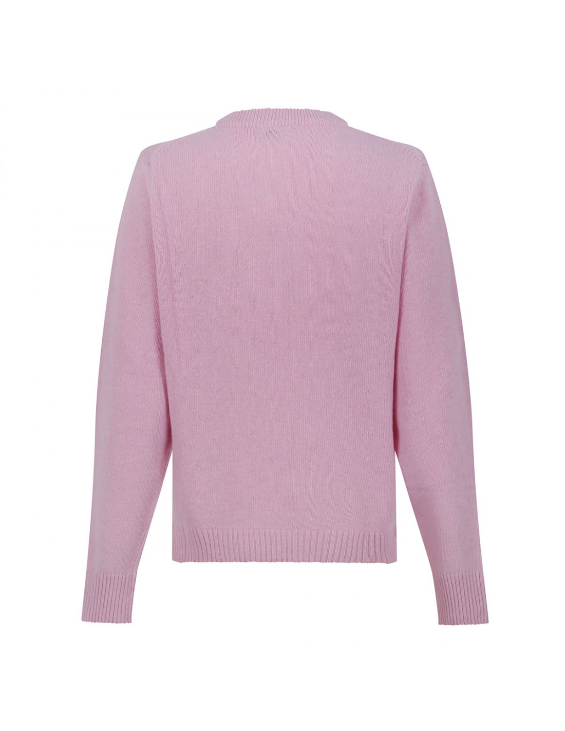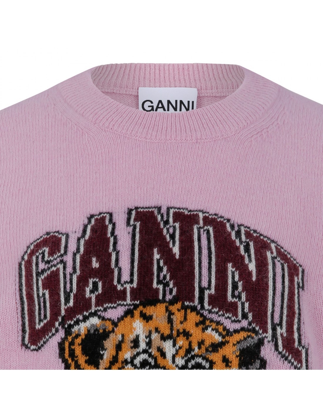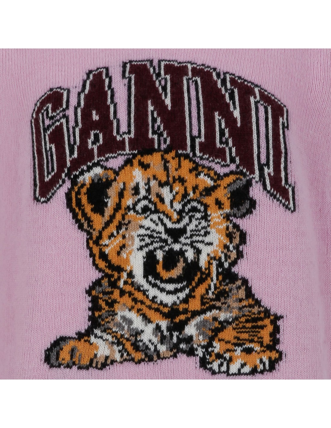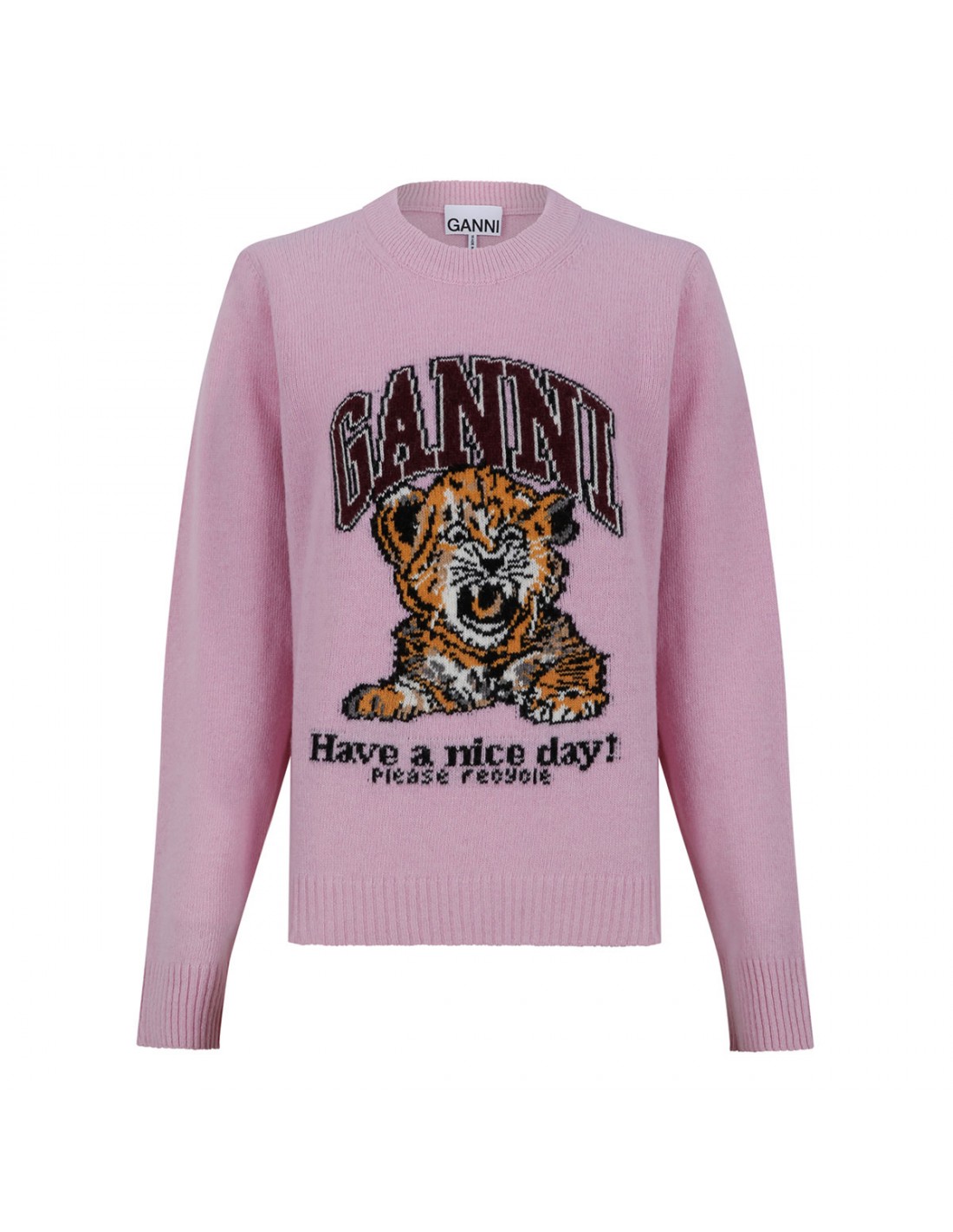 Pink knit wool blend sweater from Ganni featuring Have a nice day! Please recycle message, tiger and logo graphic, round neckline, long sleeves, ribbed-knit edges.