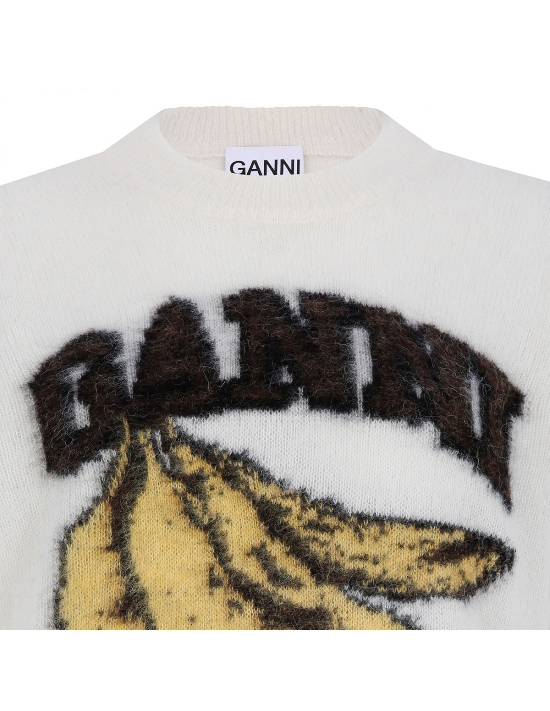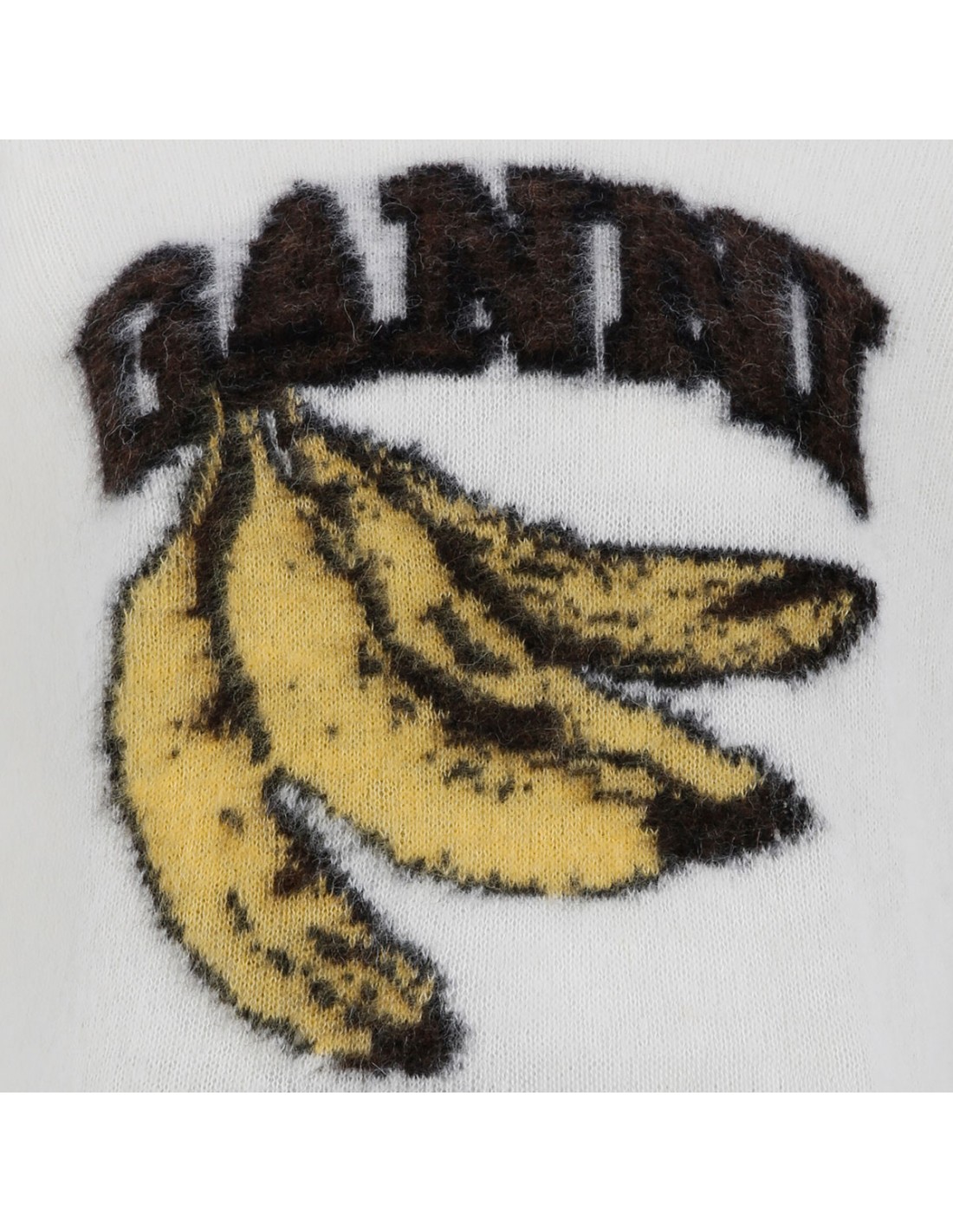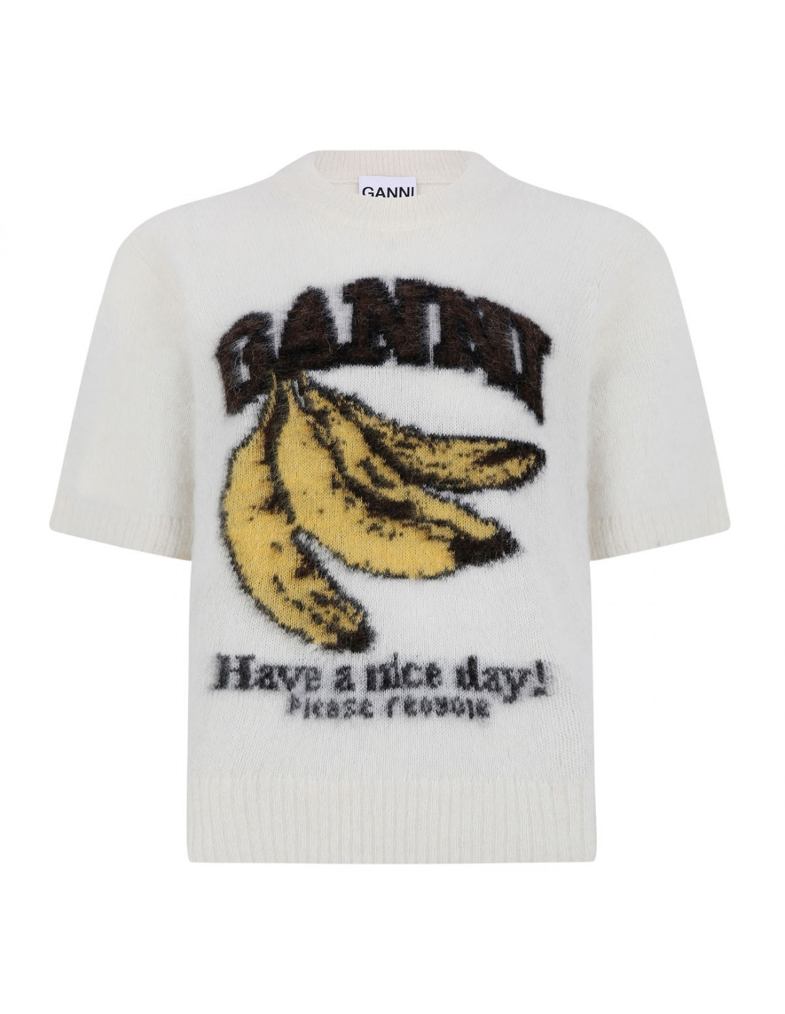 White brushed alpaca T-shirt from Ganni featuring Have a nice day! Please recycle message, banana and logo graphic, round neckline, short sleeves, ribbed-knit edges.