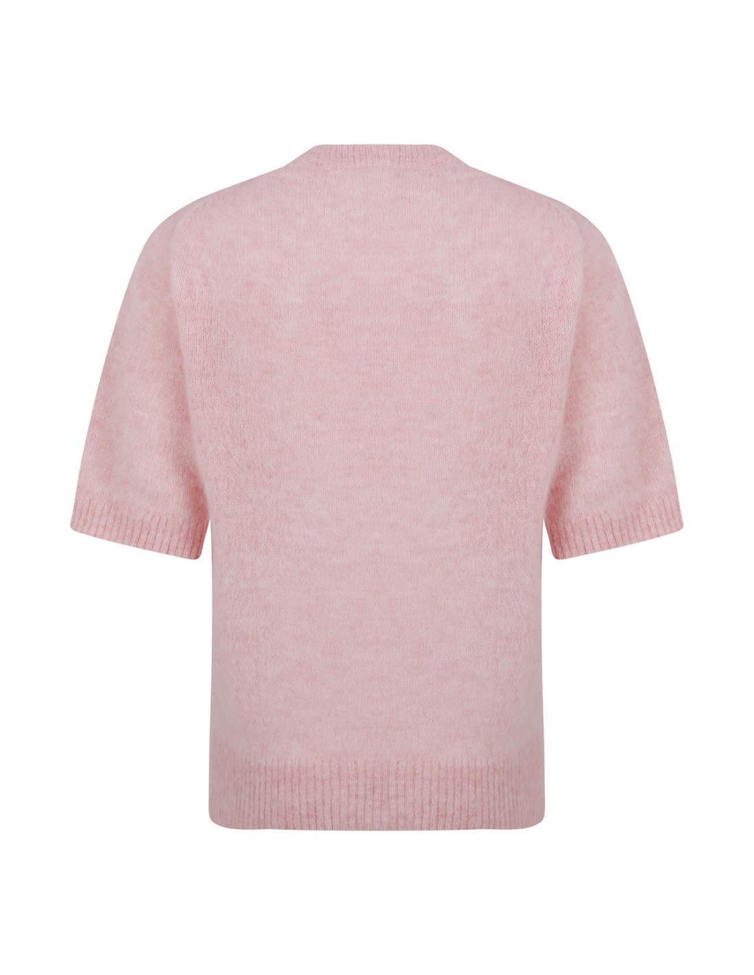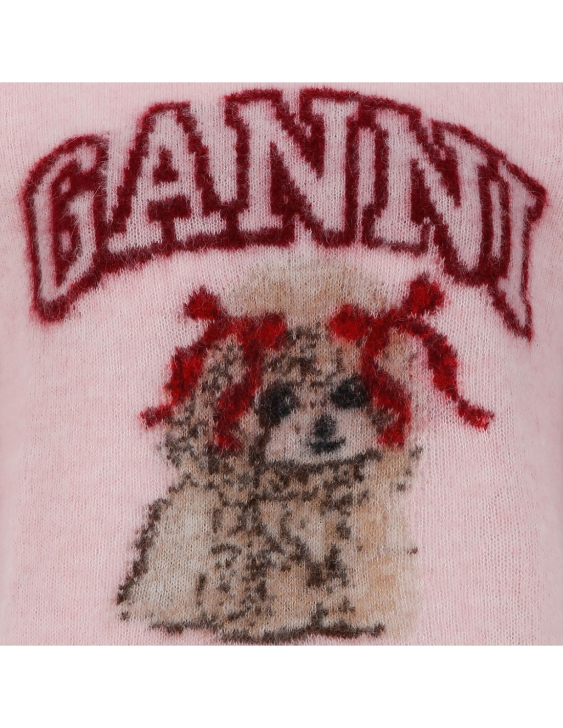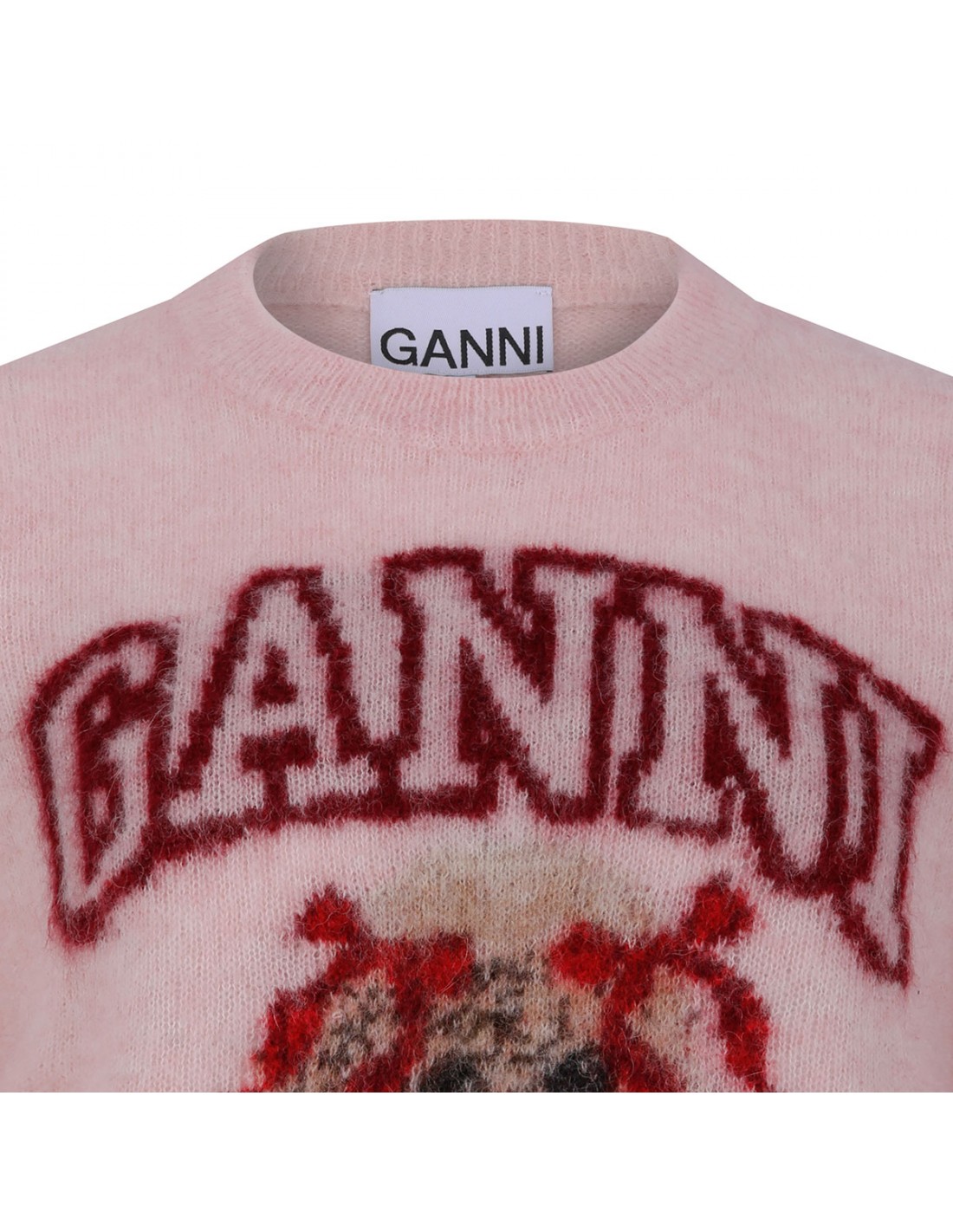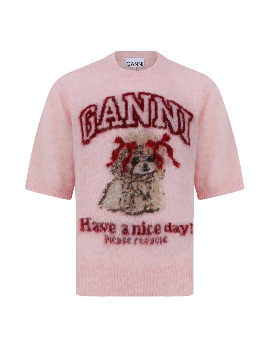 Pink brushed alpaca T-shirt from Ganni featuring Have a nice day! Please recycle message, puppy and logo graphic, round neckline, short sleeves, ribbed-knit edges.