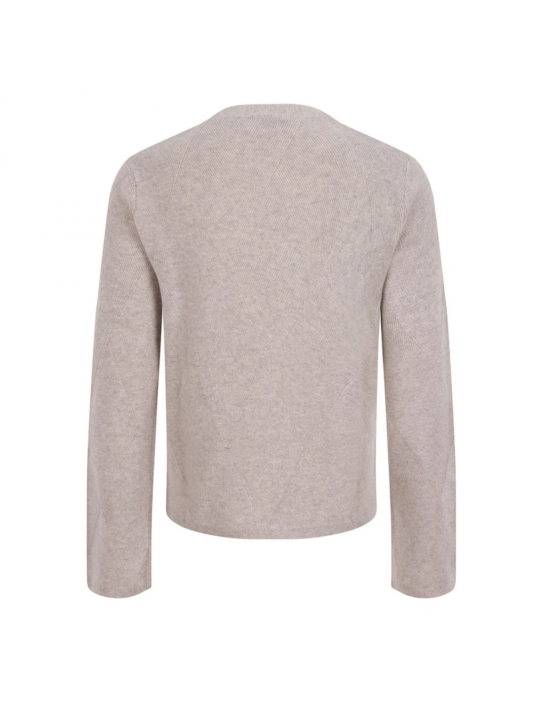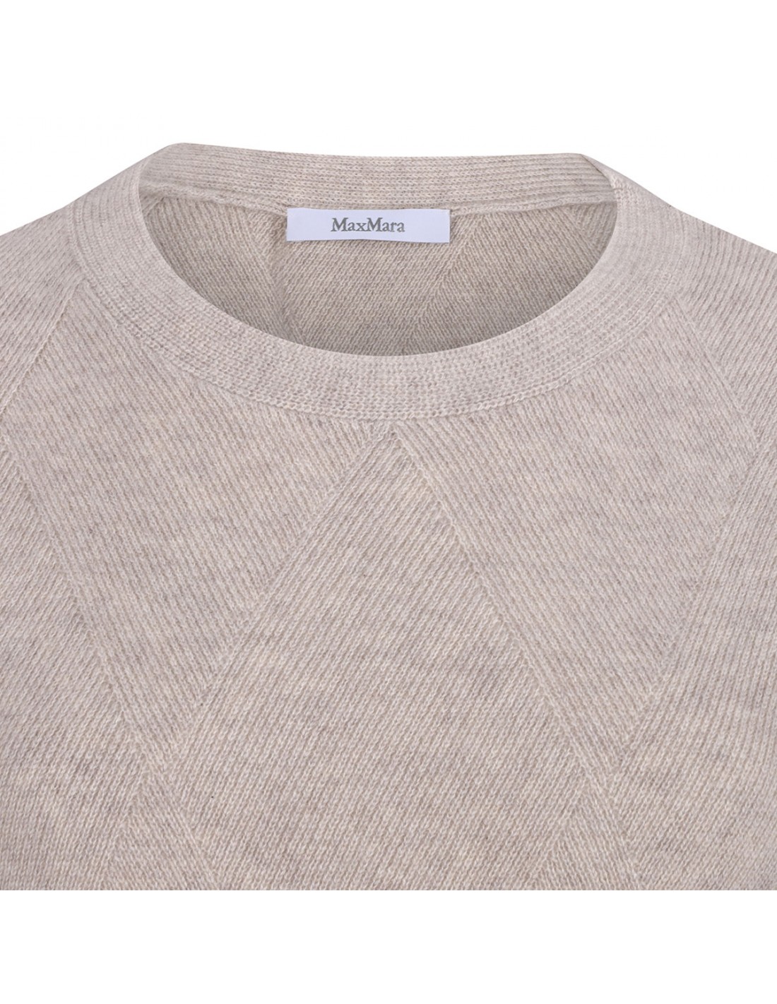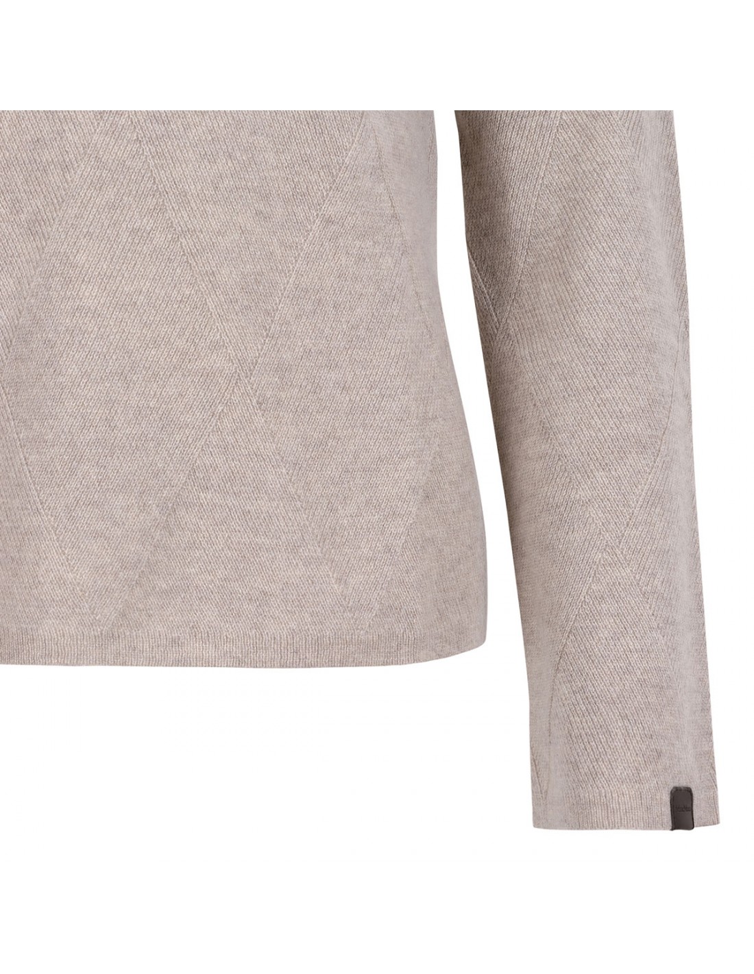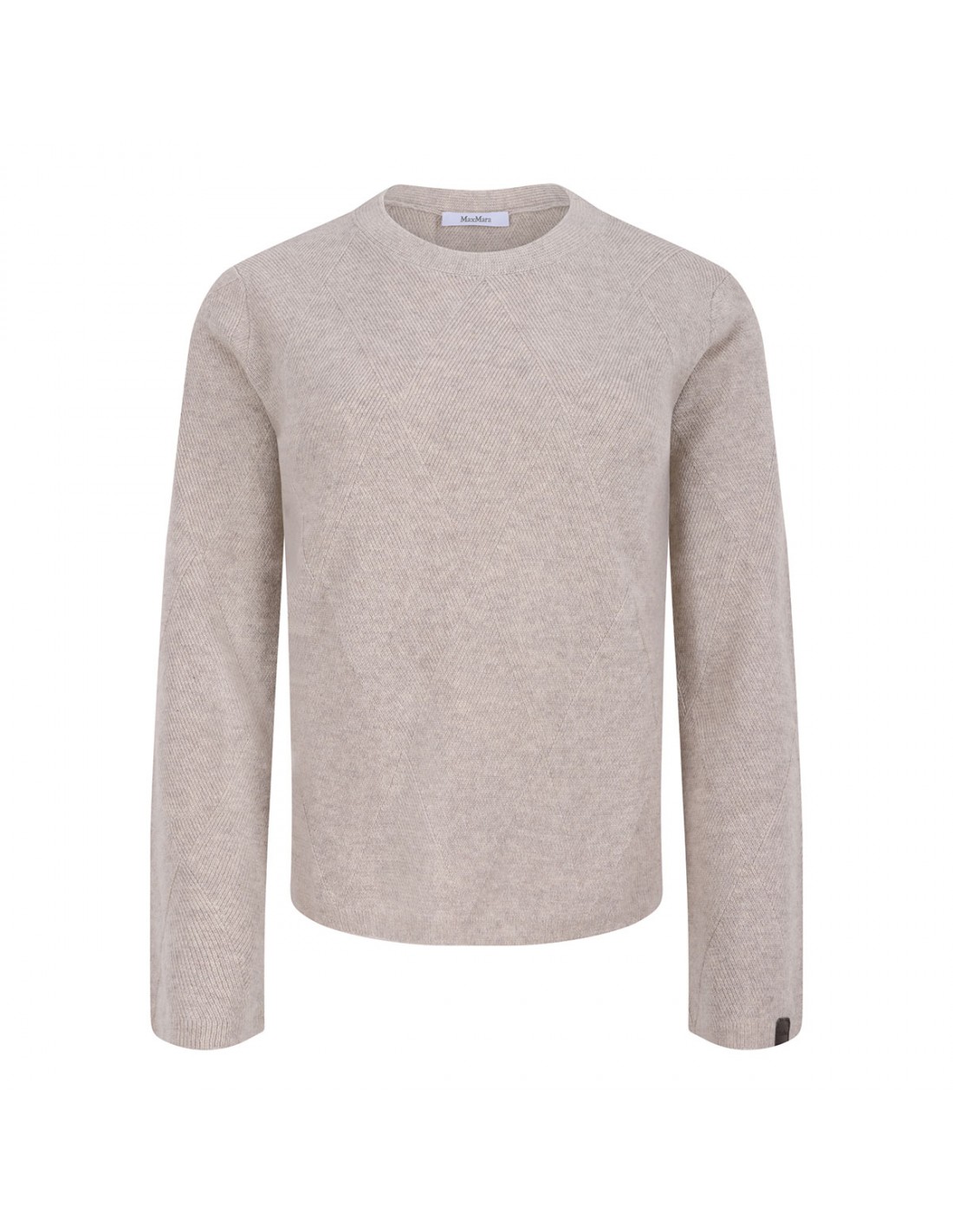 Beige cashmere Baffo sweater from Max Mara featuring argyle diamond pattern, classic crewneck, long sleeves, ribbed knit edges.