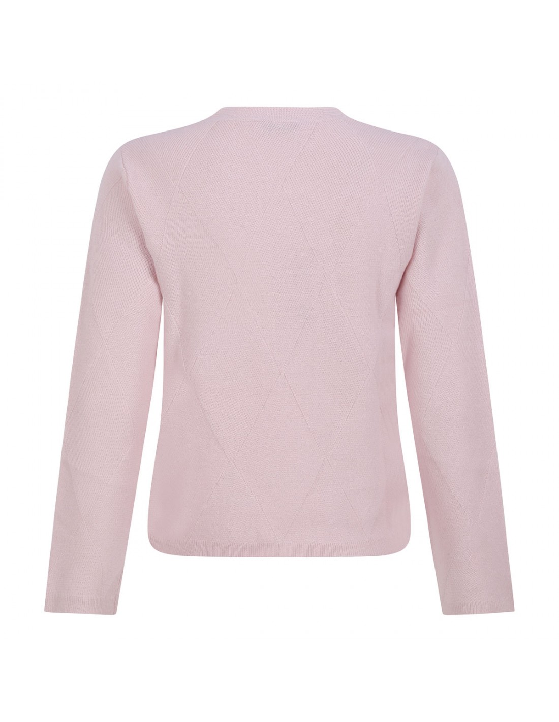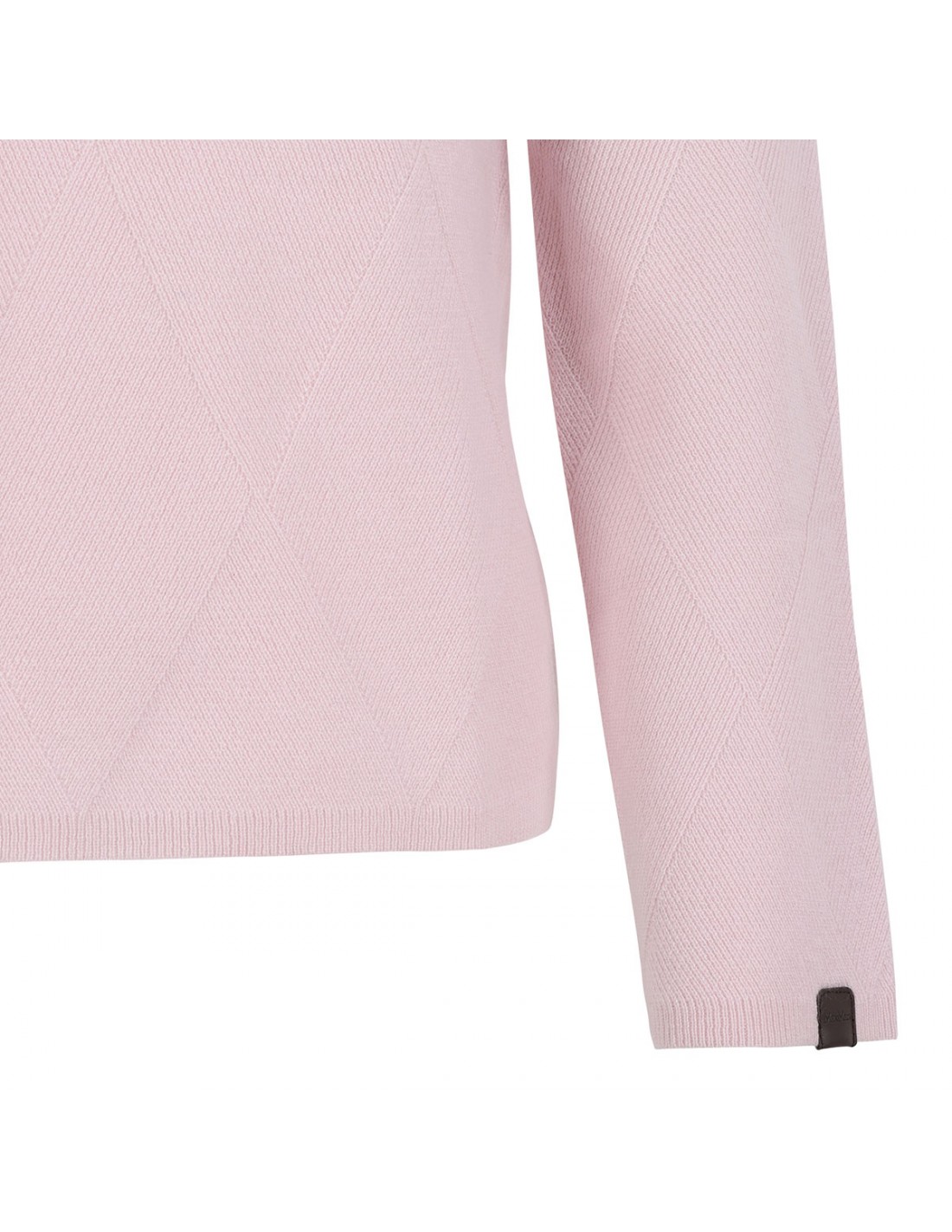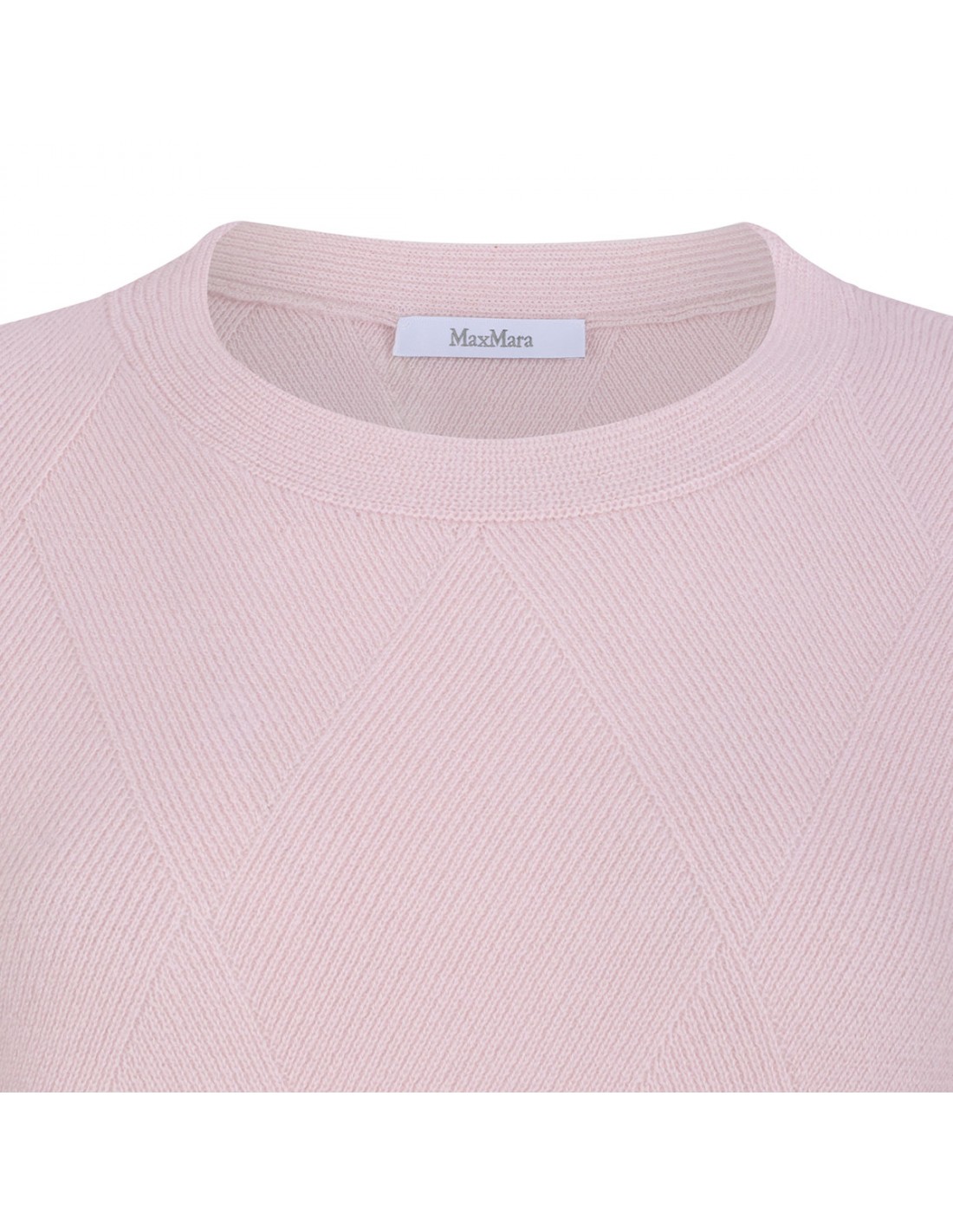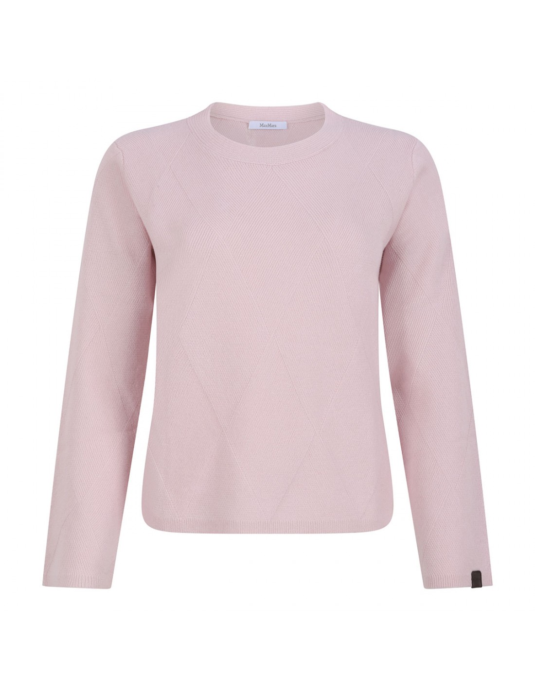 Pink cashmere Baffo sweater from Max Mara featuring argyle diamond pattern, classic crewneck, long sleeves, ribbed knit edges.