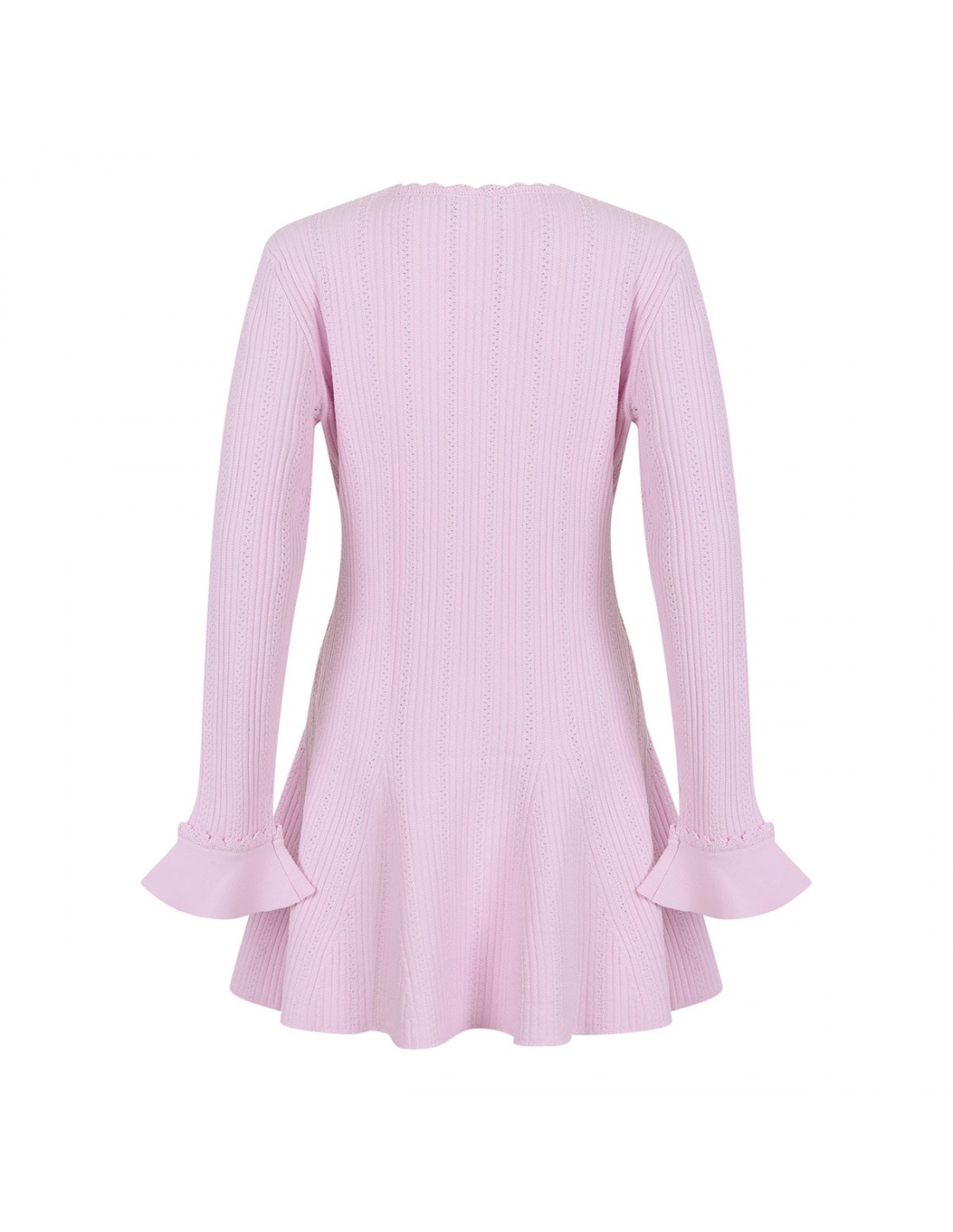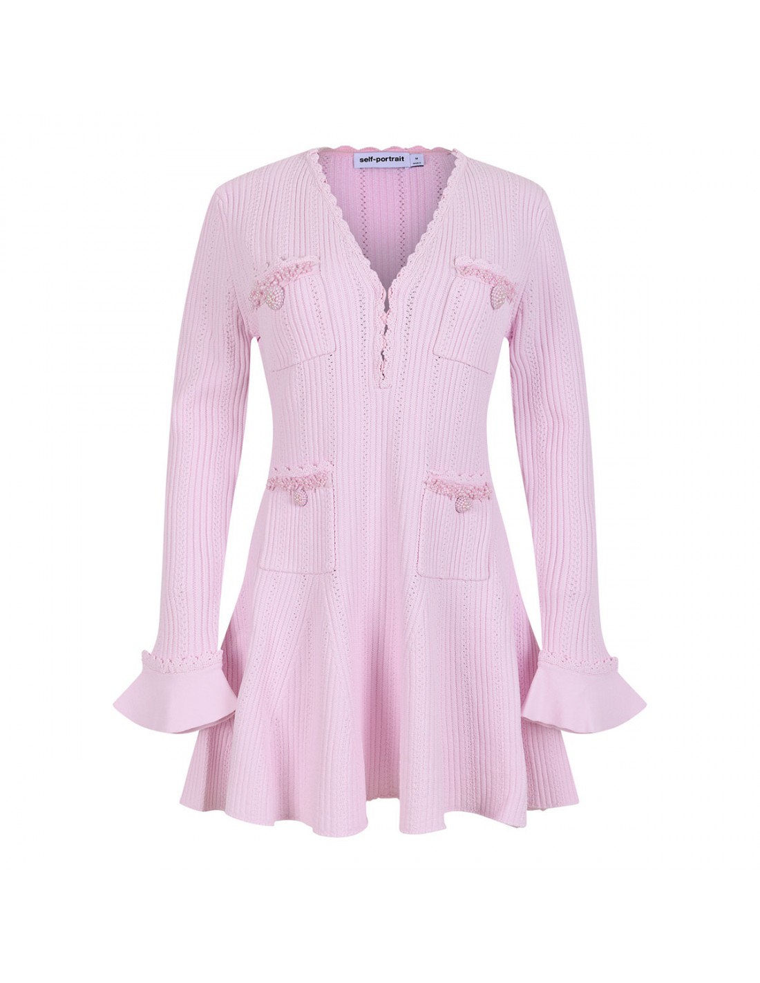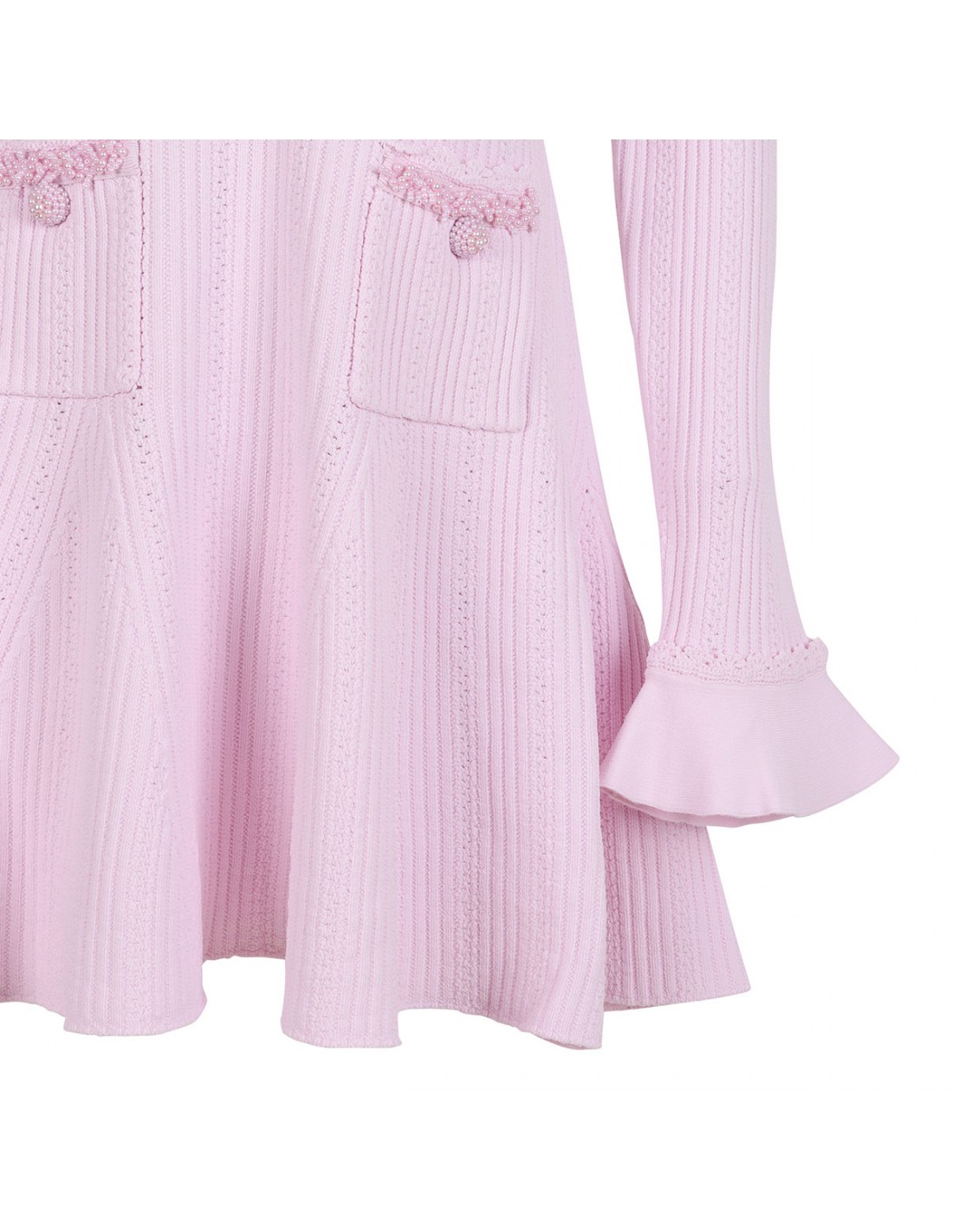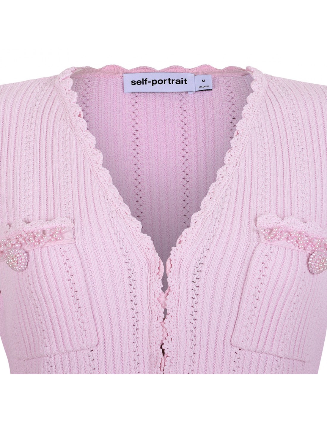 Pink pointelle knit cardigan from Self-Portrait featuring sculpted fit, button closure along front, pearl trims, V-neck, flared skirt, functional pockets, long sleeves.