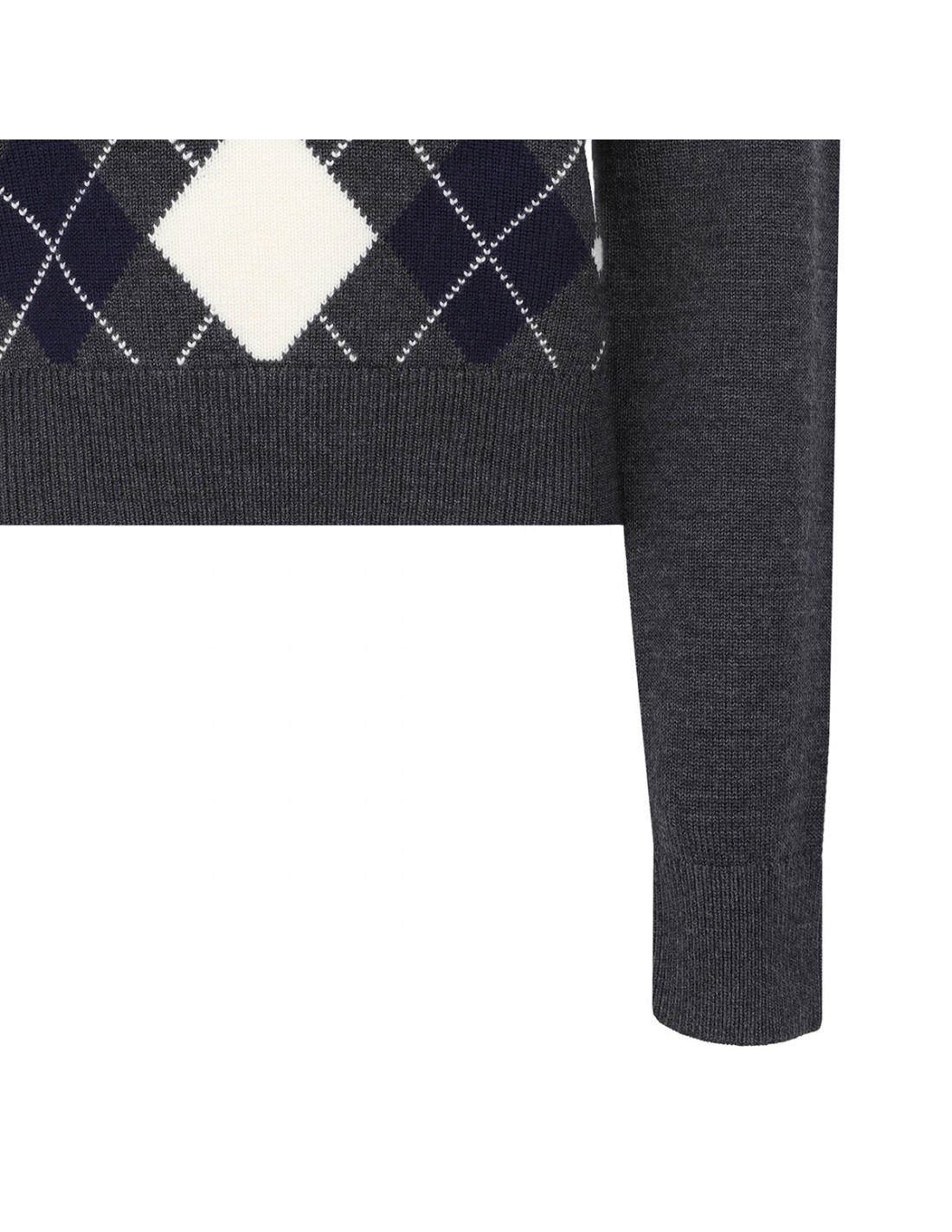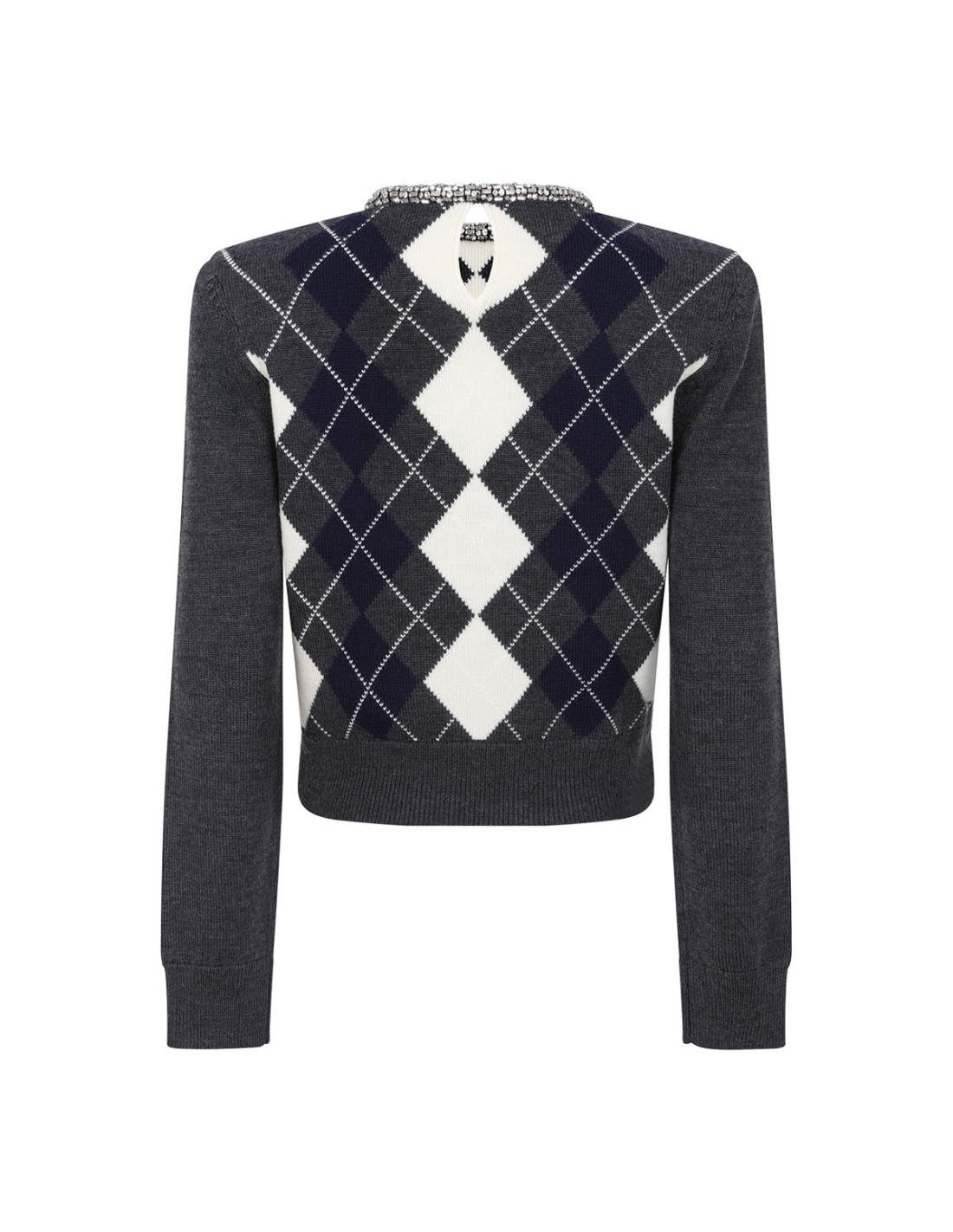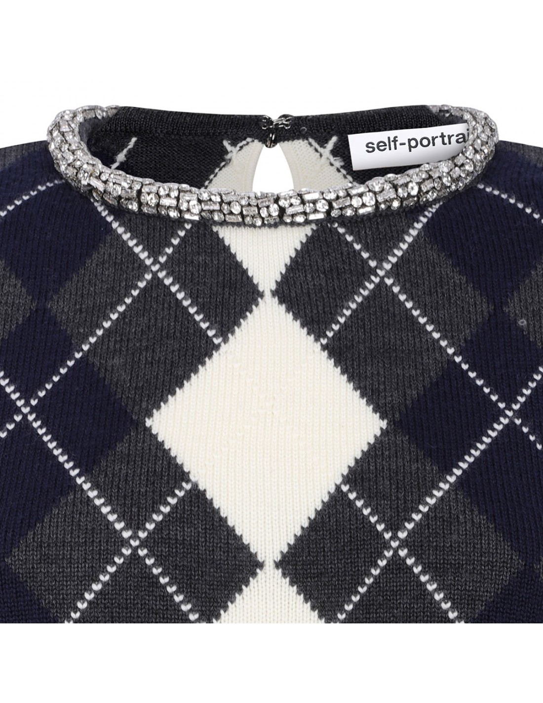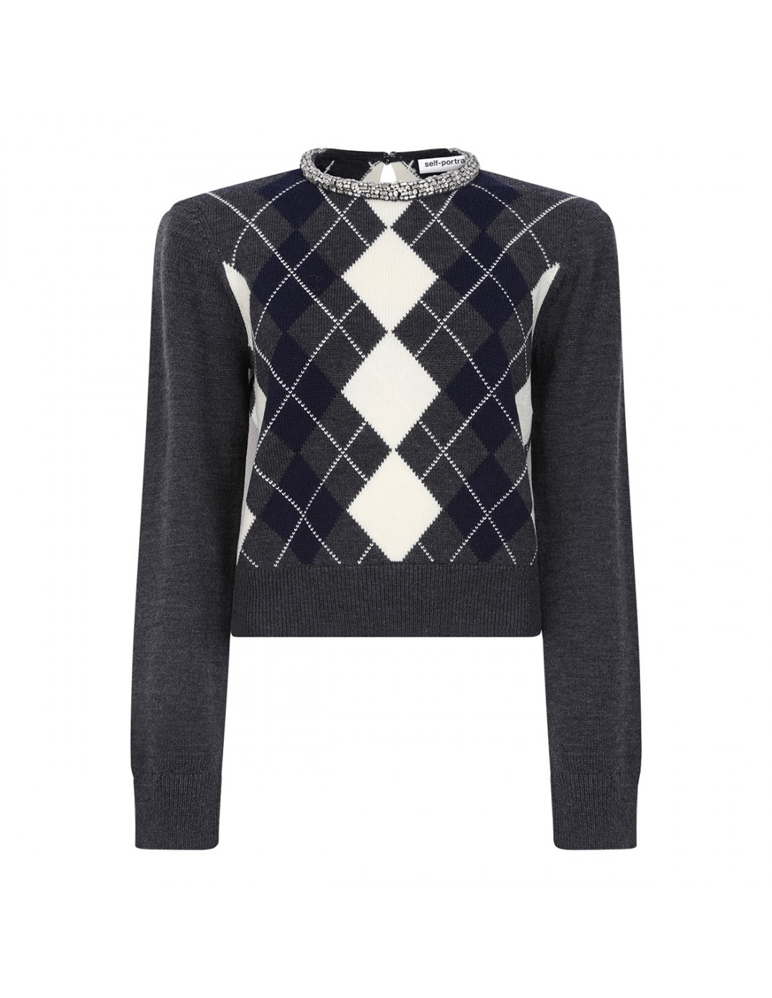 Gray, white and black wool sweater from Self-Portrait featuring argyle knit motif, crystal trims, relaxed fit, crew collar, long sleeves, back keyhole with button, ribbed-knit trims.