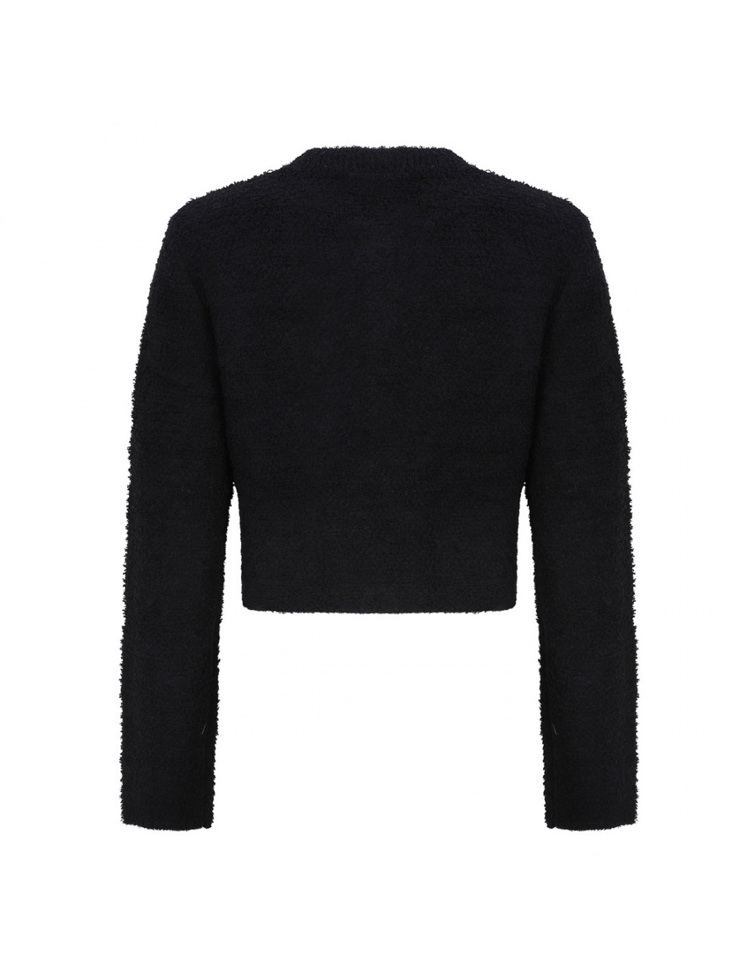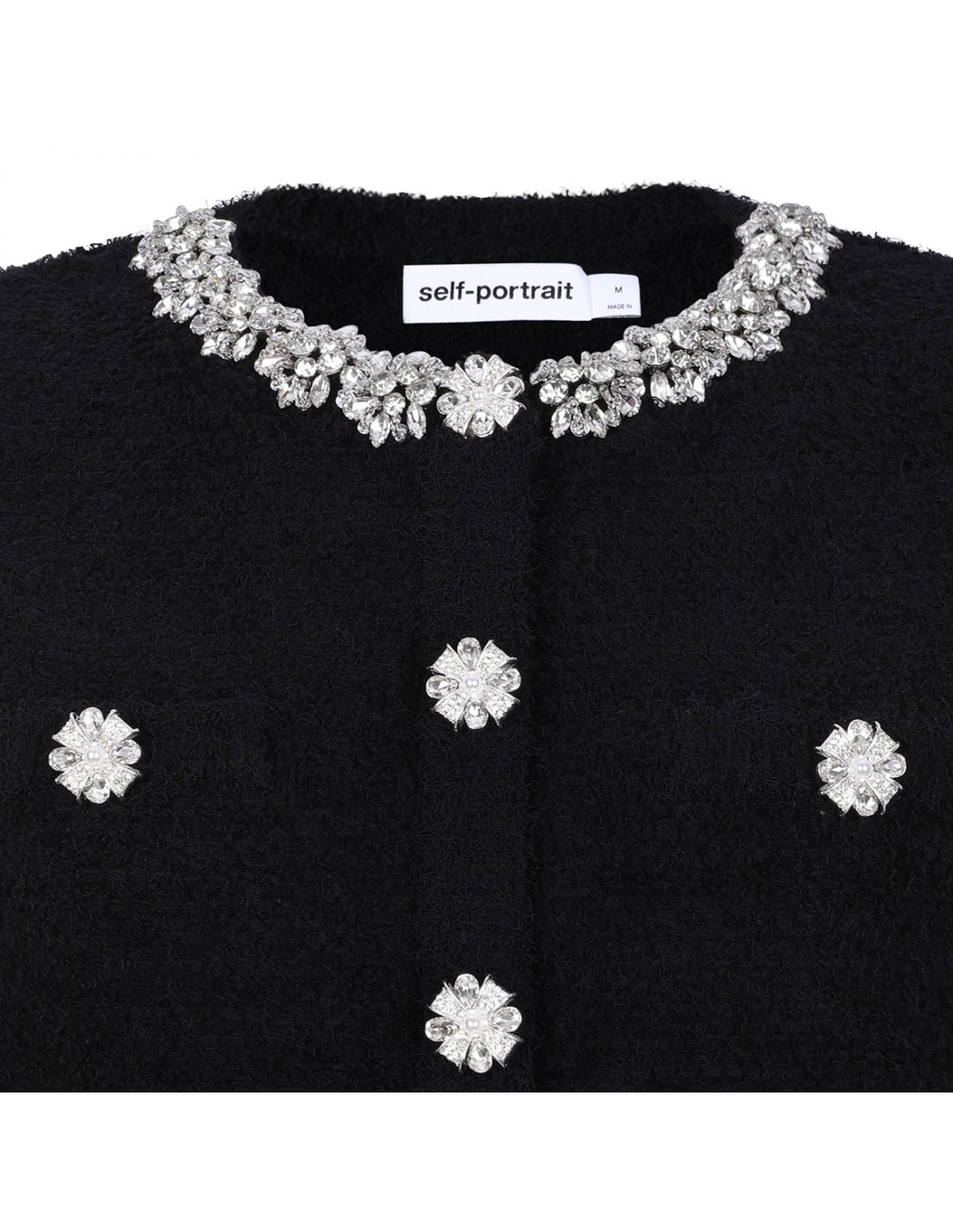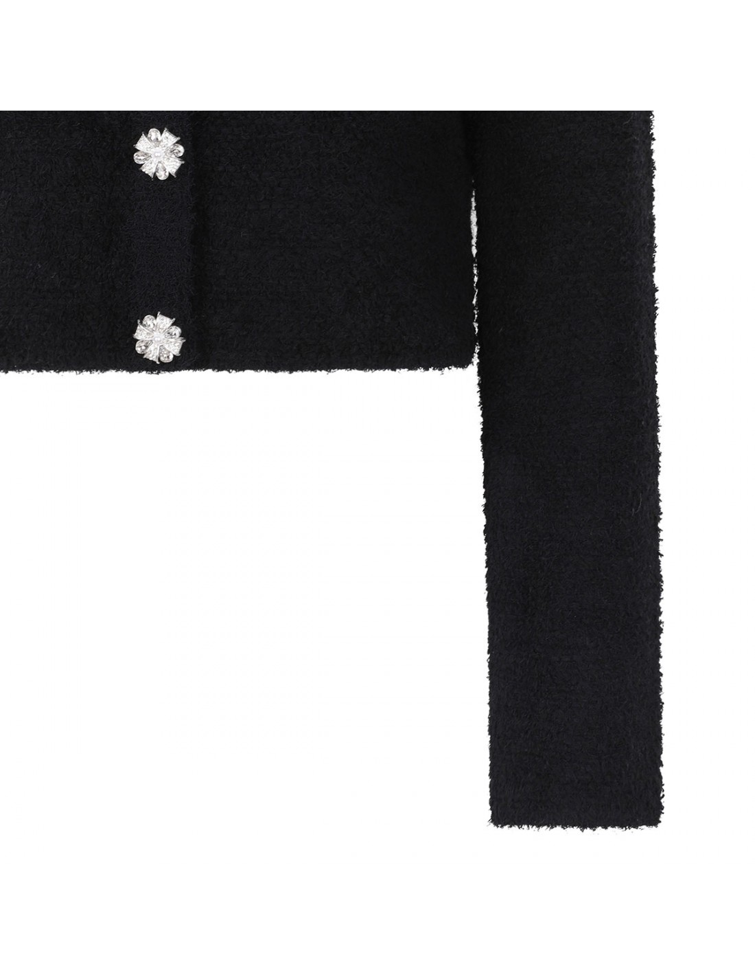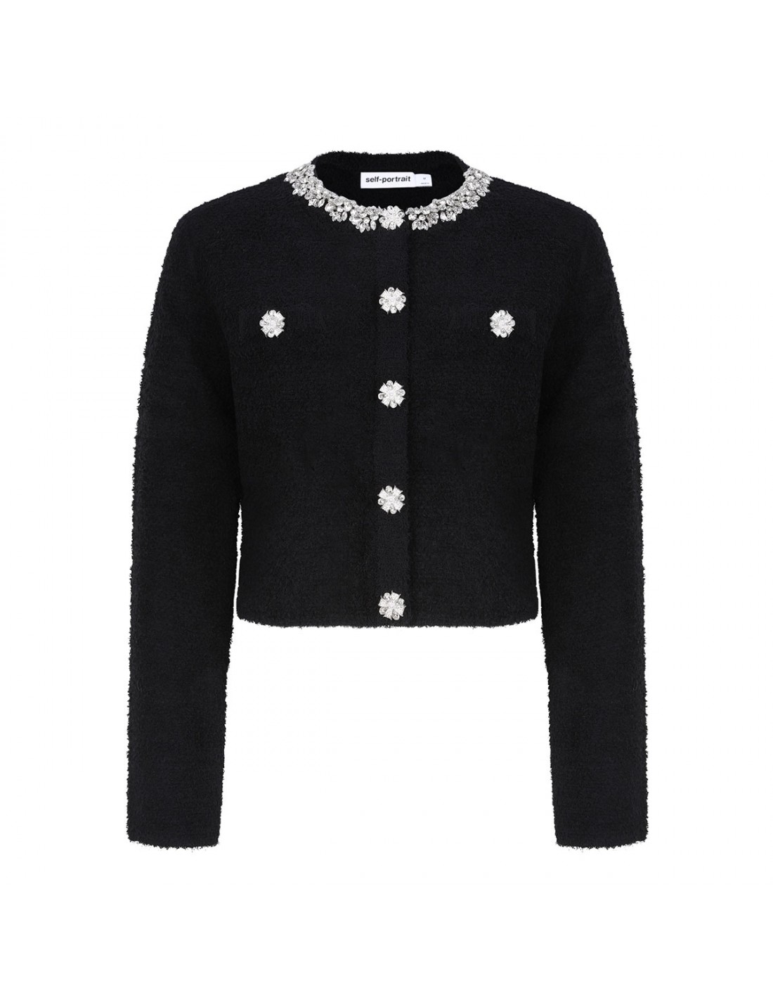 Black knit cardigan from Self-Portrait featuring cropped silhouette, crew collar, long sleeves, snap button popper closure, crystal trims and buttons.