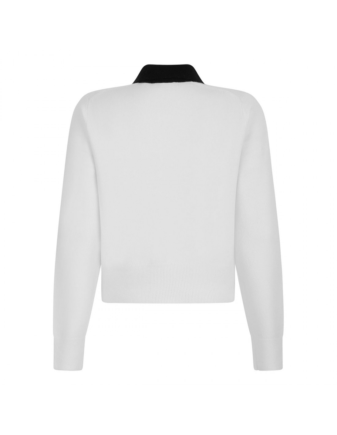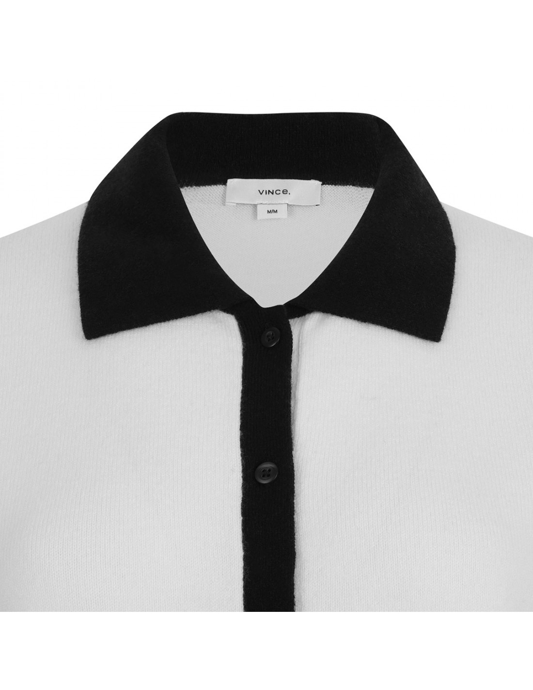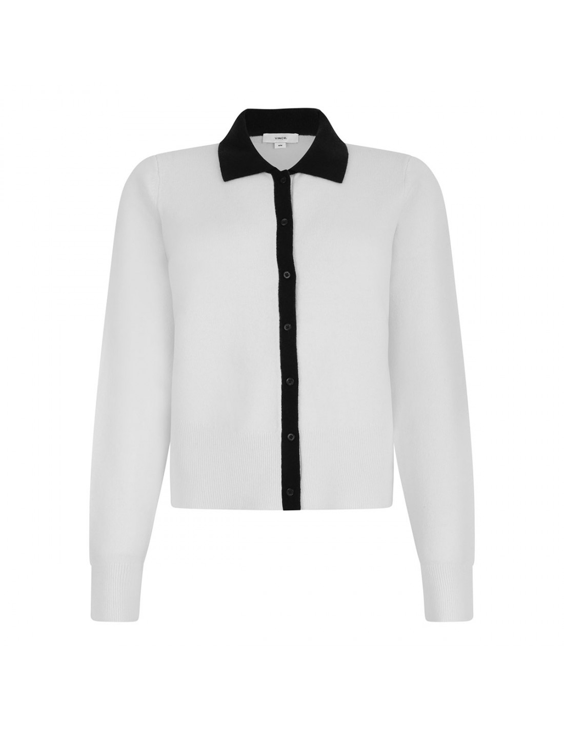 Off-white and coastal blue wool and cashmere-blend cardigan from Vince featuring contrasting trims, pointed collar, long sleeves, button closure on front, ribbed-knit edges.