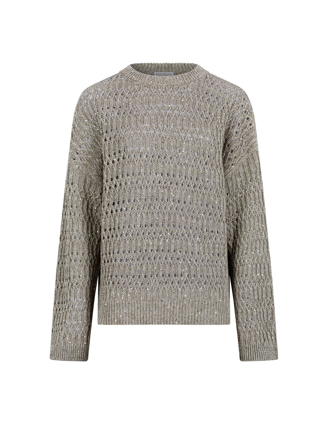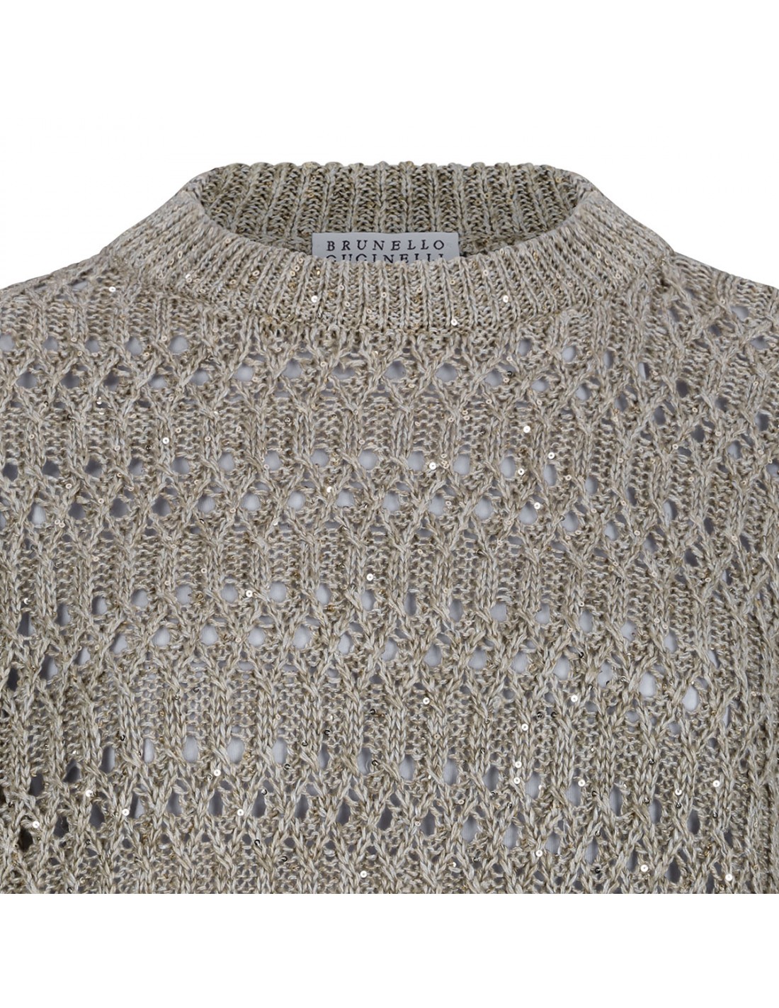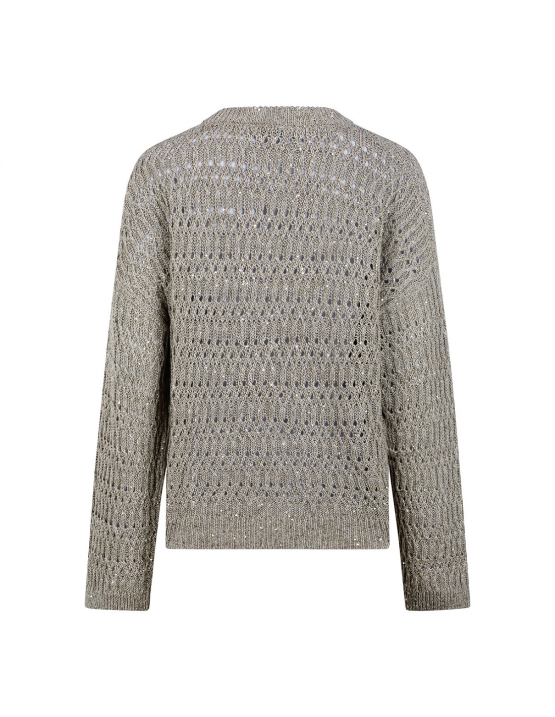 Taupe open knit linen blend sweater from Brunello Cucinelli featuring sequins detail allover, crew collar, long sleeves, ribbed-knit edges.