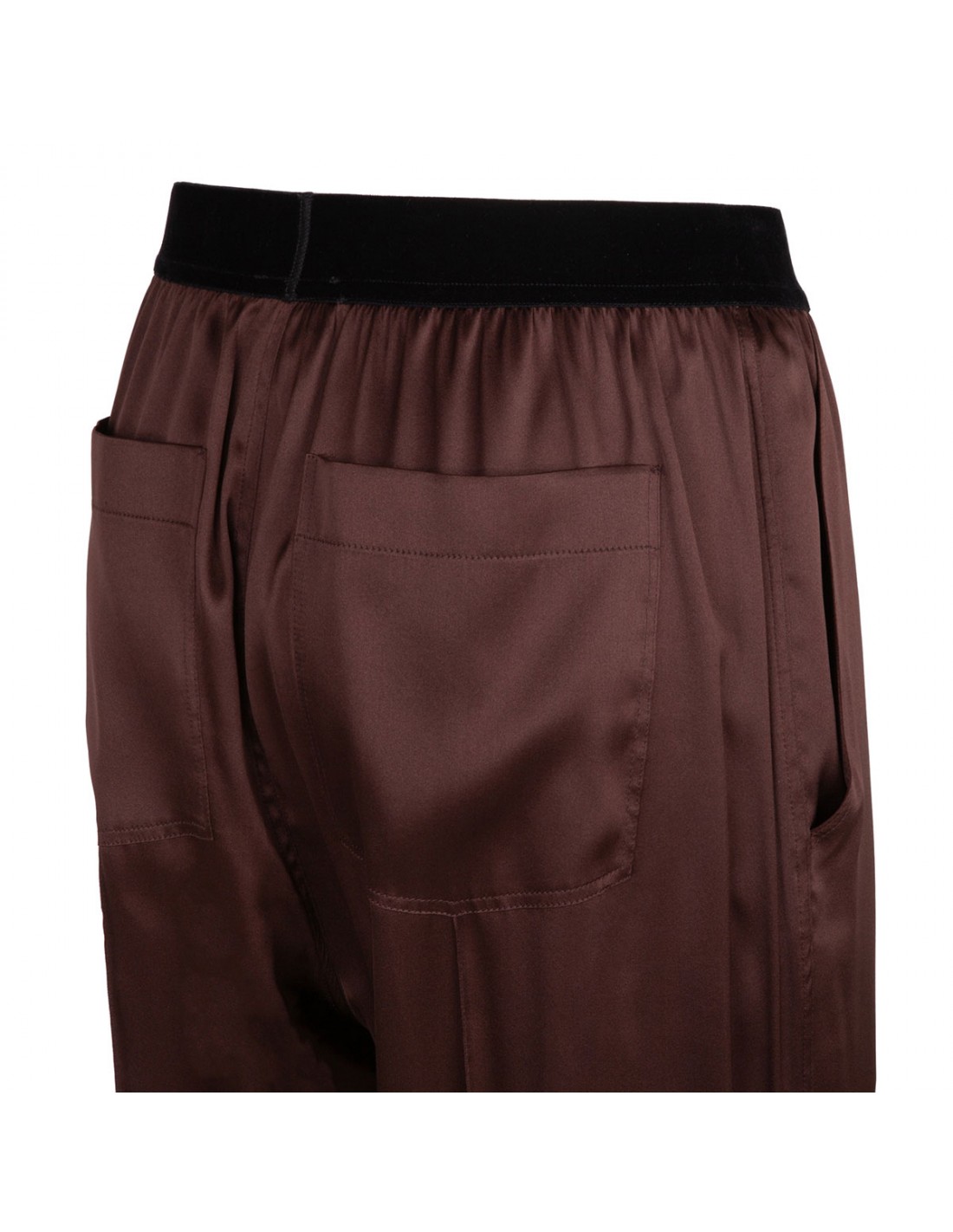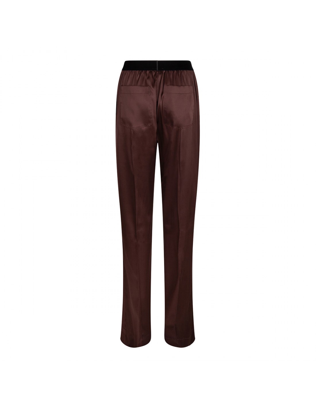 Dark brown slightly stretch silk satin pants from Tom Ford featuring straight leg, elastic waist with logo jacquard, side and back pockets.