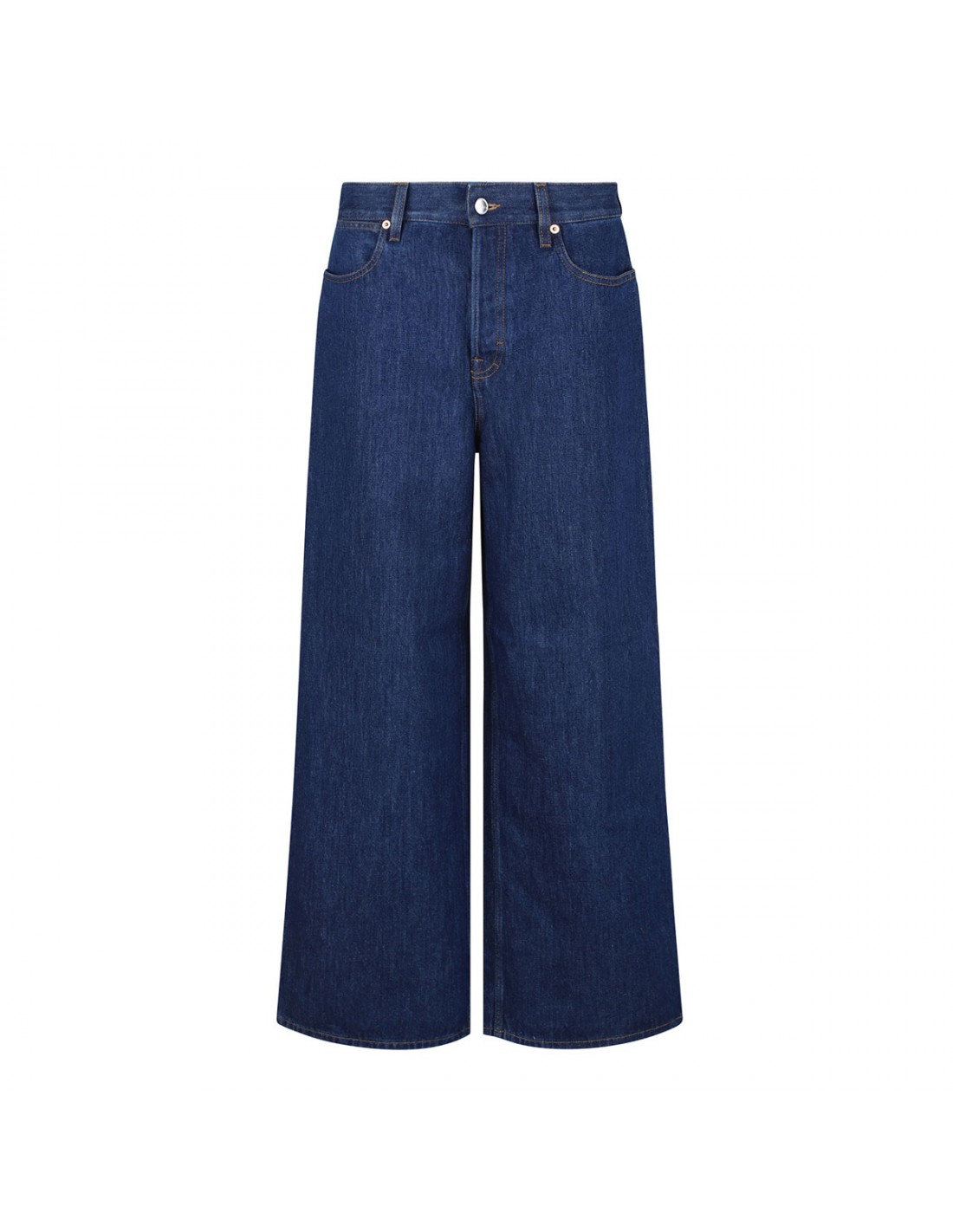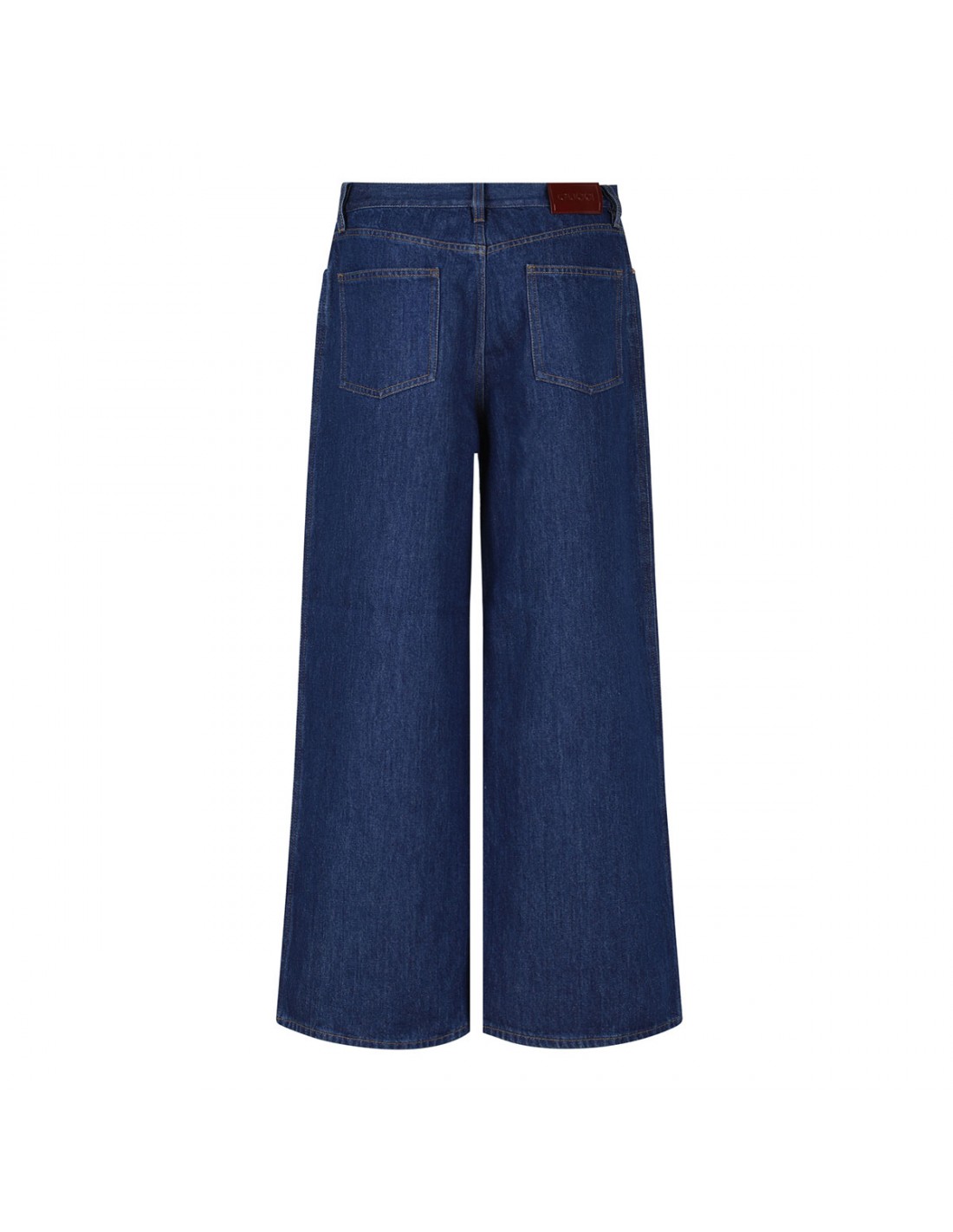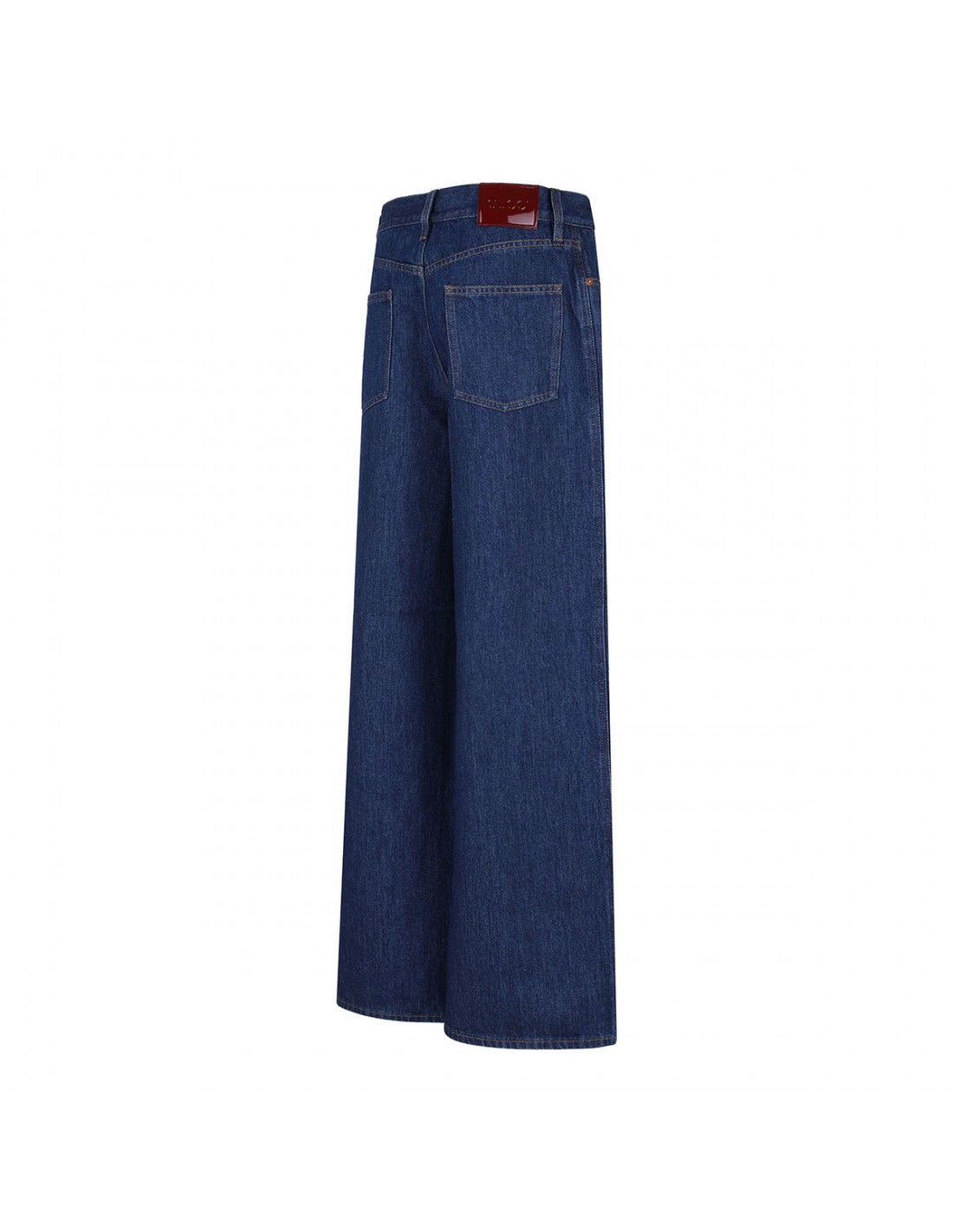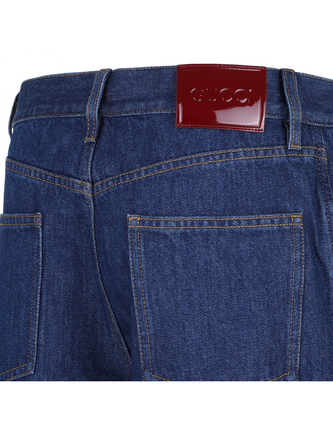 Dark blue washed cotton denim pants from Gucci featuring Rosso Ancora hue naplak label, belt loops on the waistband, classic five-pocket style, button closure and zip fly, wide leg.