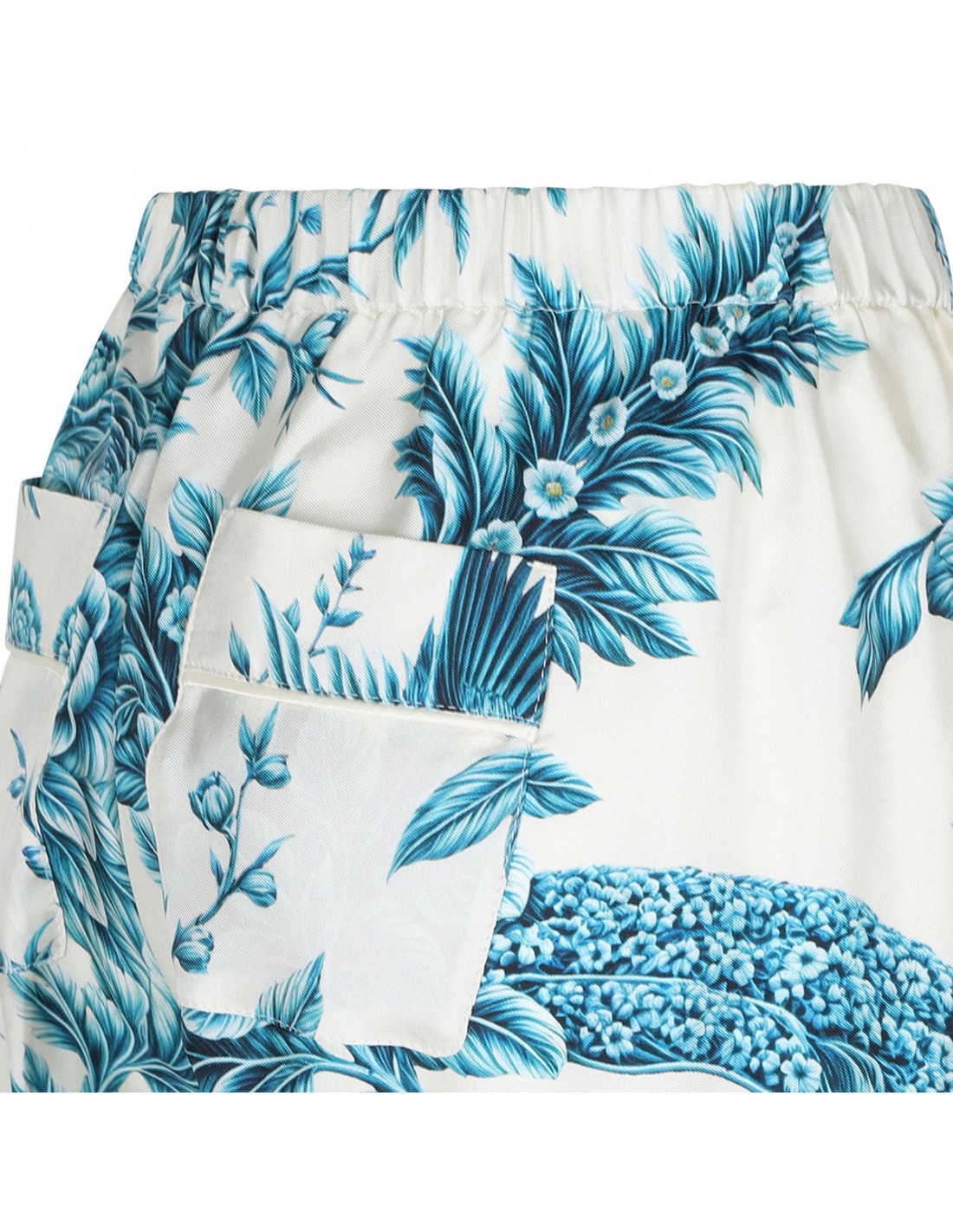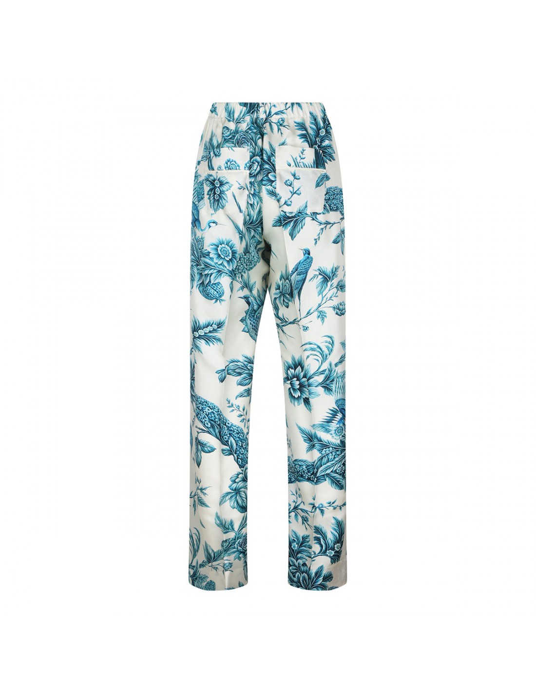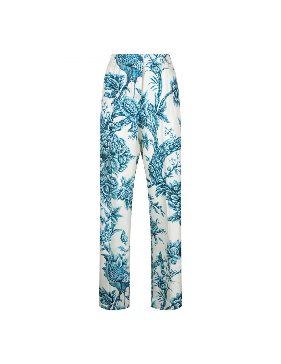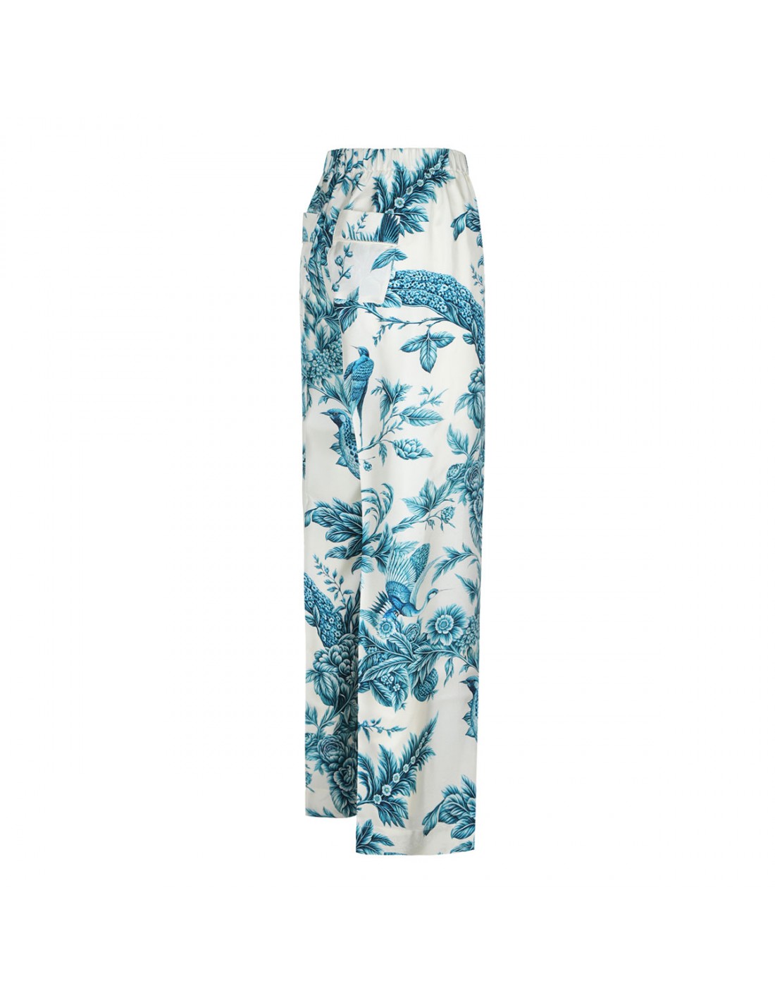 Silk Etere pants from F.R.S. featuring teal hue branches motif, high waist, button fly fastening, elastic waistband, two back patch pockets.