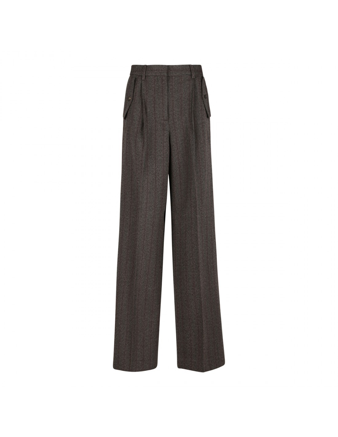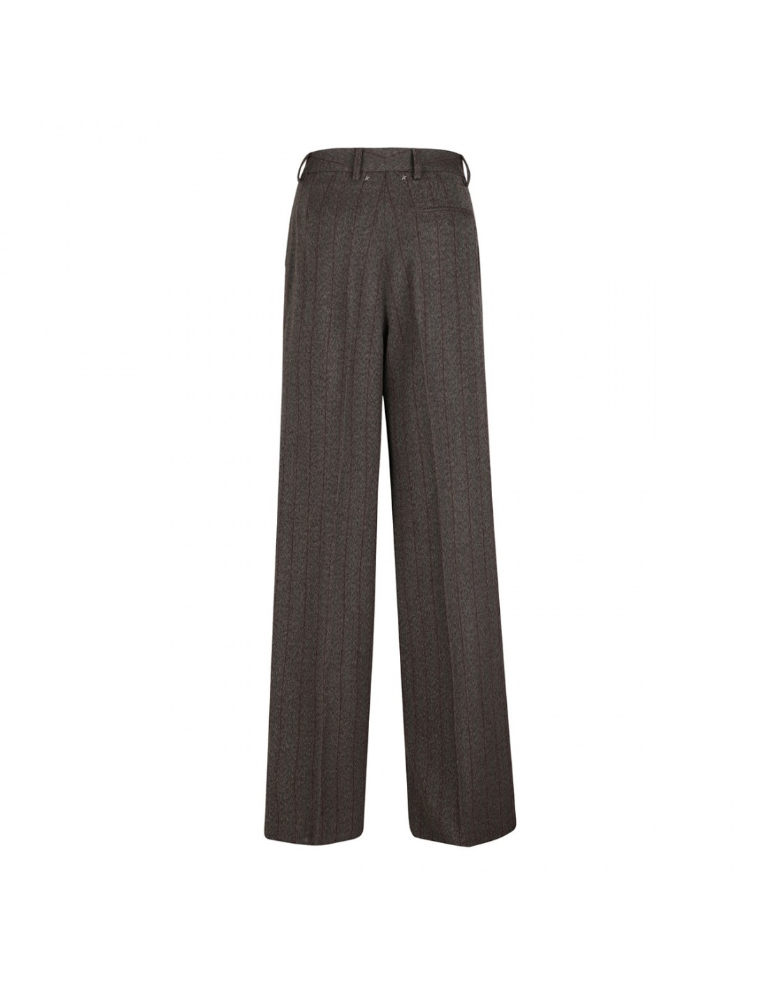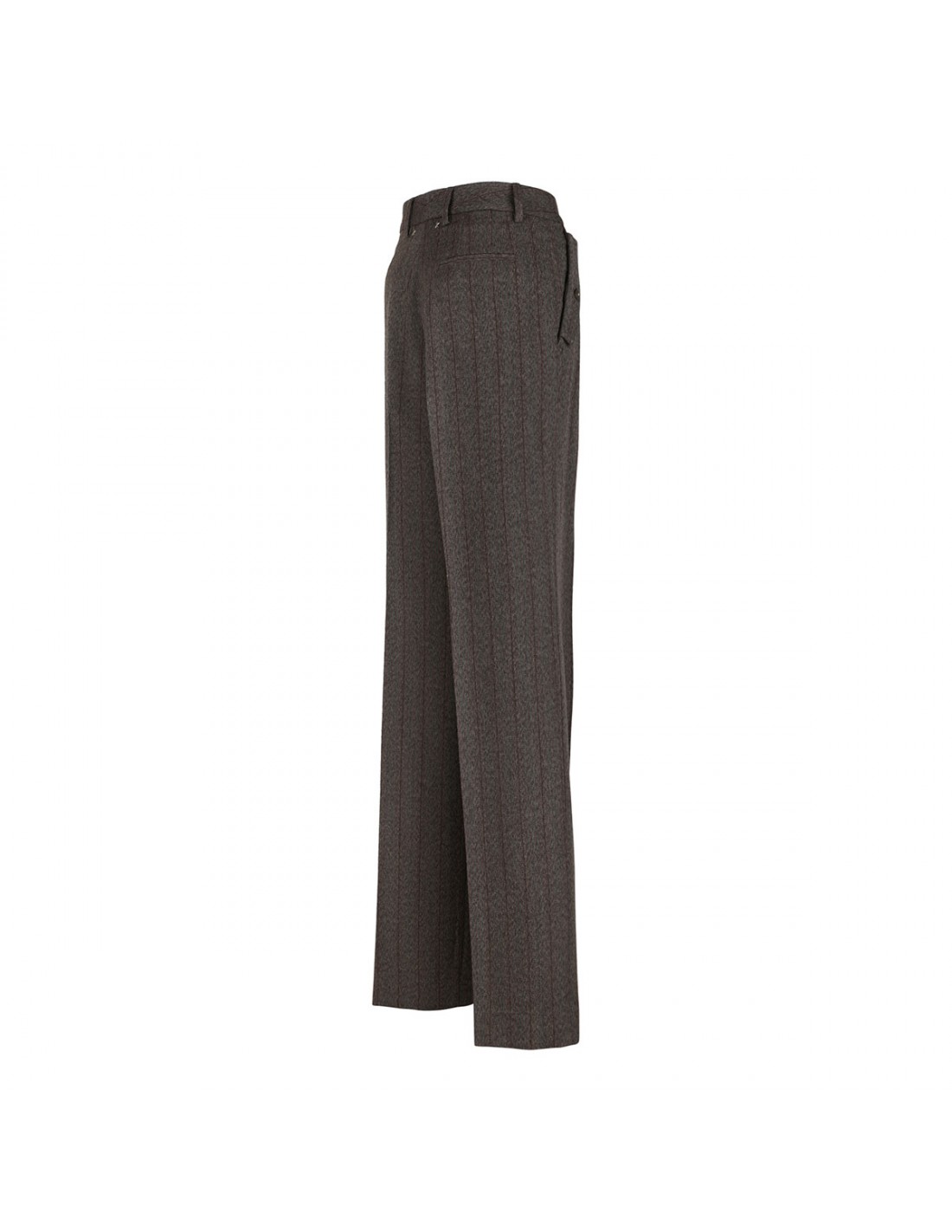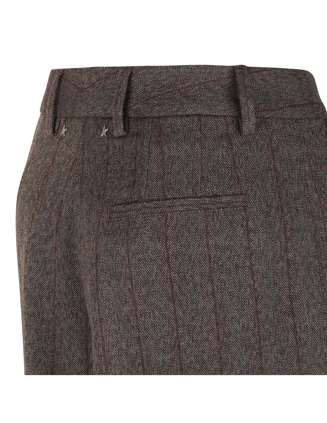 Brown virgin wool pants from Golden Goose featuring pinstripe motif, side pockets with buttoned flap, belt loops on the waistband, double star on back, creases on front, back slit pockets.
