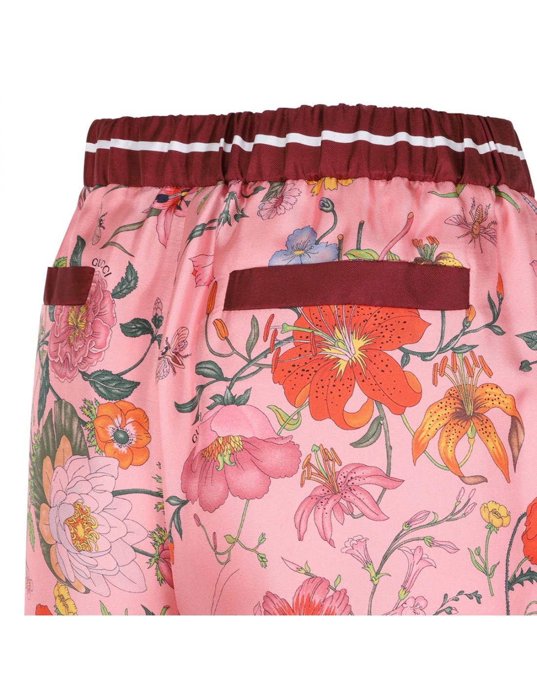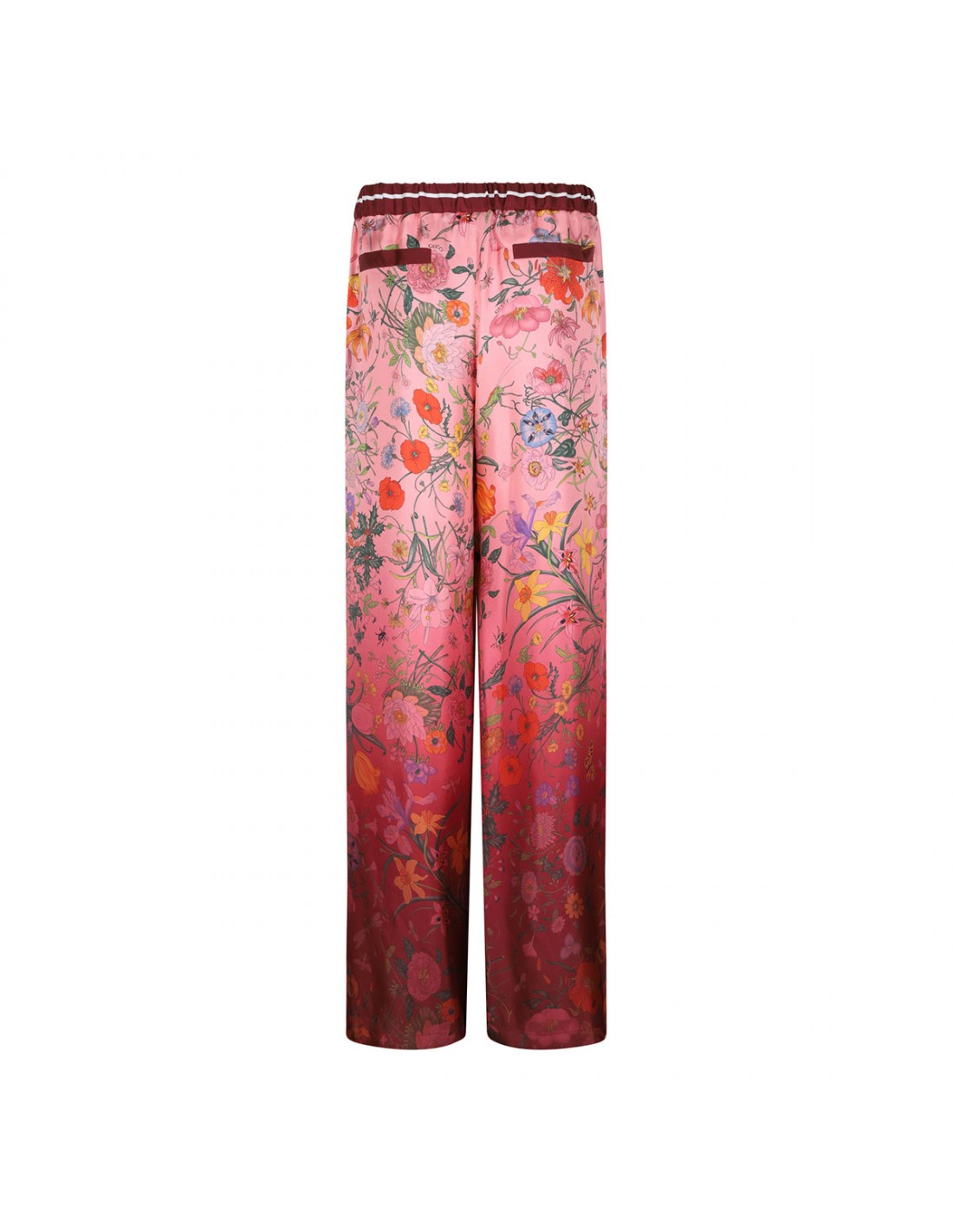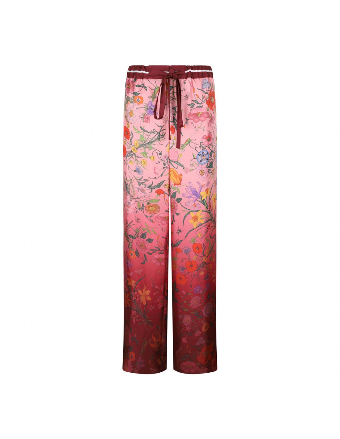 Pink and Rosso Ancora red silk twill pants from Gucci featuring gradient Gucci Flora motif printed allover, covered button, elastic waistband with drawstring, back pockets.