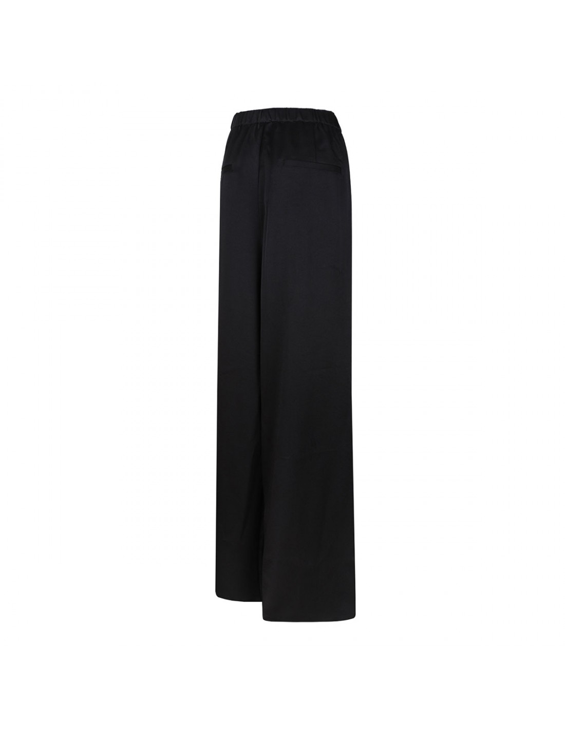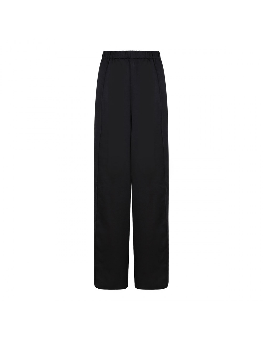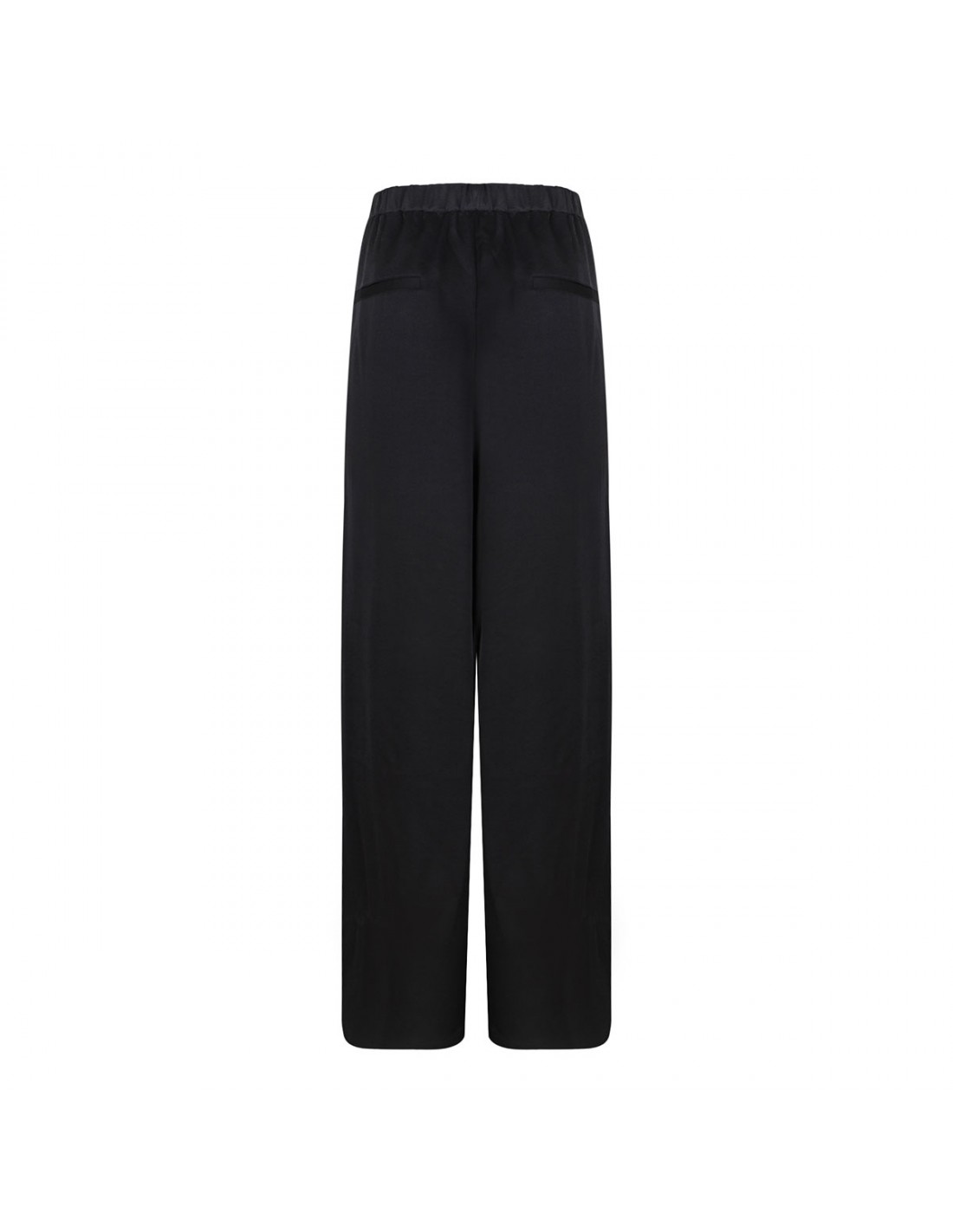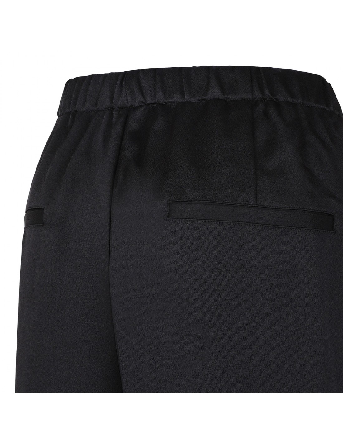 Black crepe pants from Vince featuring tonal knit strap down the side, elastic waist with drawstring waist, slip on style, side and back pockets.