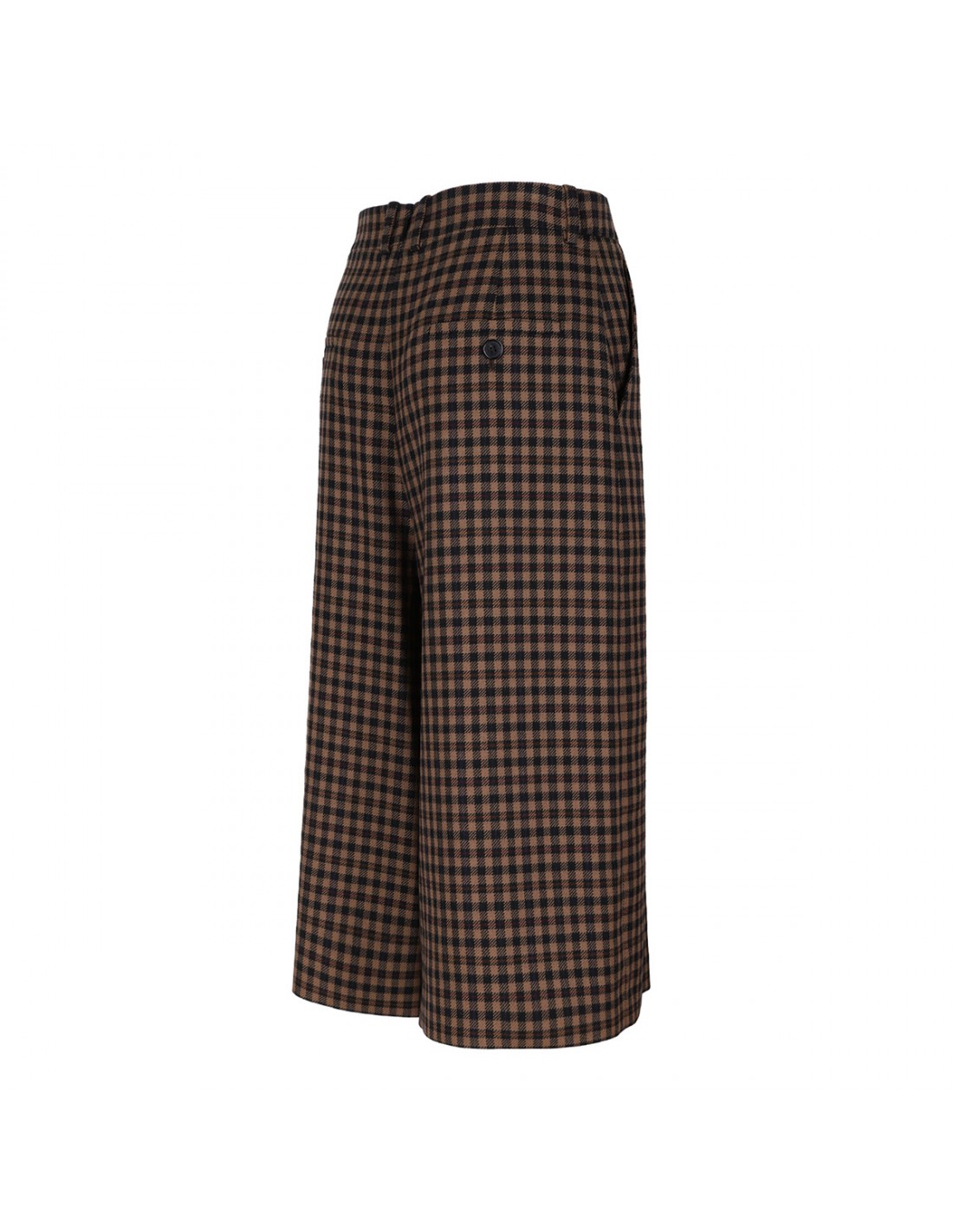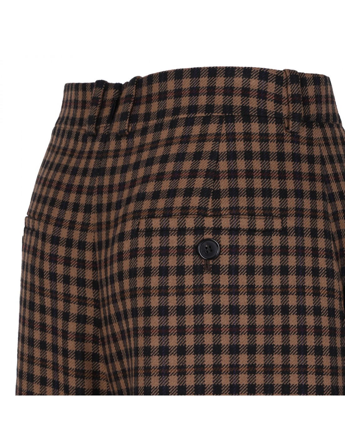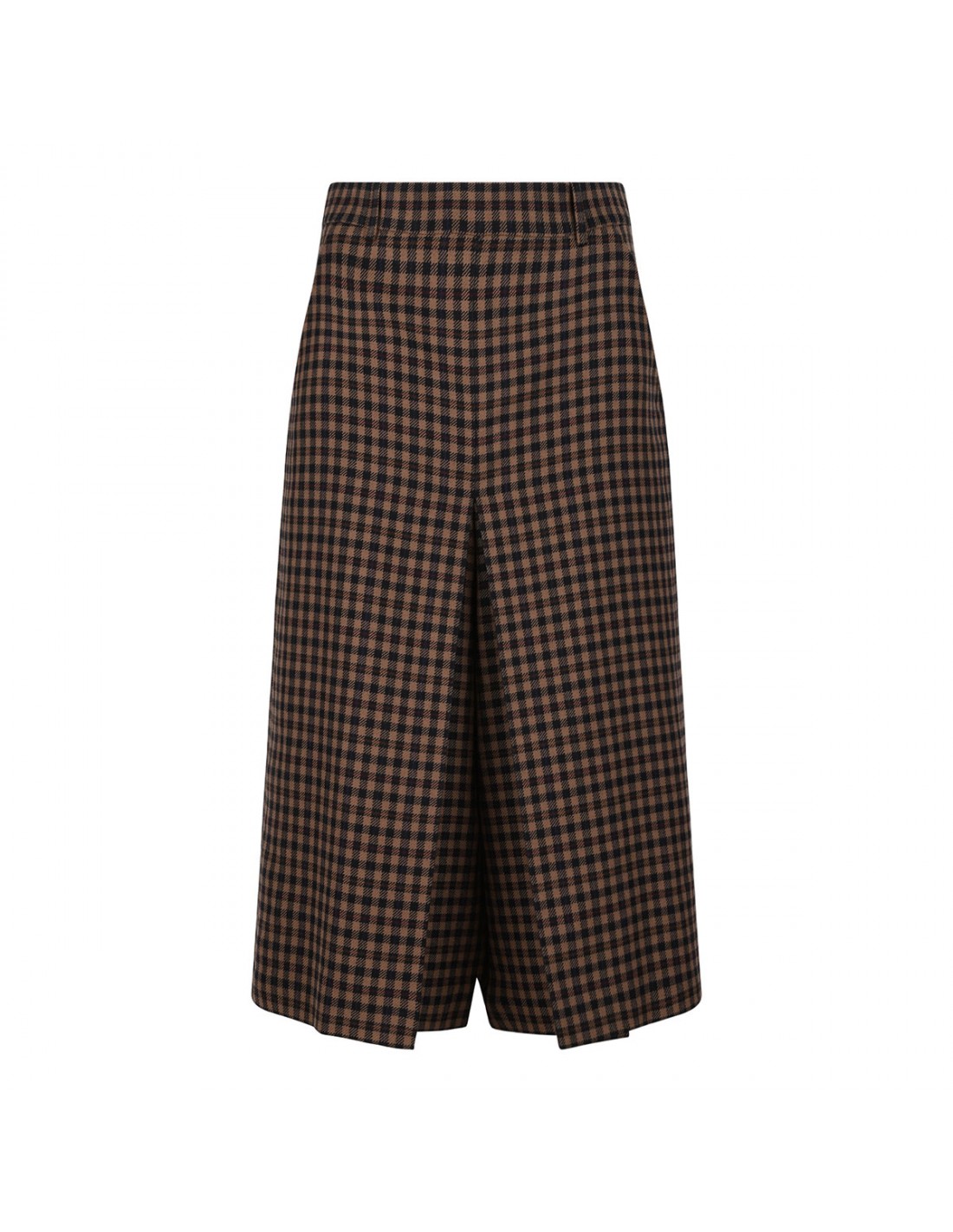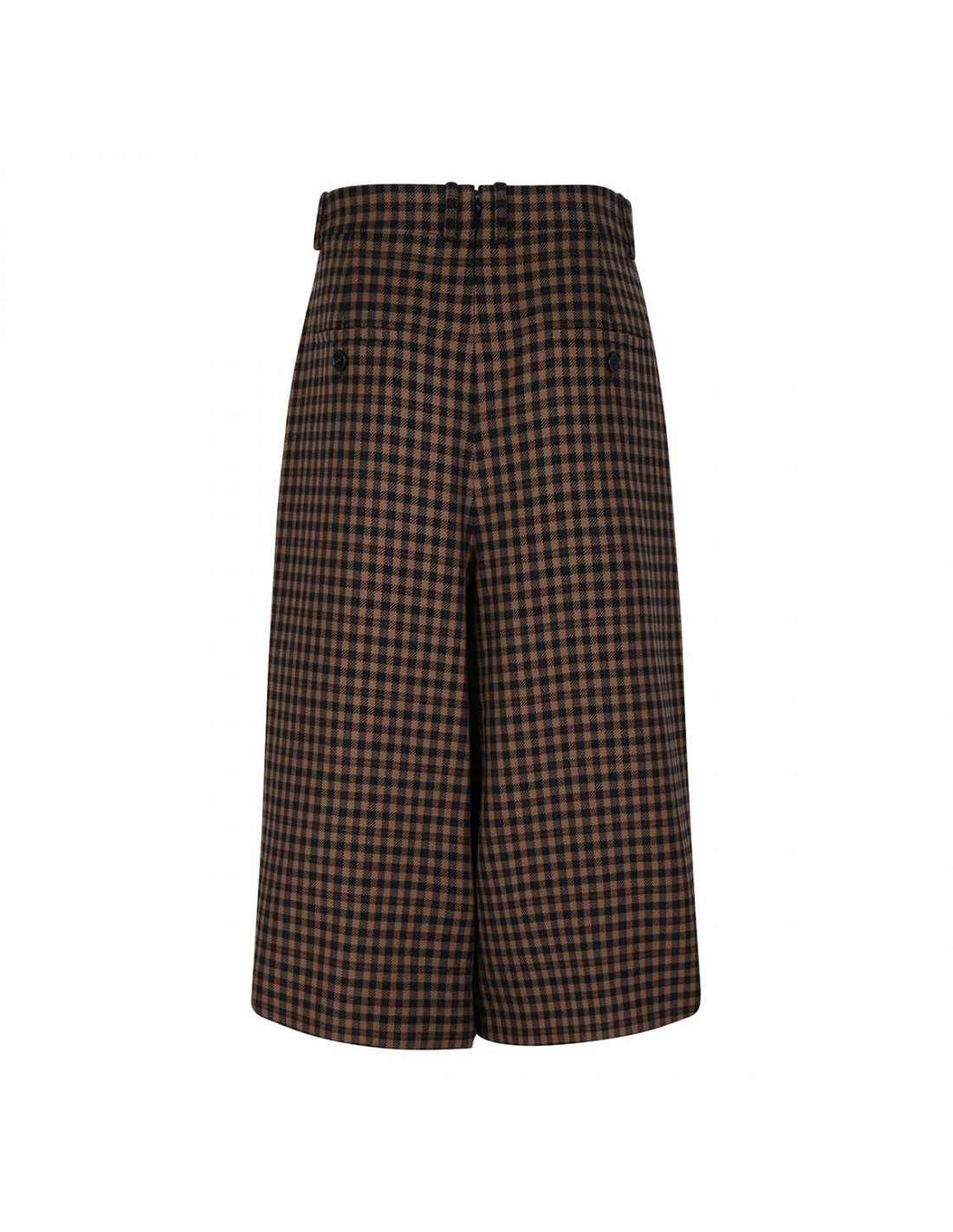 Beige, black and multicolor wool skort culottes from Saint Laurent featuring check motif, midi-length, mid-rise, side pockets, concealed back zip closure with hook-and-eye, buttoned back pockets, belt loops at waistband, silk lining.