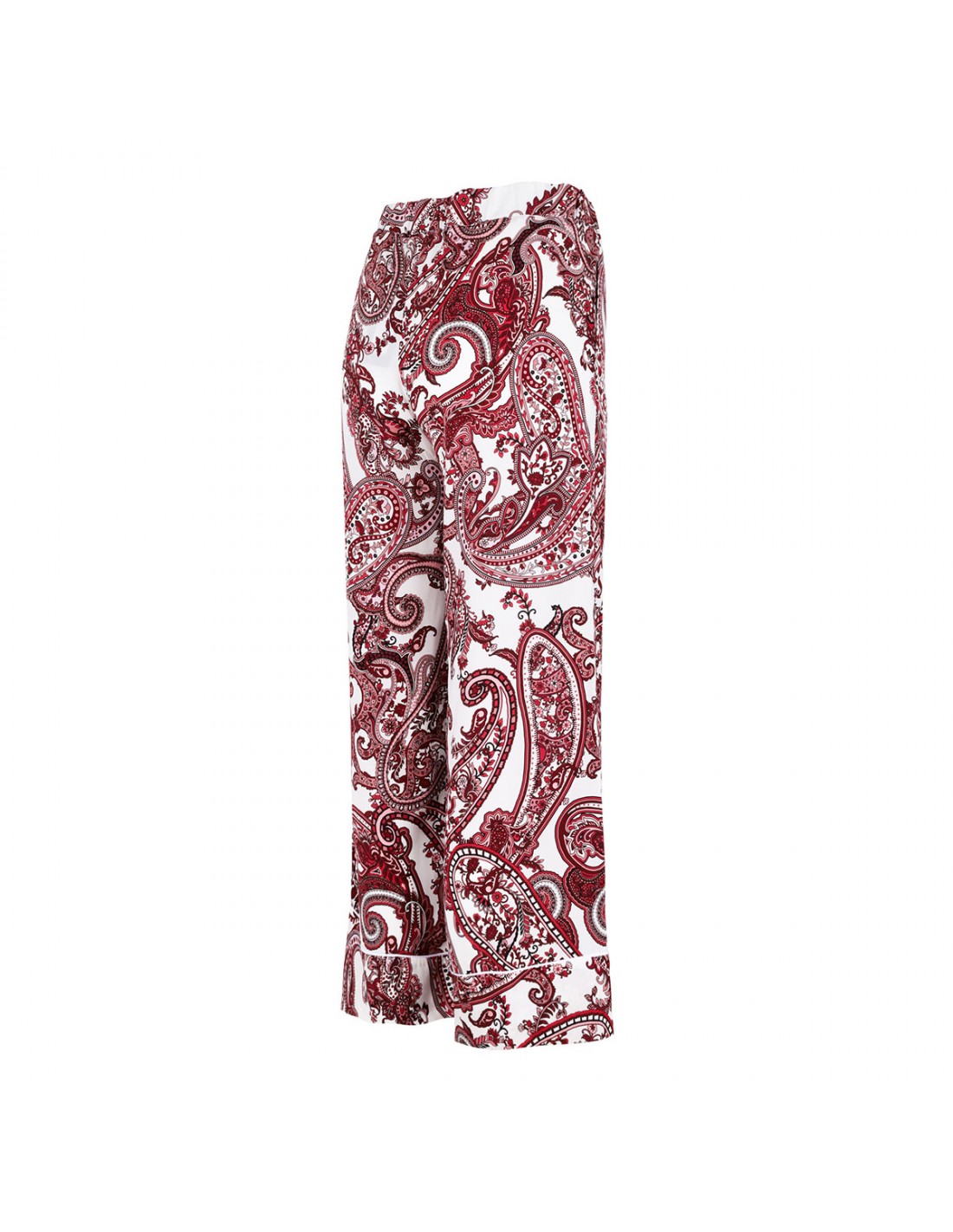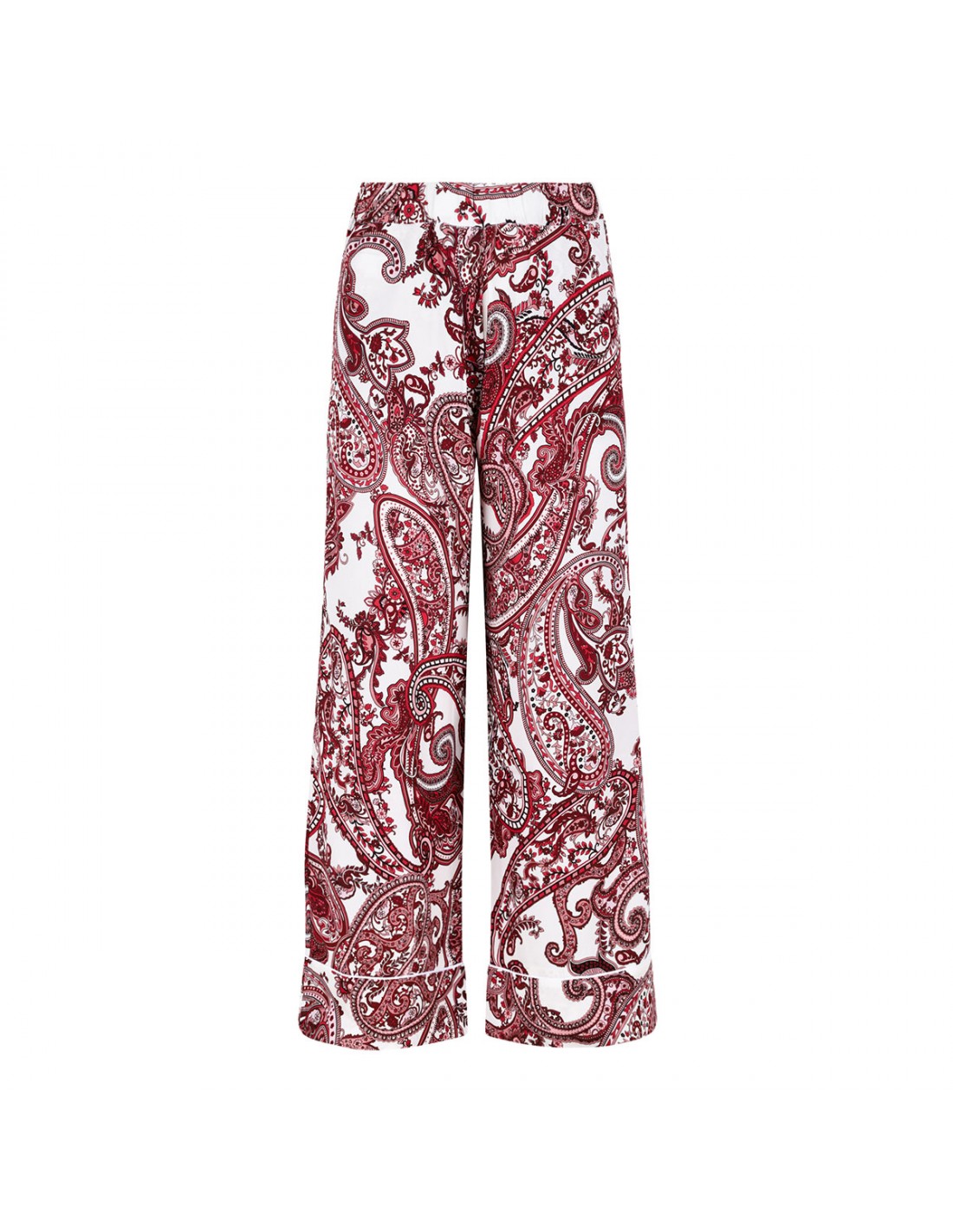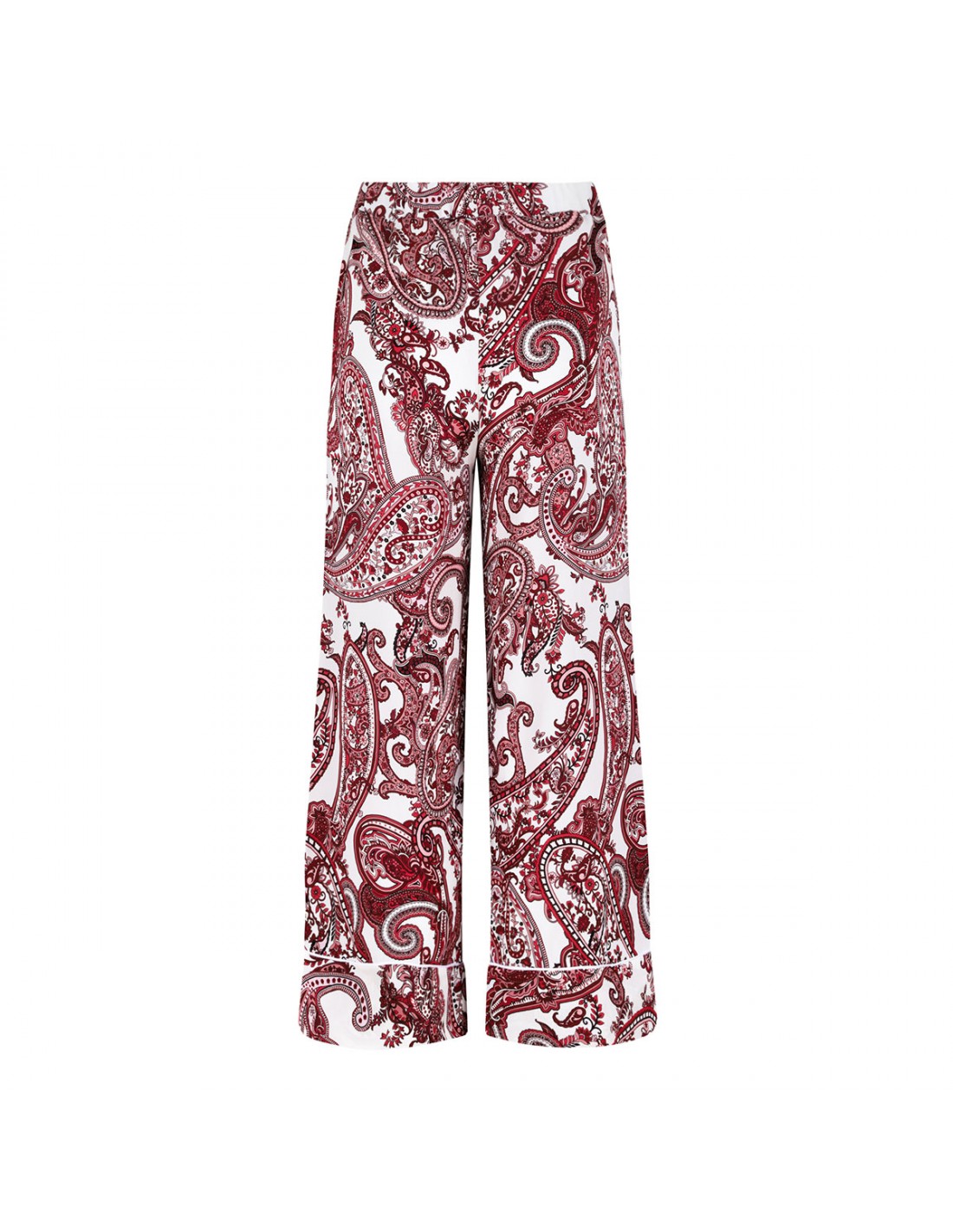 Ivory and bordeaux silk pants from Le Noir featuring paisley motif printed allover, wide leg, piping on ankle cuffs, side pockets, elastic waist.