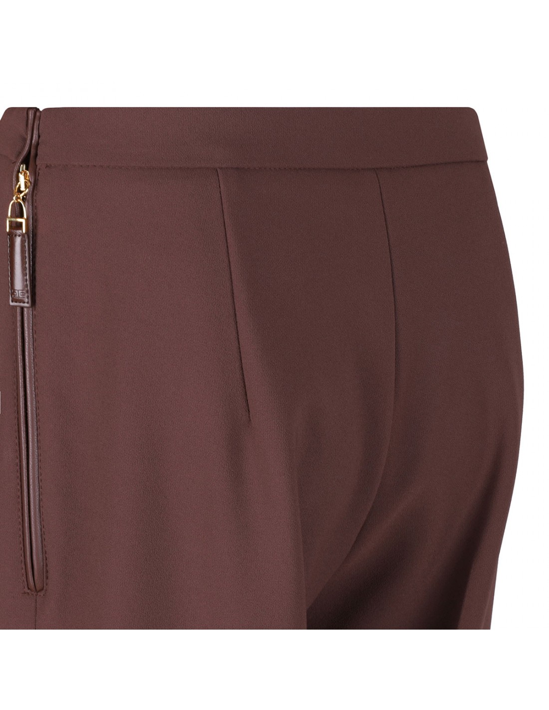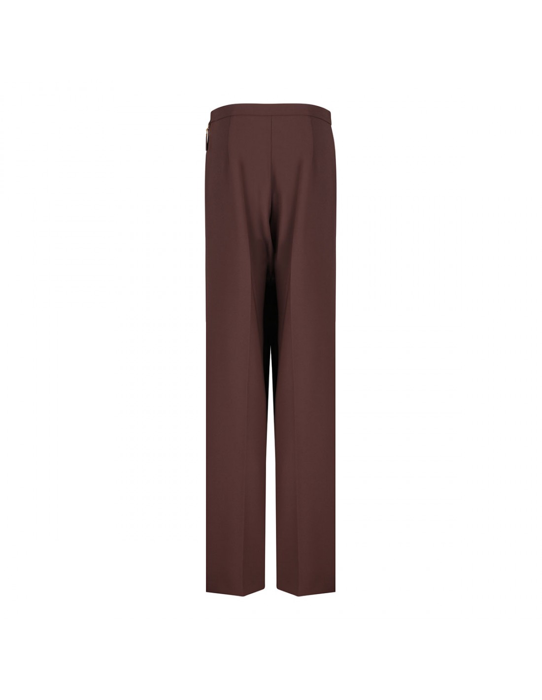 Coffee double crepe pants from Elisabetta Franchi featuring high waist, zip fastening on side, stitching at front, waist flaps with gold-tone buttons, flared silhouette.