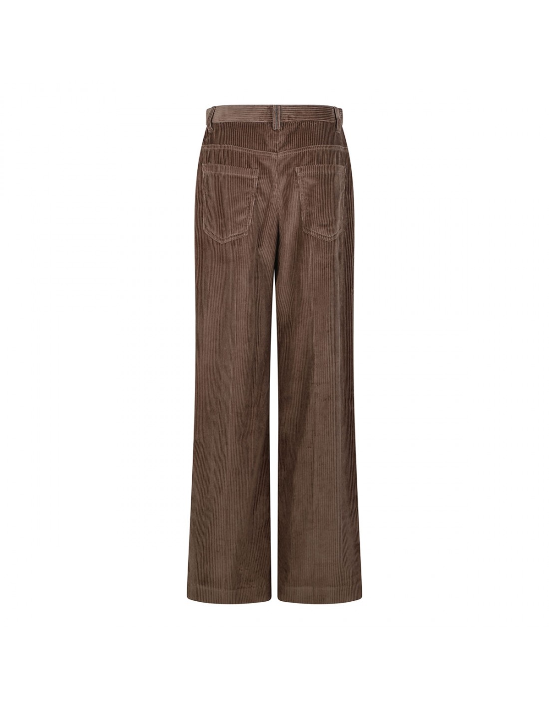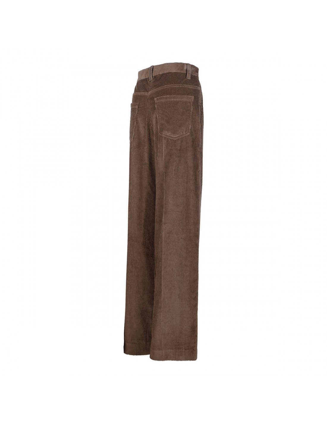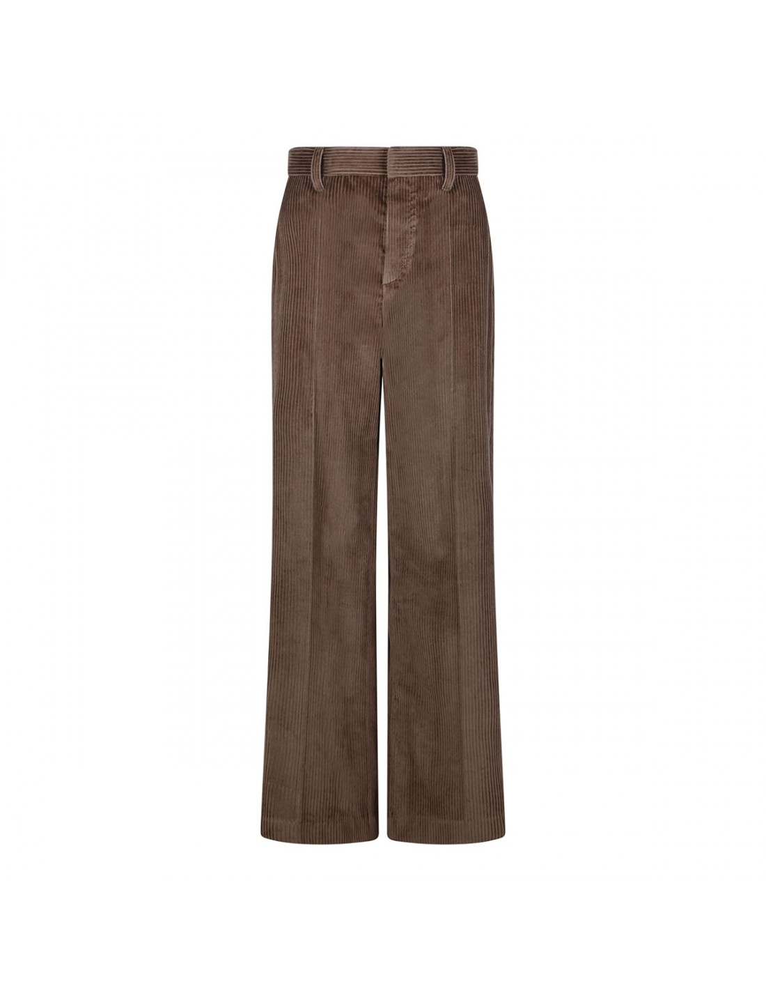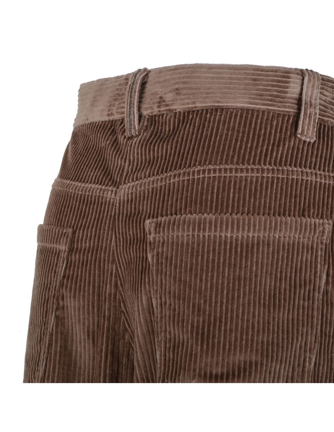 Wood hue cotton corduroy pants from Brunello Cucinelli featuring shiny monili embroidery detail, wide loose leg, zip fly, metal hook and button closure, front and back pockets, pleat.
