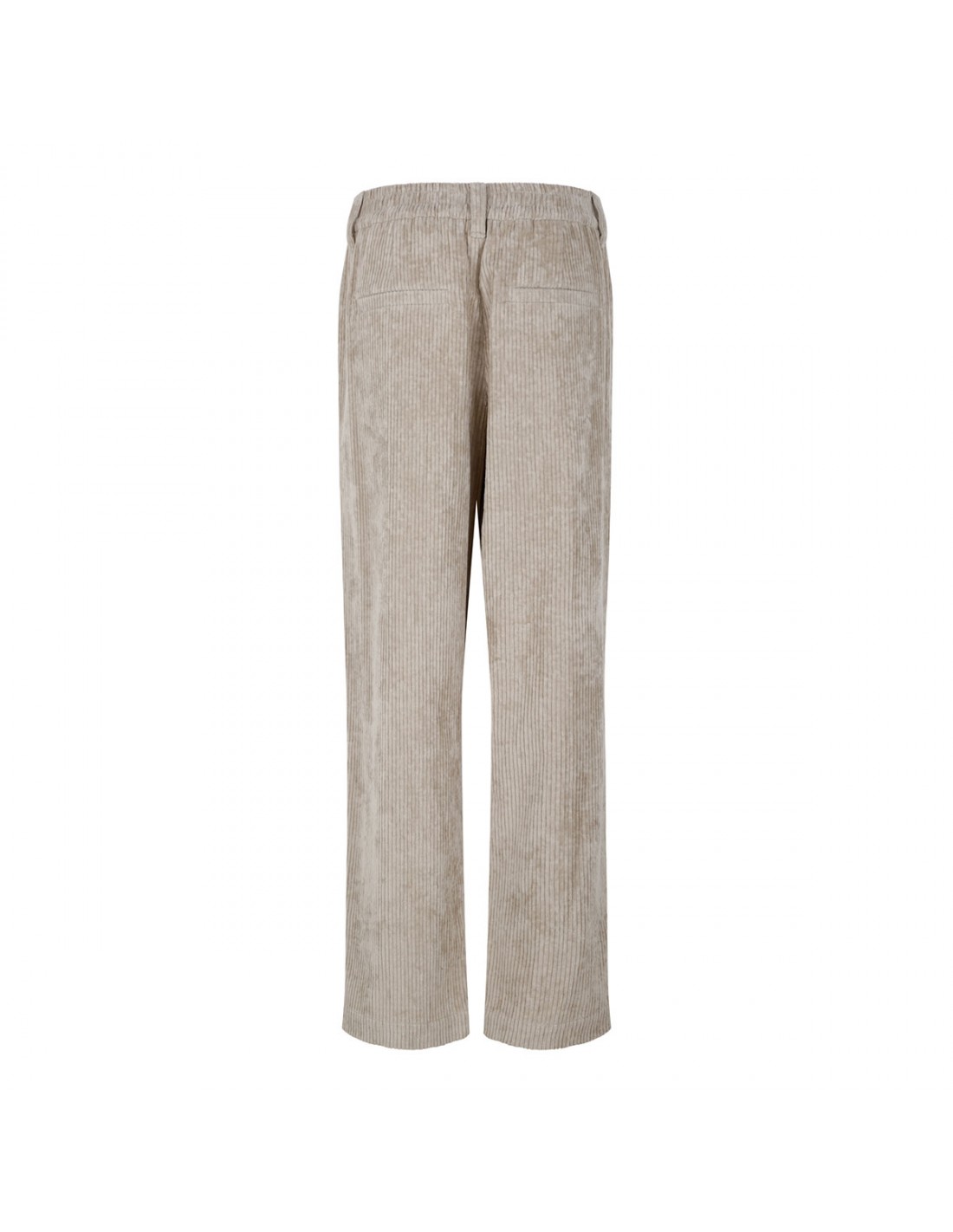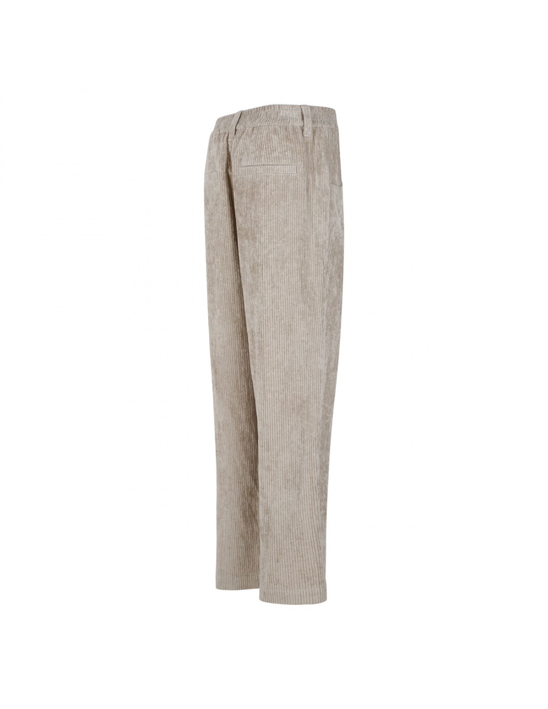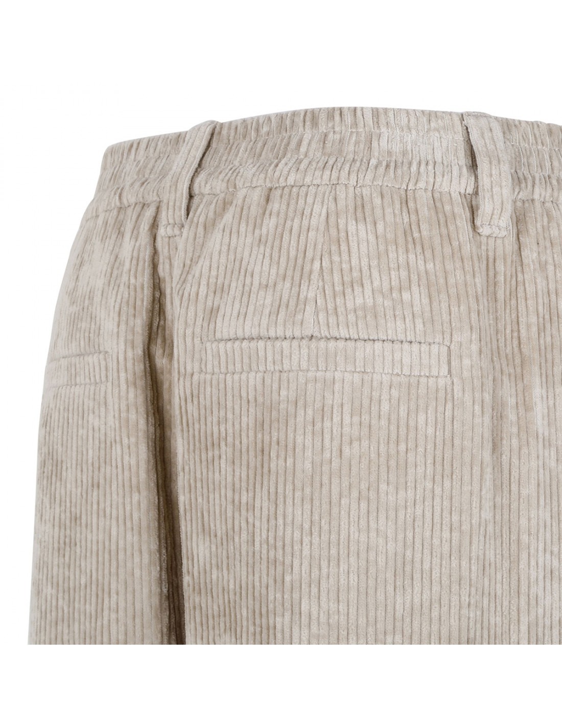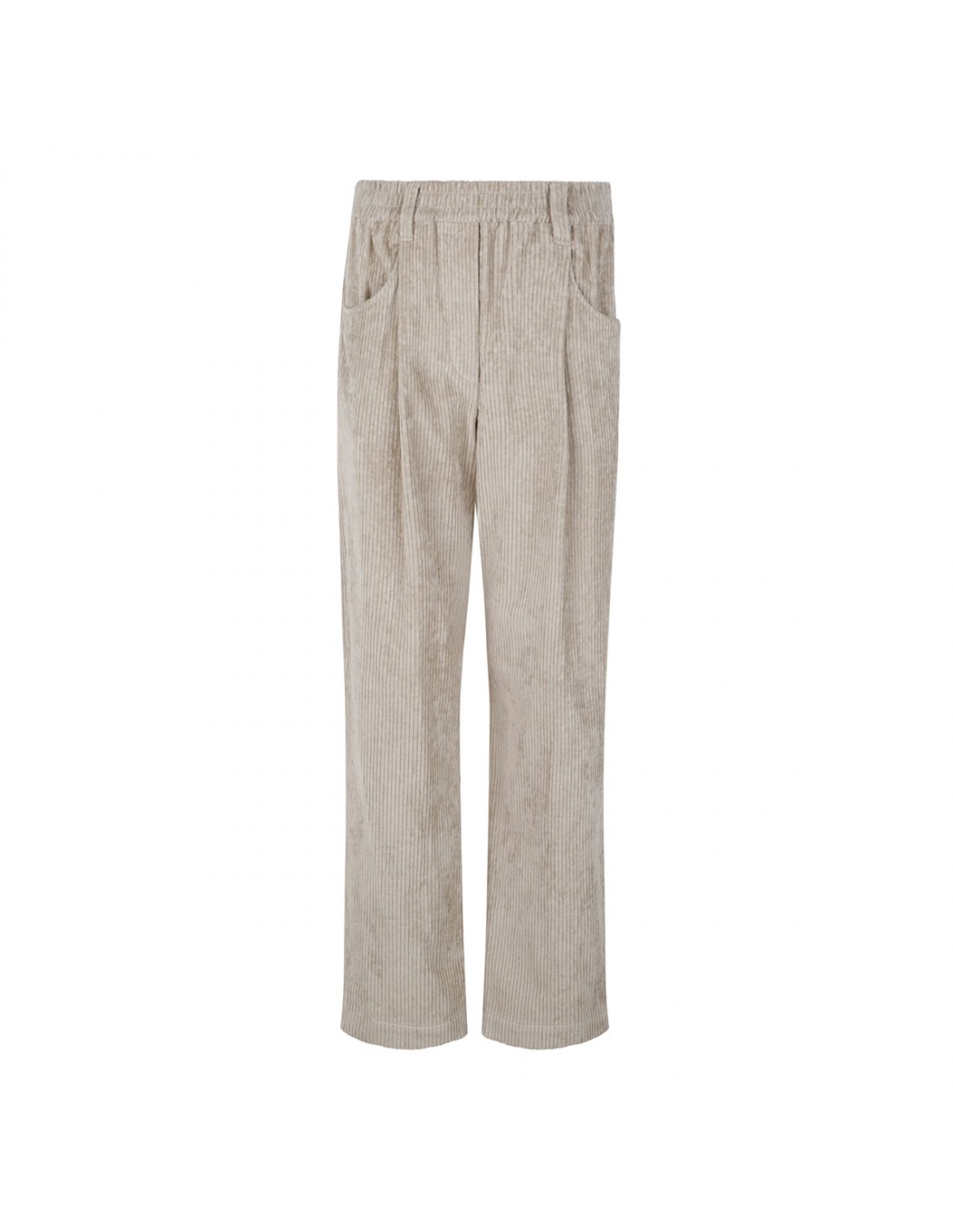 Mother of pearl hue cotton corduroy baggy pants from Brunello Cucinelli featuring front pleats, wide loose leg, elastic waist, pull on design, relaxed fit, front and back pleats.