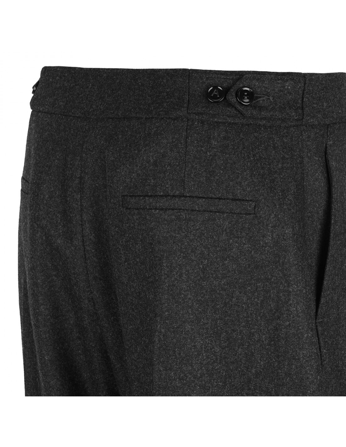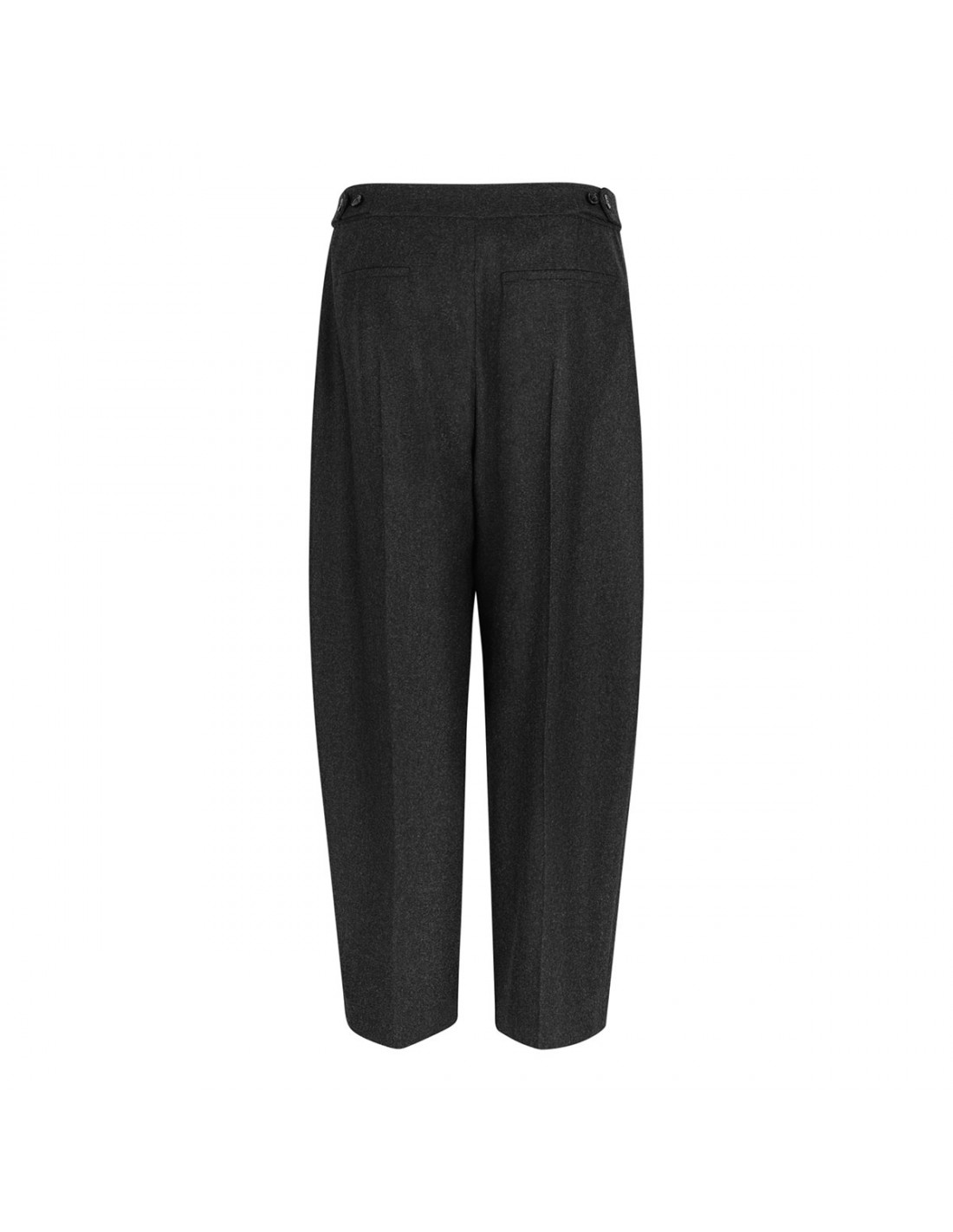 Anthracite gray merino flannel tailored pants from Alaia featuring low waist, ankle length, adjustable waist buttons, side pockets, darts on front, tapered fit and back pockets.