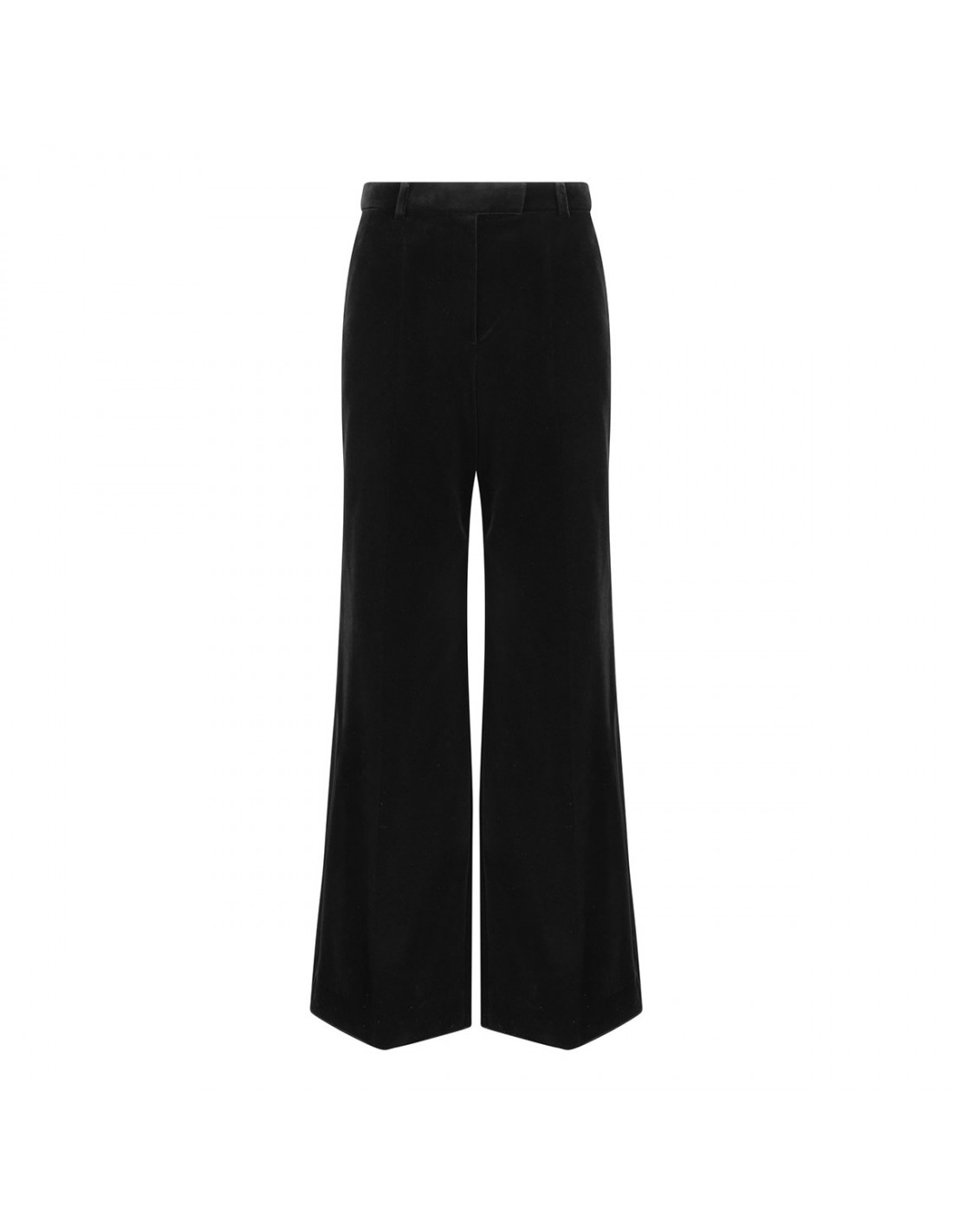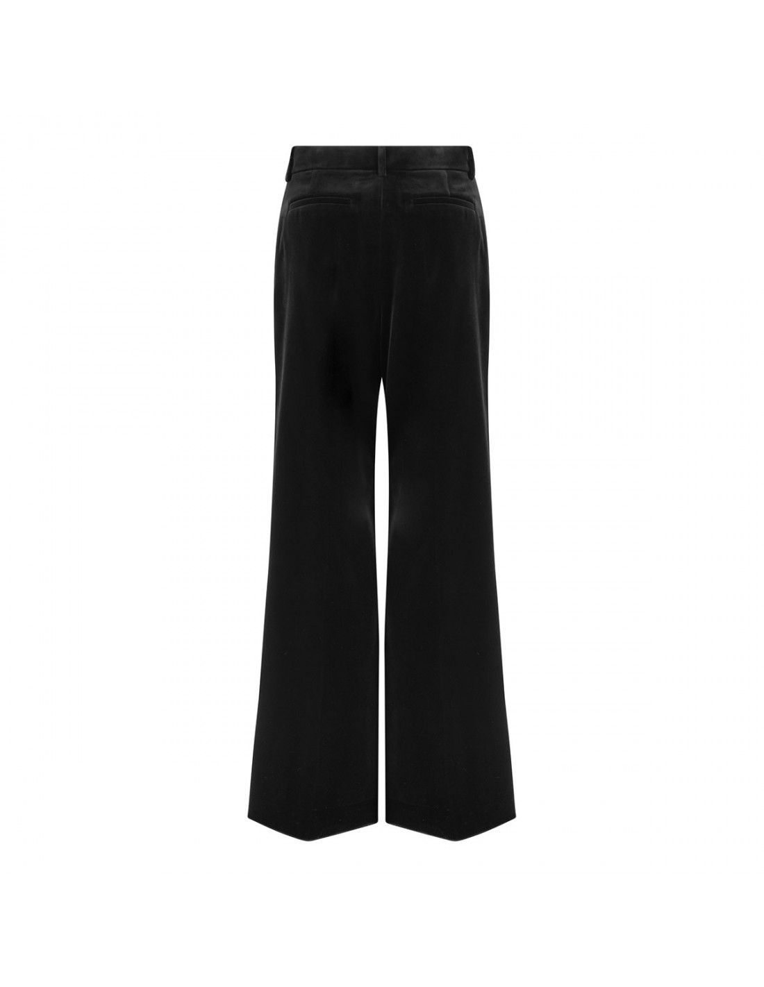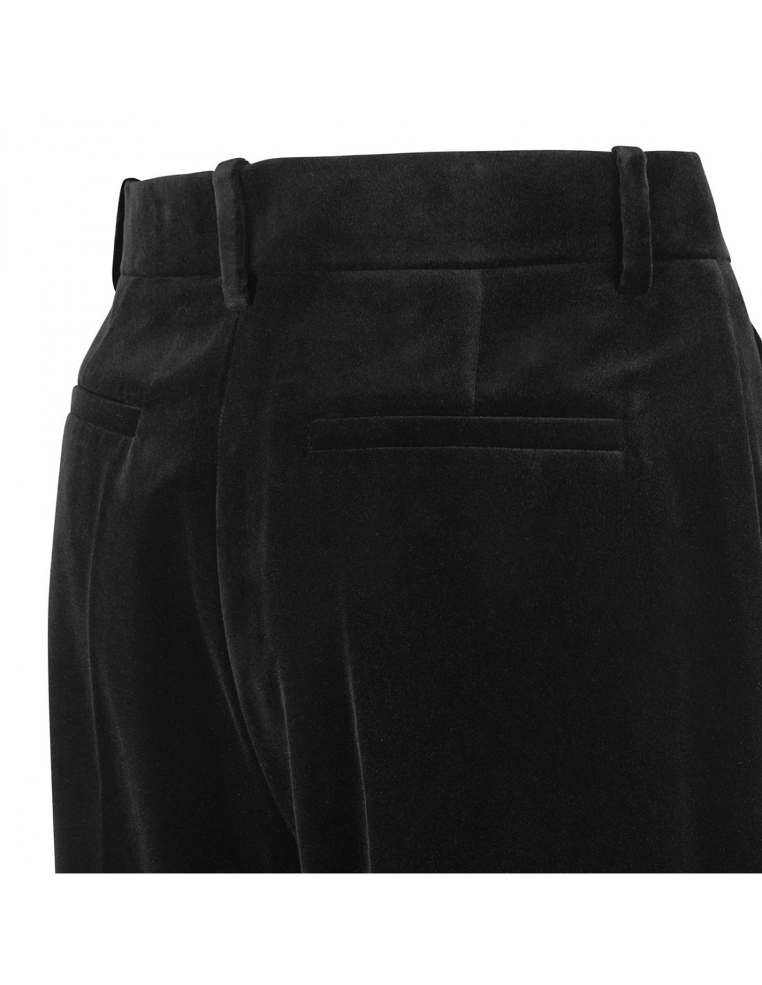 Black velvet pants from Valentino featuring frayed hem, front button and zipper closure, side pockets, belt loops on the waistband, straight leg, back pockets.