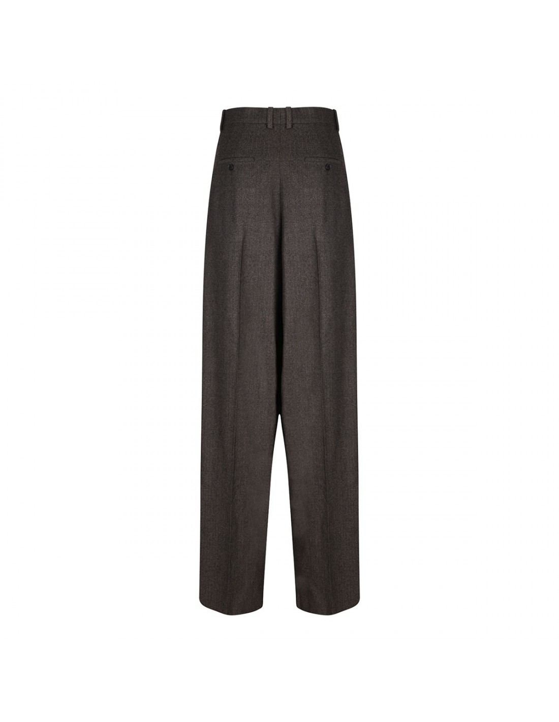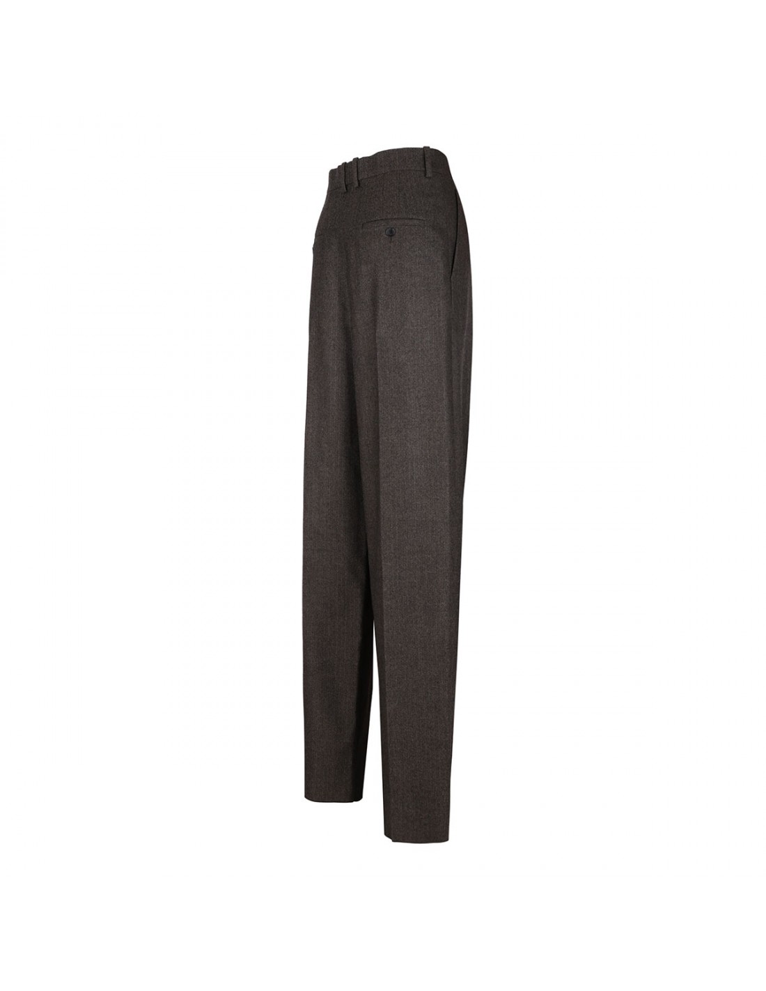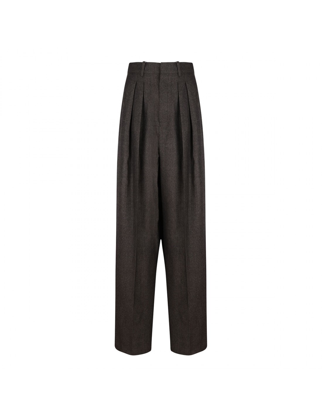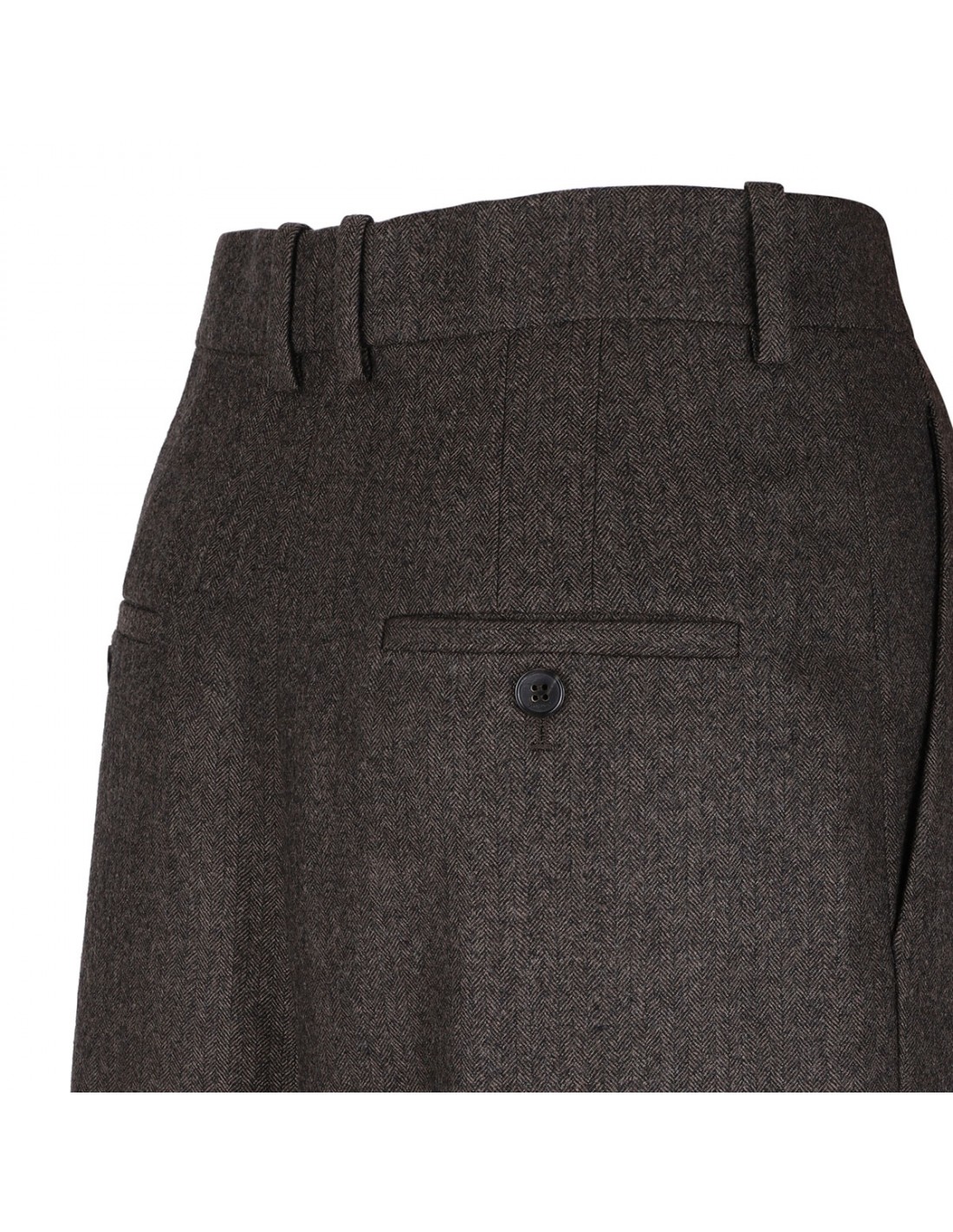 Brown-black wool pants from Saint Laurent featuring herringbone motif, mid-rise, wide leg, double pleat on front, side pockets, concealed zip and hook-and-eye fastening, back pockets with button closure, belt loop on the waistband.