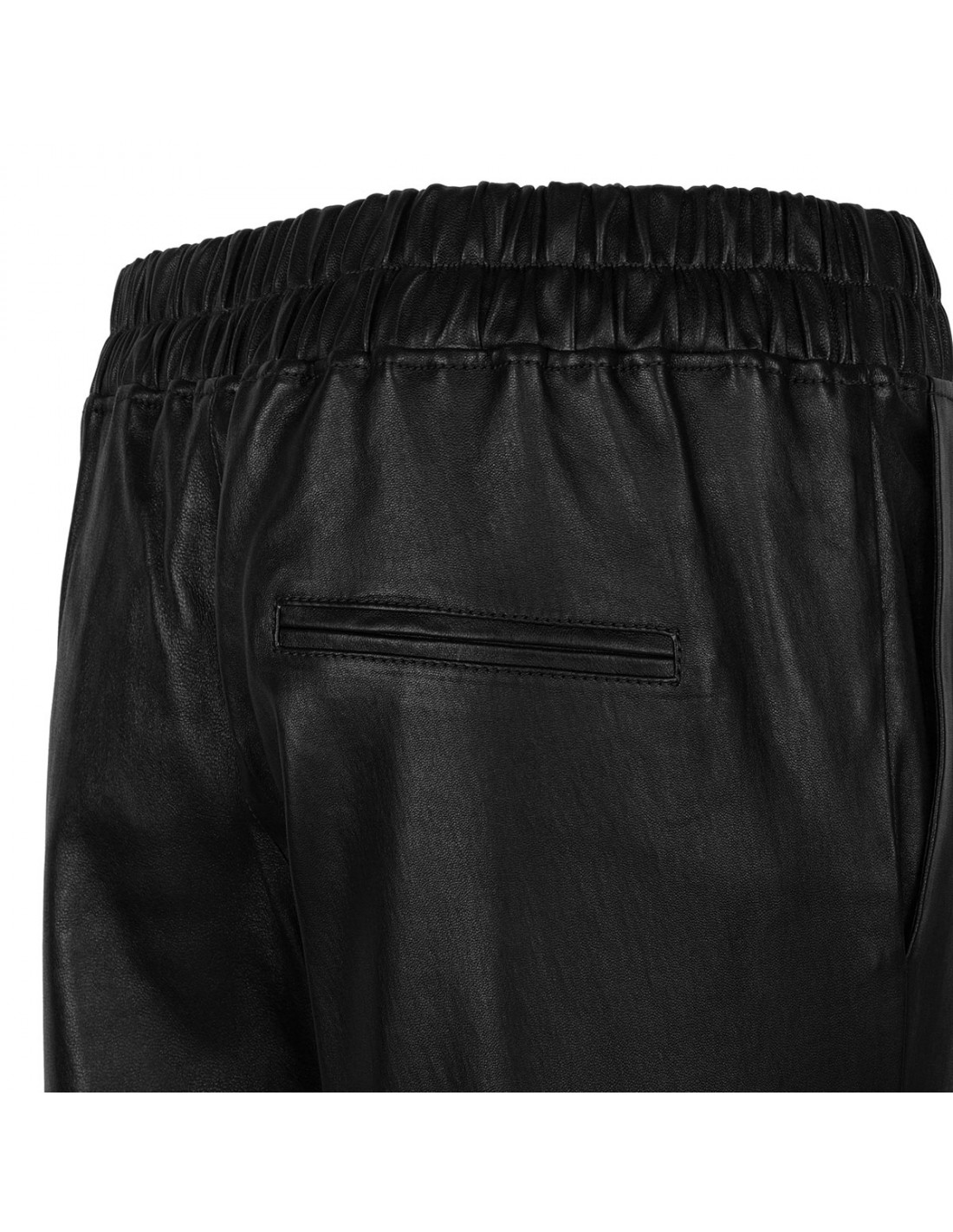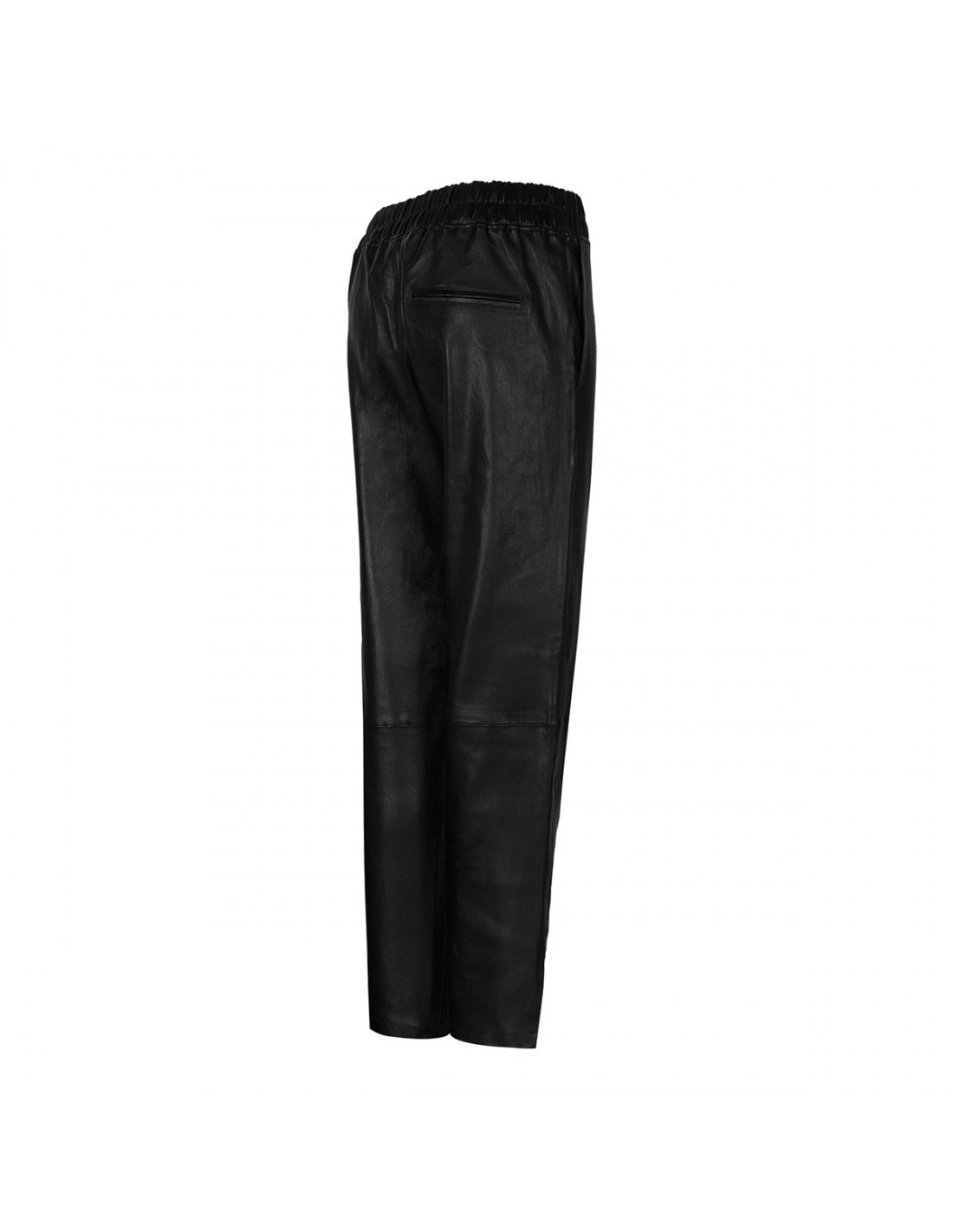Black leather Jardin pants from Ines e Marechal featuring elasticated waistband, side pockets, little ankle side slits, back welt pocket. Unlined.