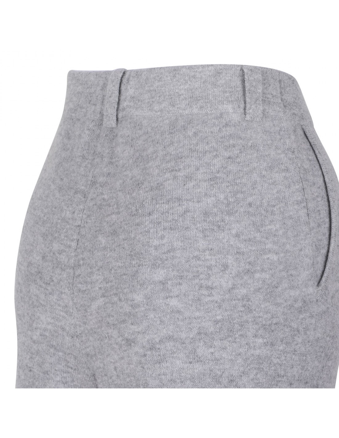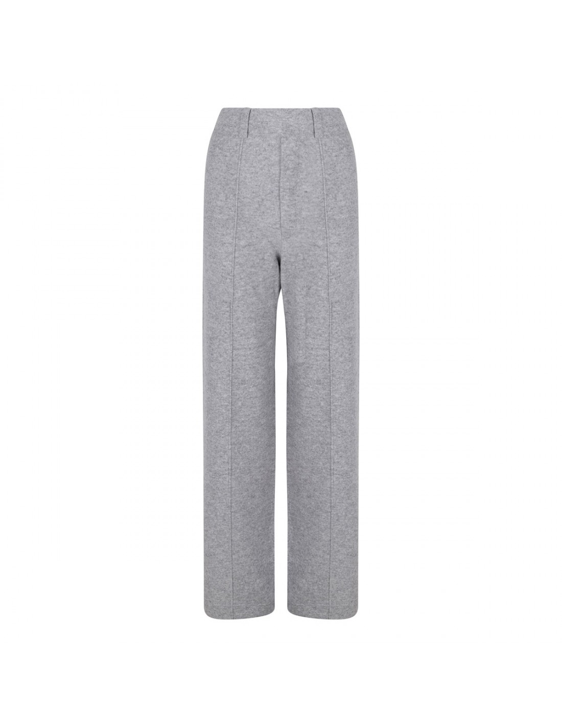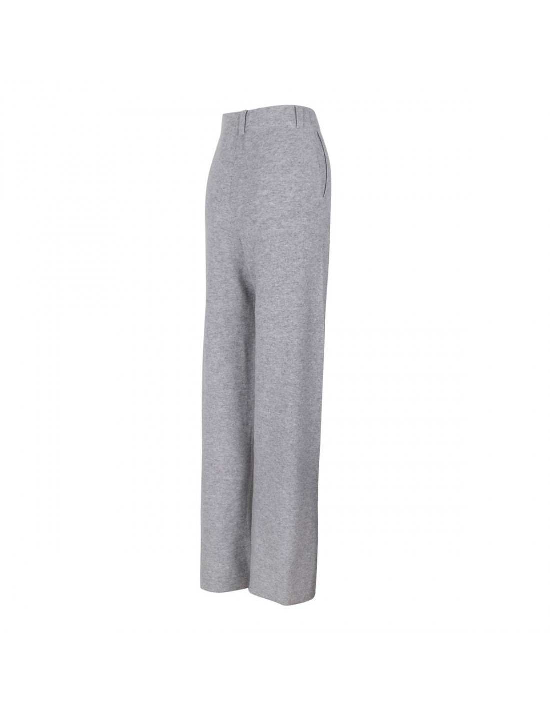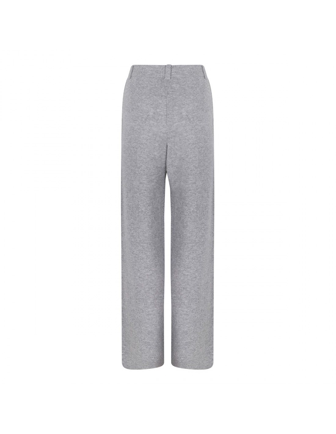 Gray knit Eliana pants from Le Noir featuring elastic waist, belt loops on the waistband, side pockets, slip on design, faux fly, wide leg, relaxed silhouette.