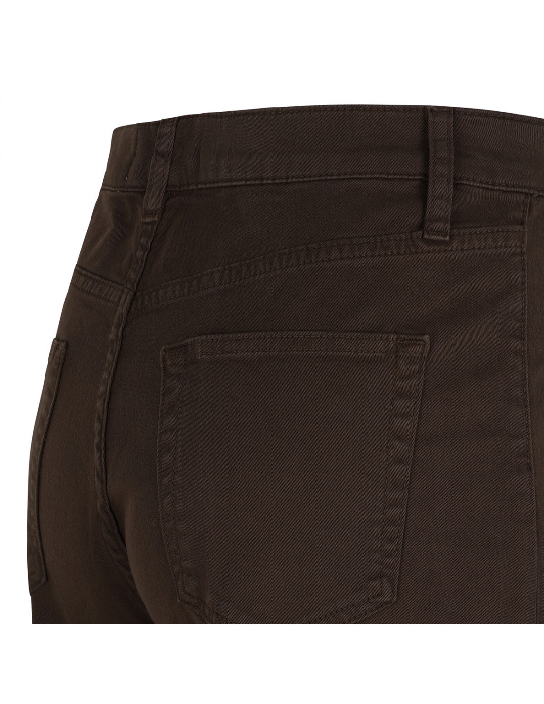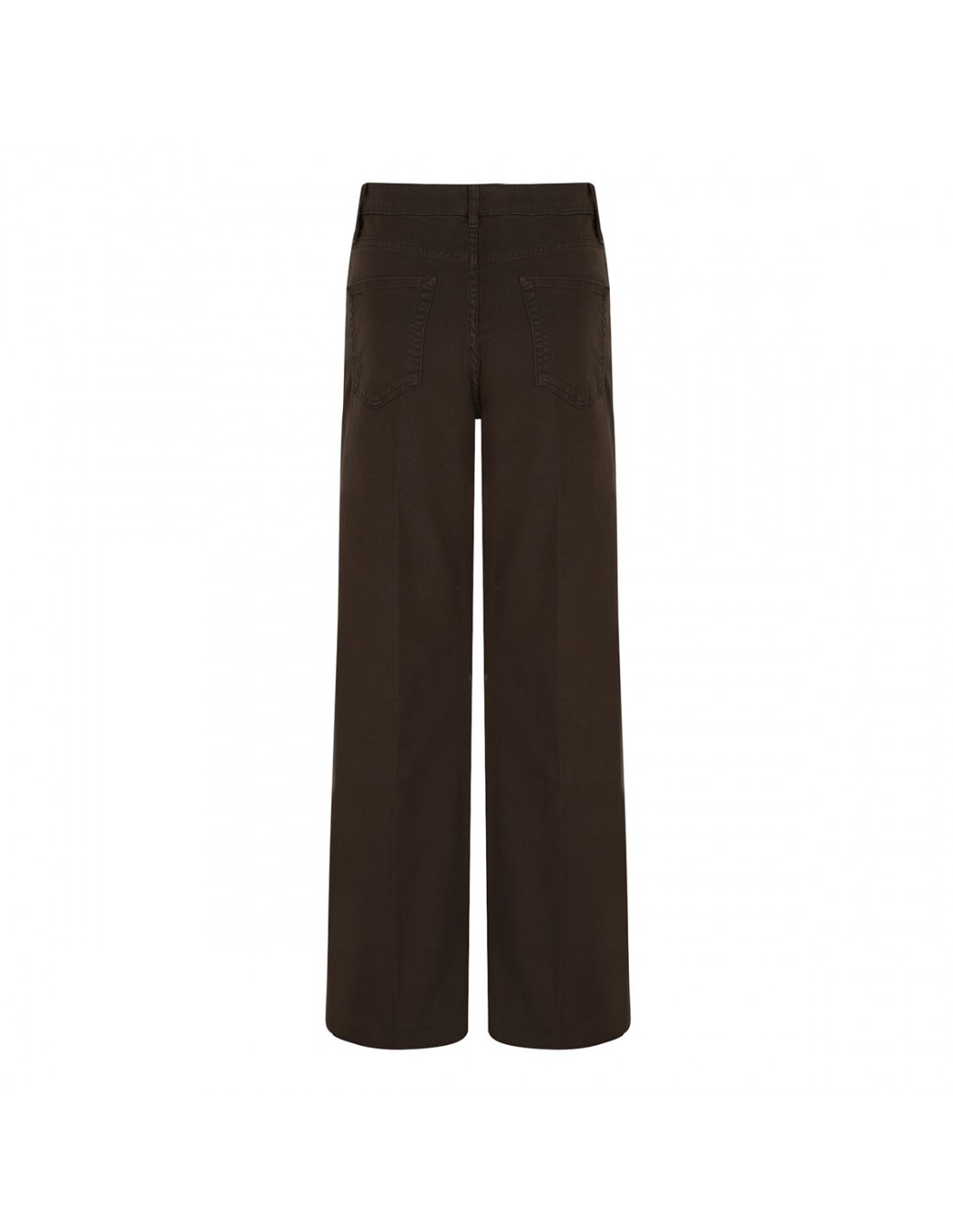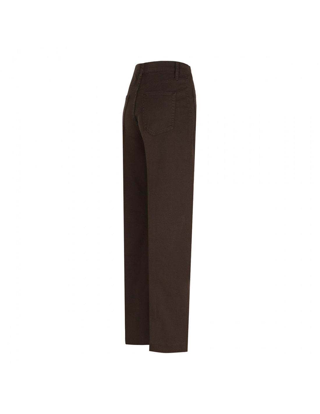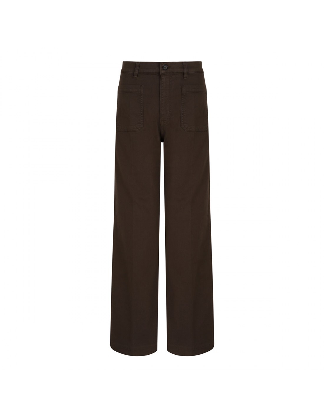 Brown super stretch twill The Refined pants from Frame featuring 70s-inspired silhouette, high rise, flared leg, front patch pockets, belt loops on the waist, button closure and zip fly, back patch pockets.