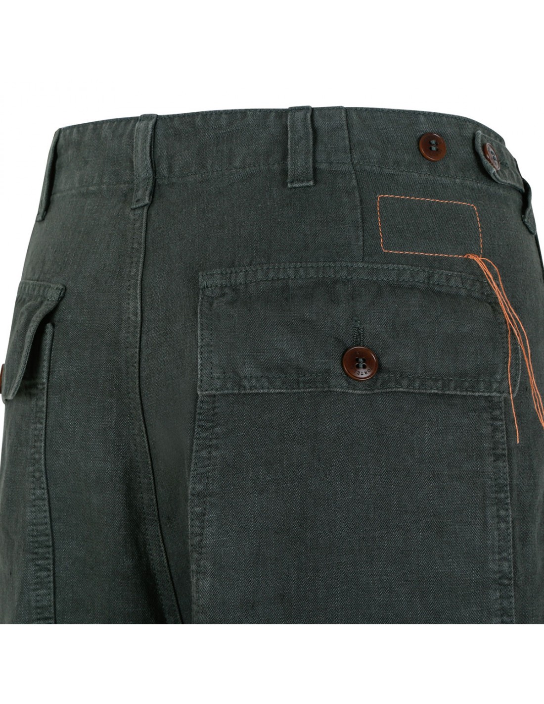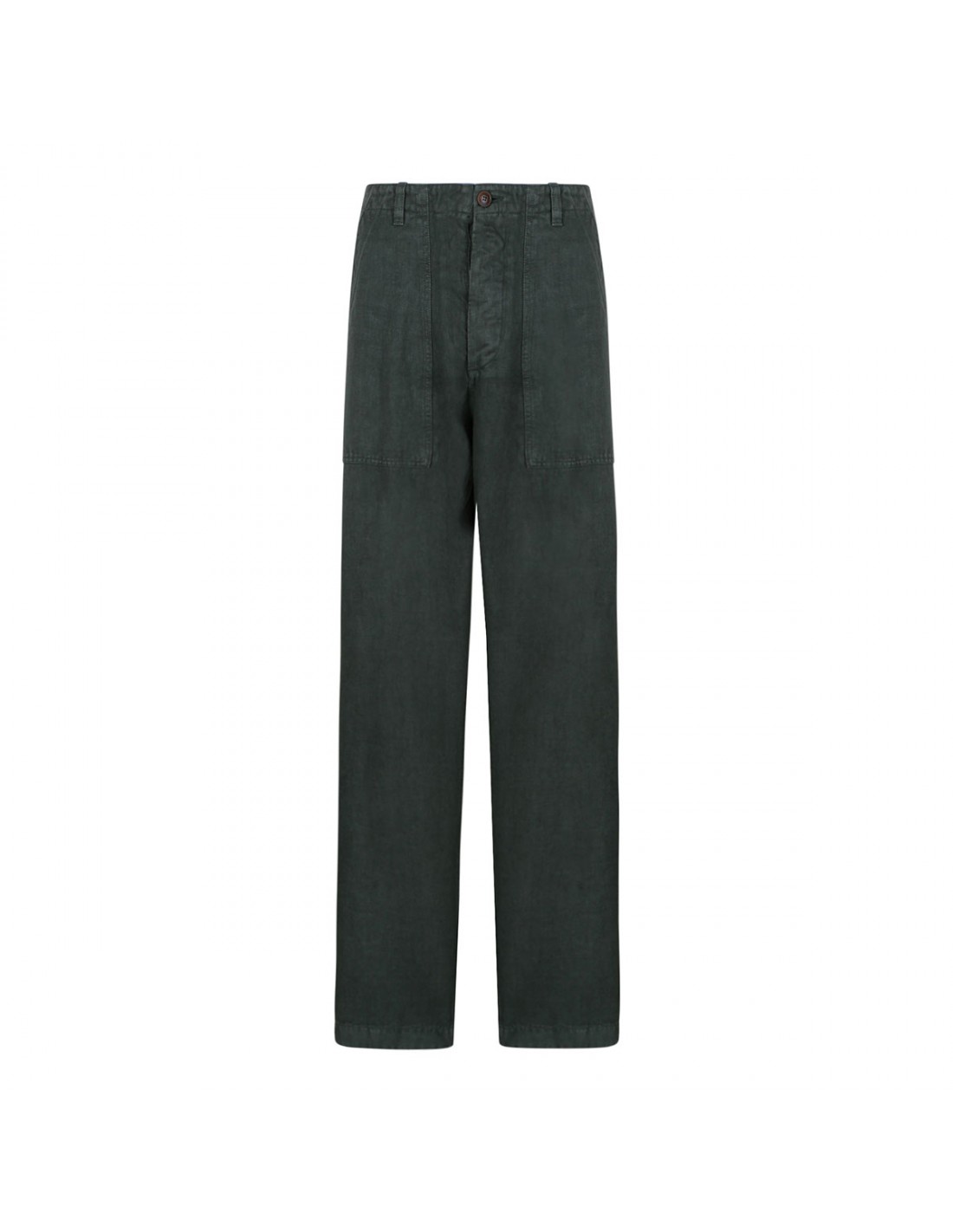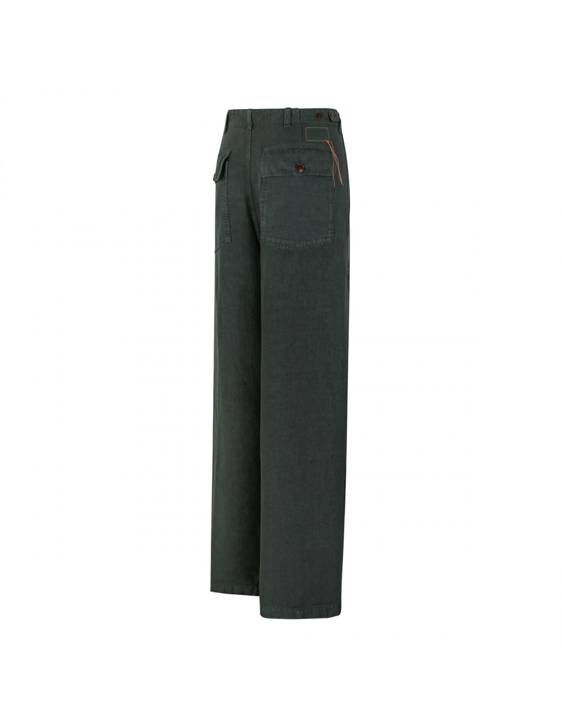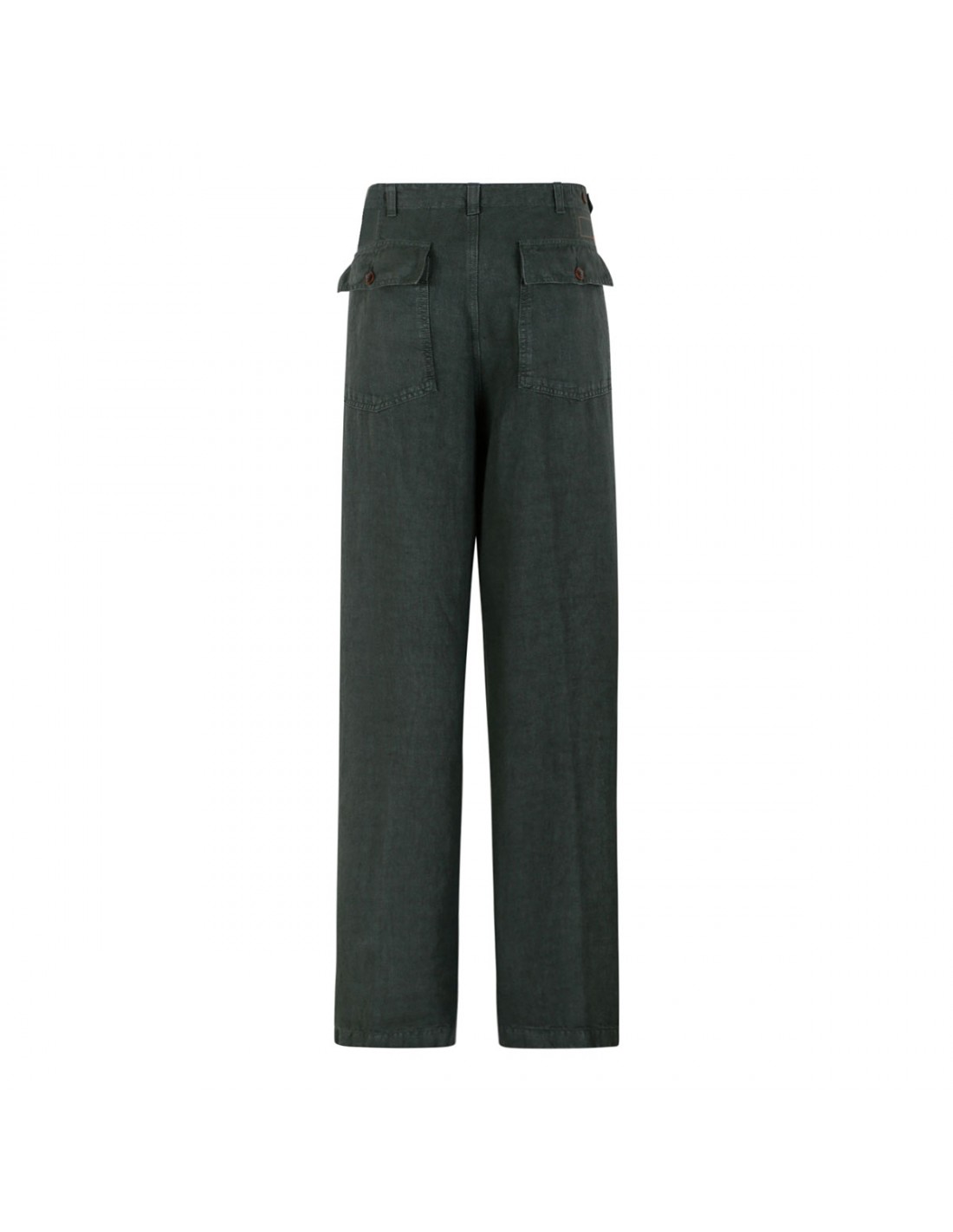 Army green linen Newfatigue pants from Fortela featuring back buttoned flap pockets, regular fit, side pockets, belt loops on the waistband, button closure, zip fly, straight leg.