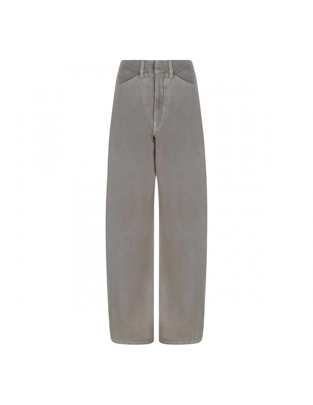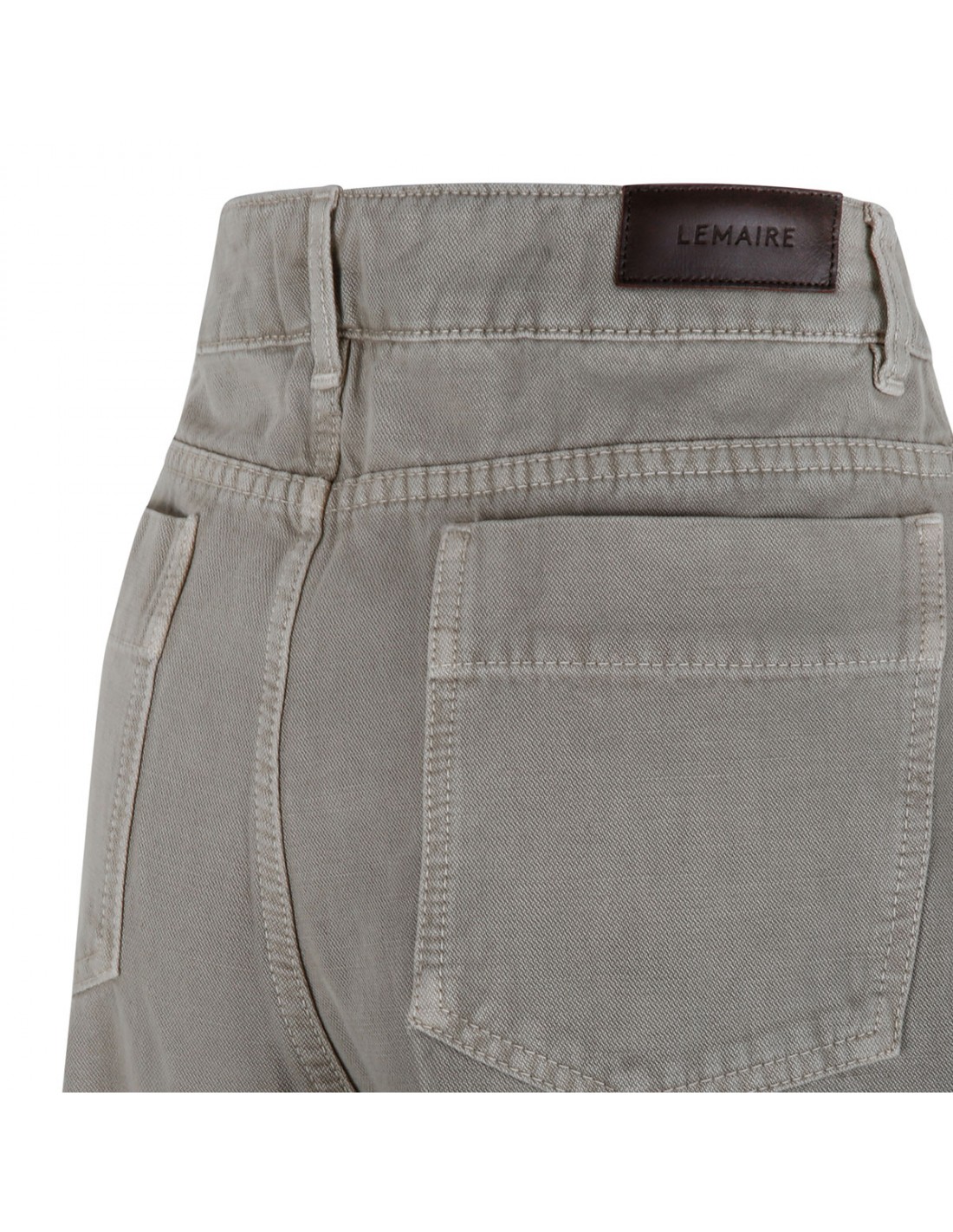 Moonstone hue thick broken twill pants from Lemaire featuring frosted appearance, rounded silhouette with twisted seams, high-waist, slant side pockets, logo embossed leather patch at back, button closure, zip fly, belt loops on the waistband and back patch pockets.