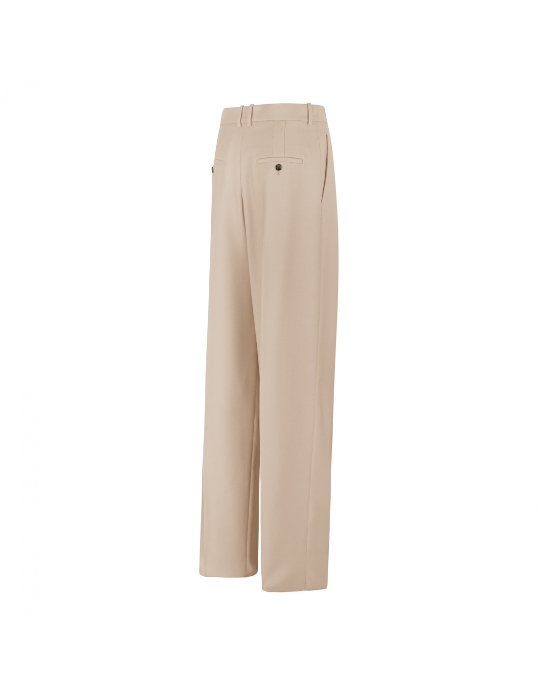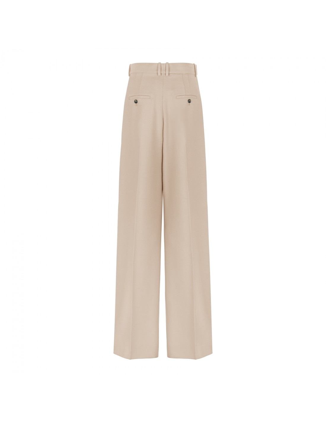 Beige silk and wool blend tailored pants from Saint Laurent featuring high-waist, wide leg, double pleat and center crease, concealed front hook and zip fastening, side pockets, belt loops on the waistband, back jetted pockets.