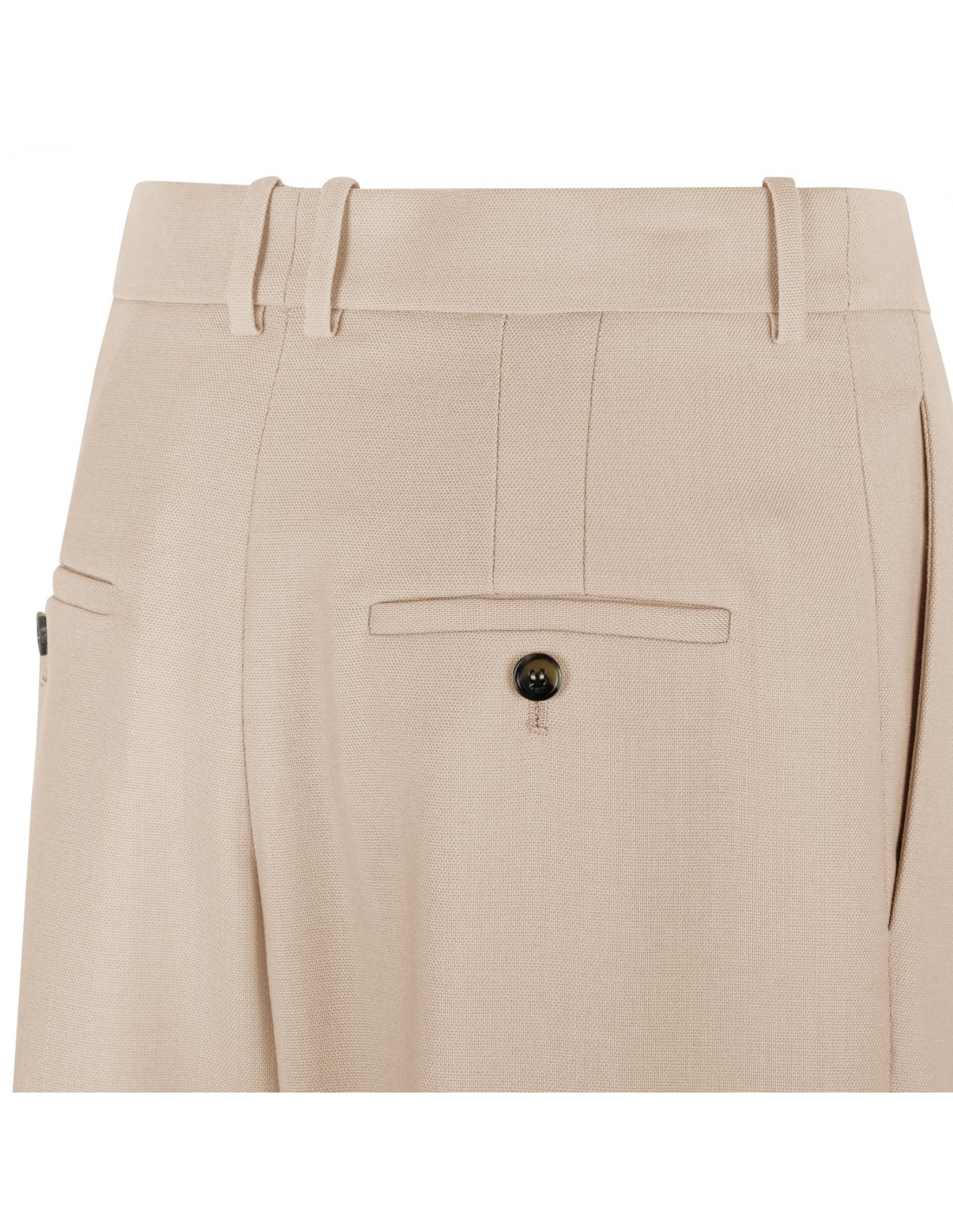 Beige silk and wool blend tailored pants from Saint Laurent featuring high-waist, wide leg, double pleat and center crease, concealed front hook and zip fastening, side pockets, belt loops on the waistband, back jetted pockets.