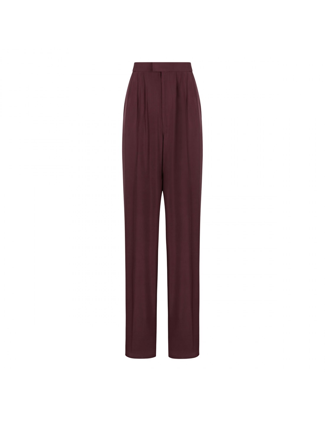 Aubergine hue silk habotai pants from Saint Laurent featuring mid-rise, straight leg, triple pleats, center crease, concealed hook and zip closure at front, concealed side pockets, silk crepe de chine lining.