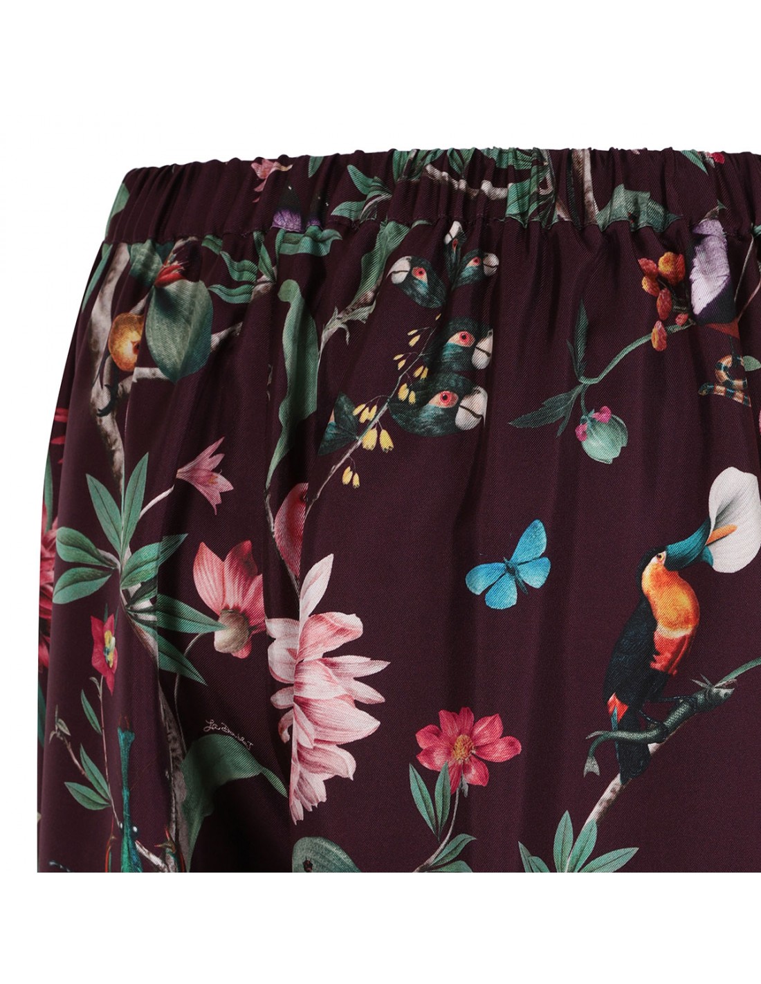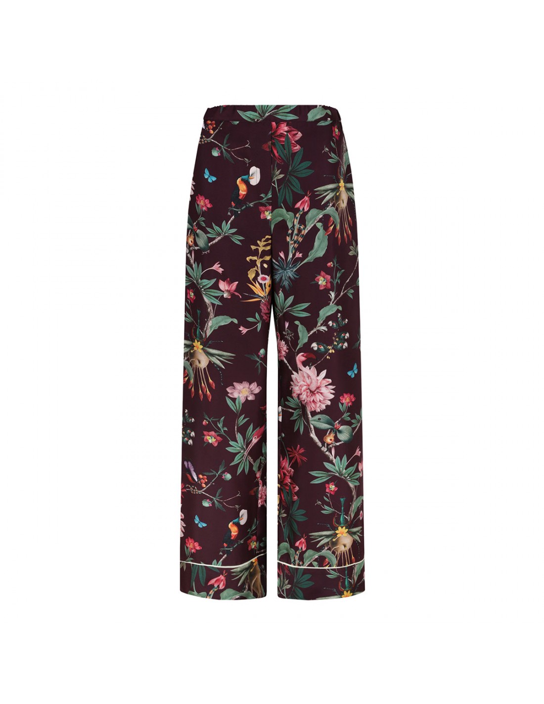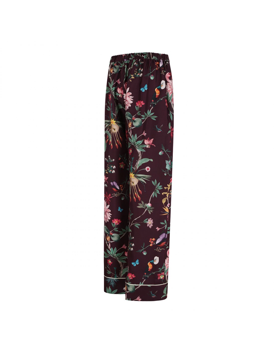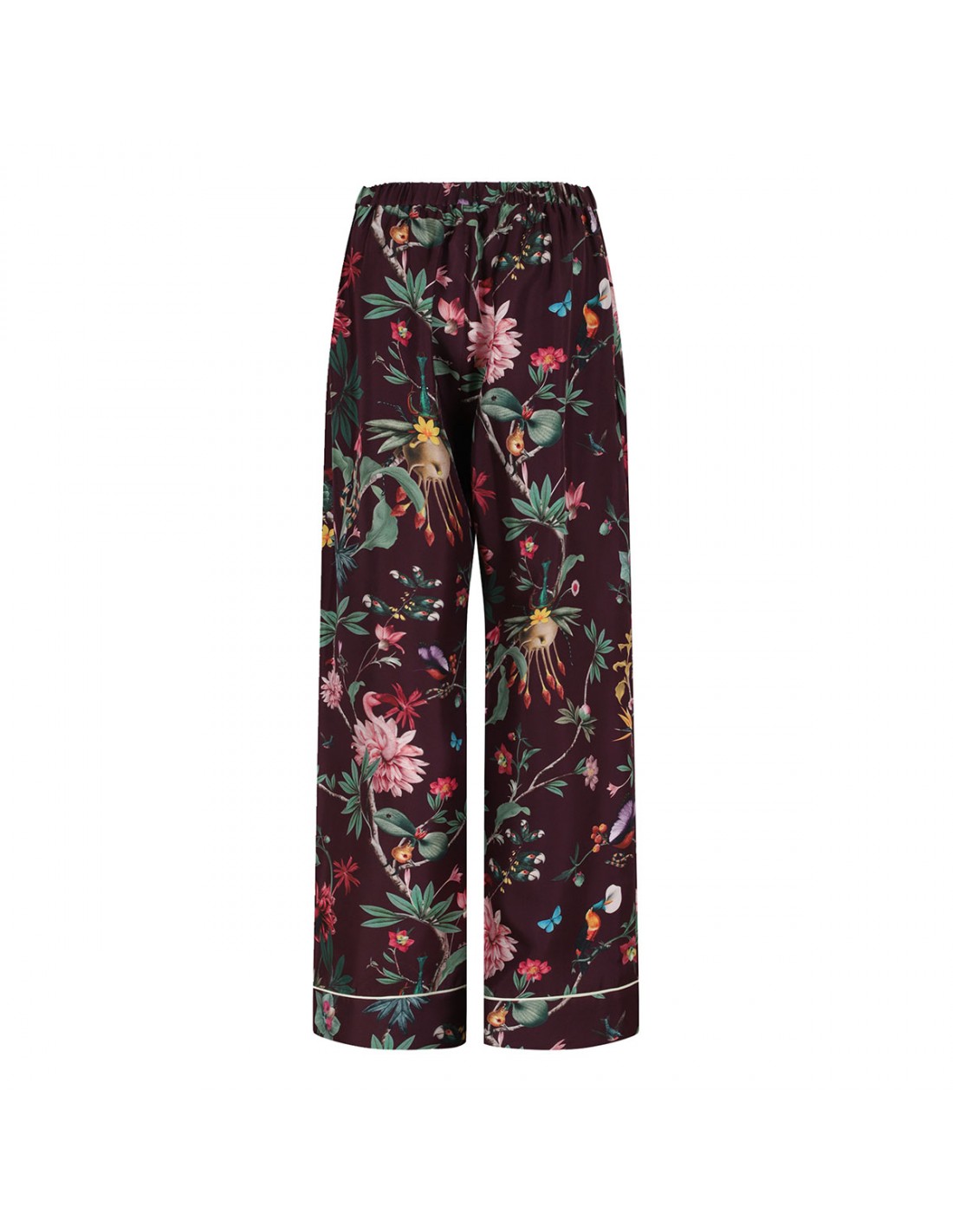 Burgundy silk pajama pants from La Double J featuring multicolor floral motif, contrasting trims, elastic waist, loose leg.