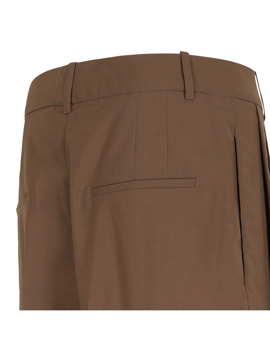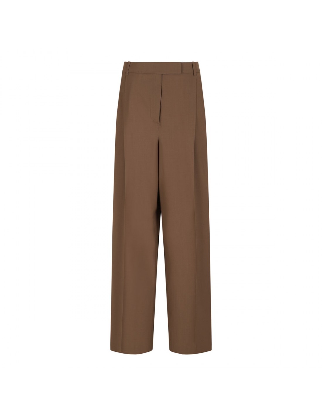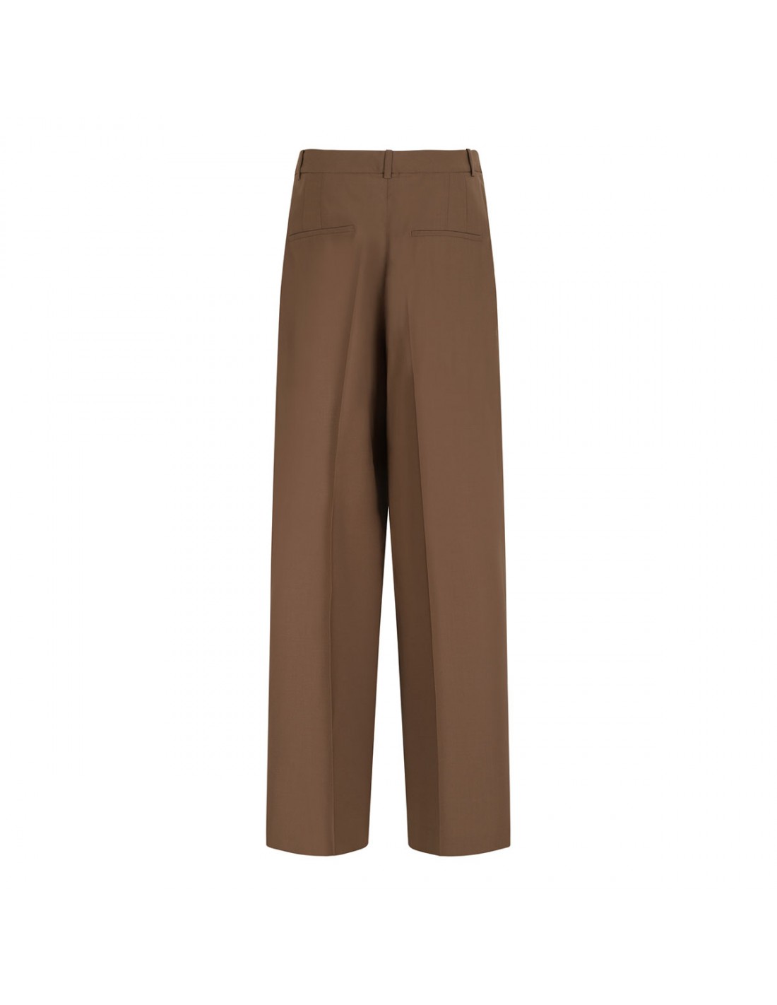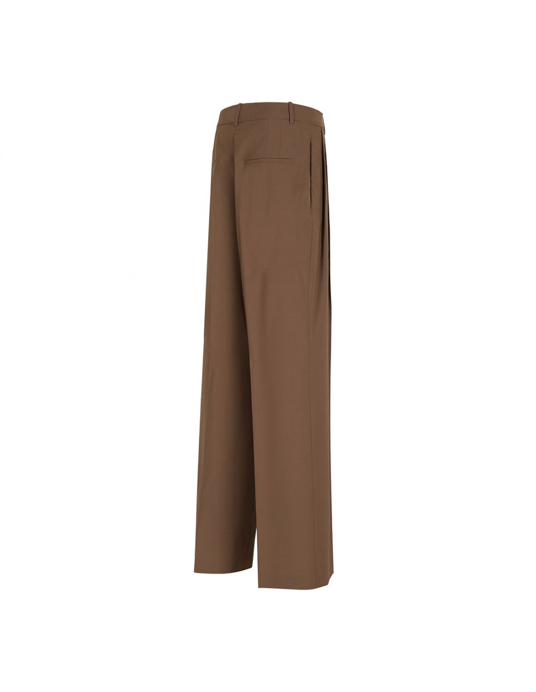 Mocha hue wool blend pants from Rohe featuring classic mid-waist, sharp double pleats, wide leg, side pockets, elongated silhouette, back pockets, belt loops on the waistband, concealed button closure and zip fly.