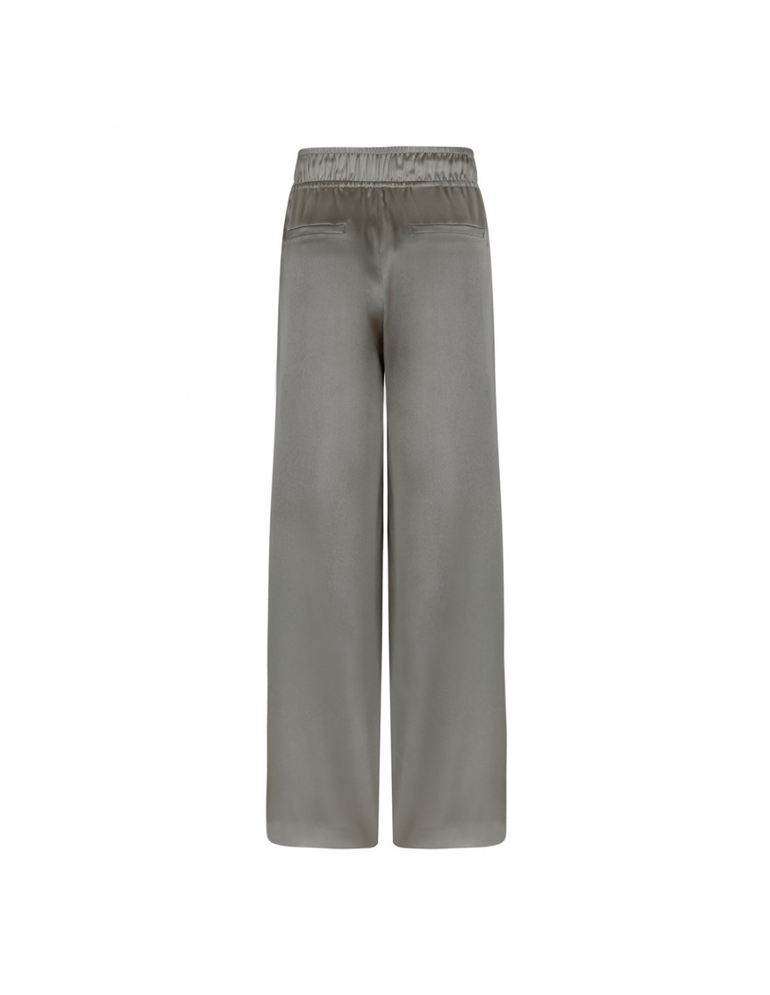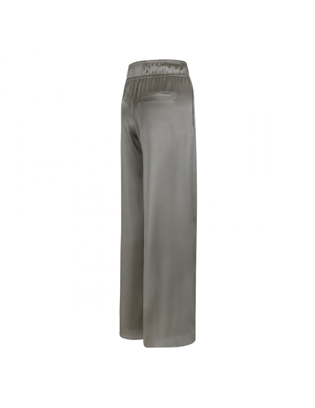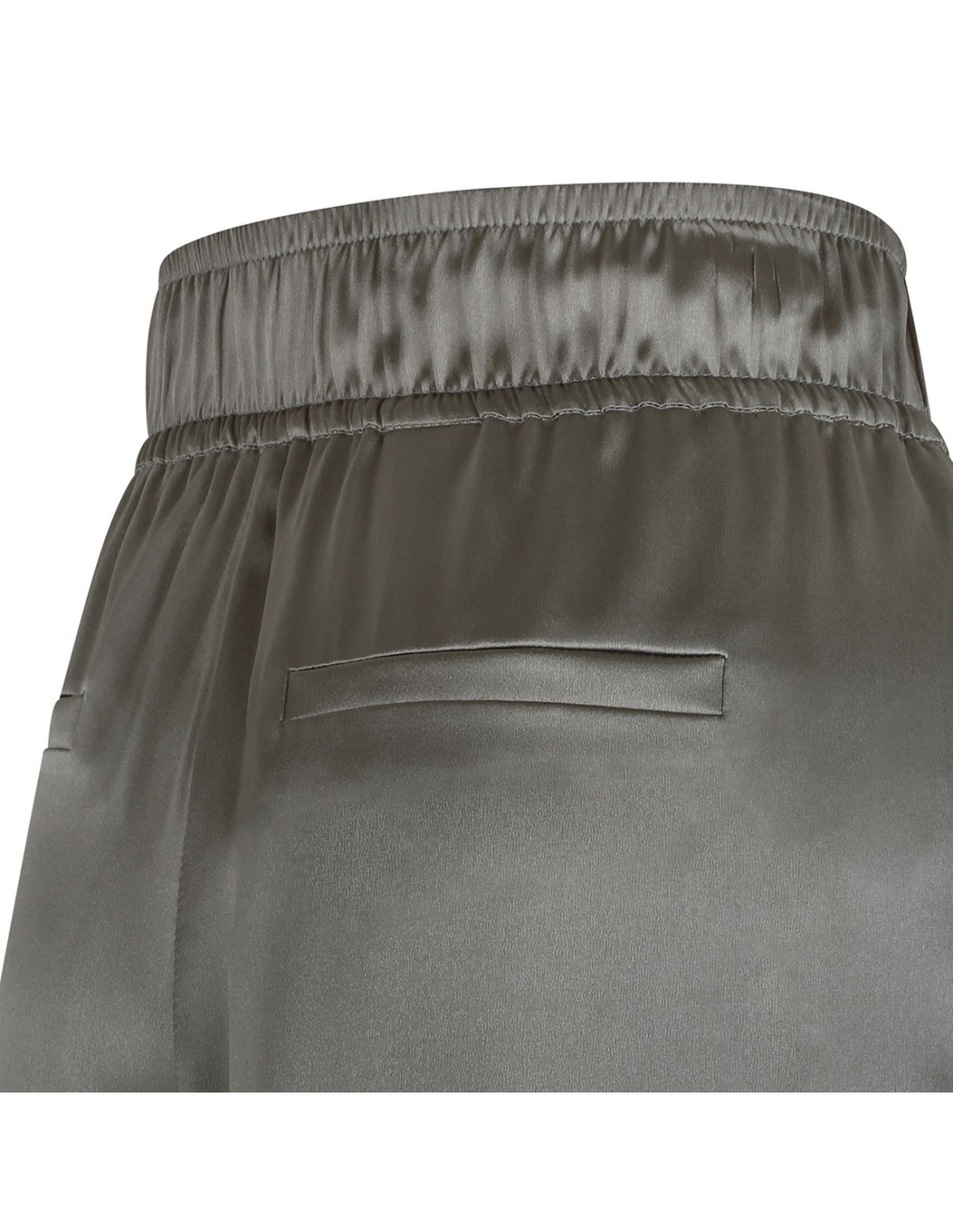 Rosemary hue stretch silk satin track pants from Brunello Cucinelli featuring pull-up style, vertical side pockets, elastic waist, full-length, back welt pockets.