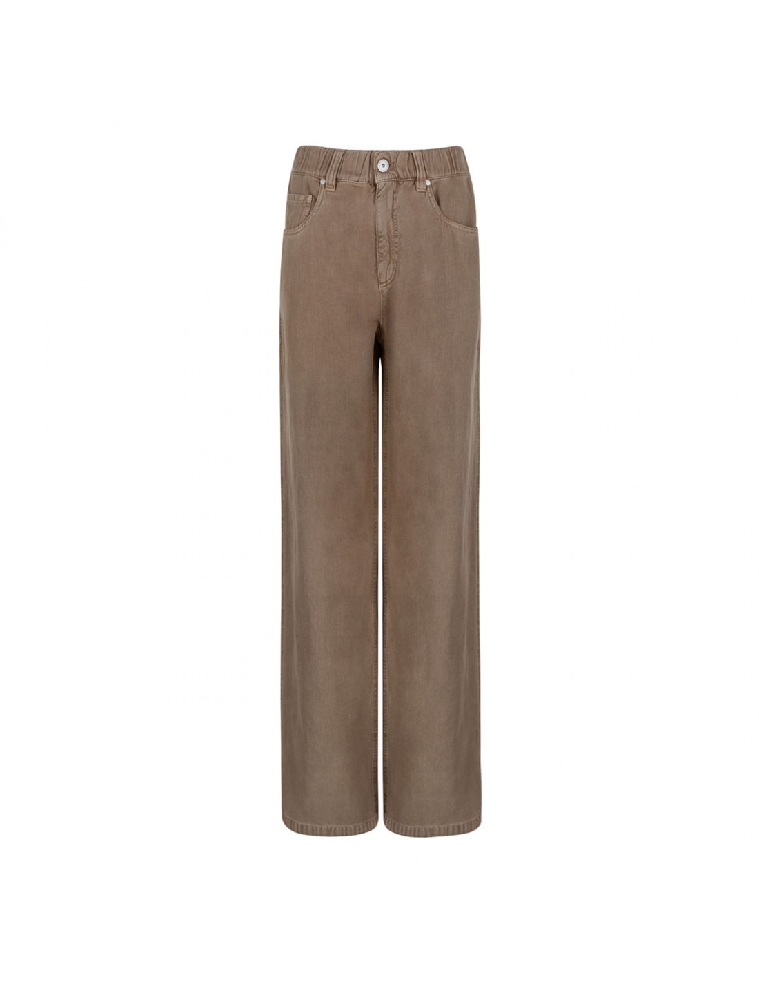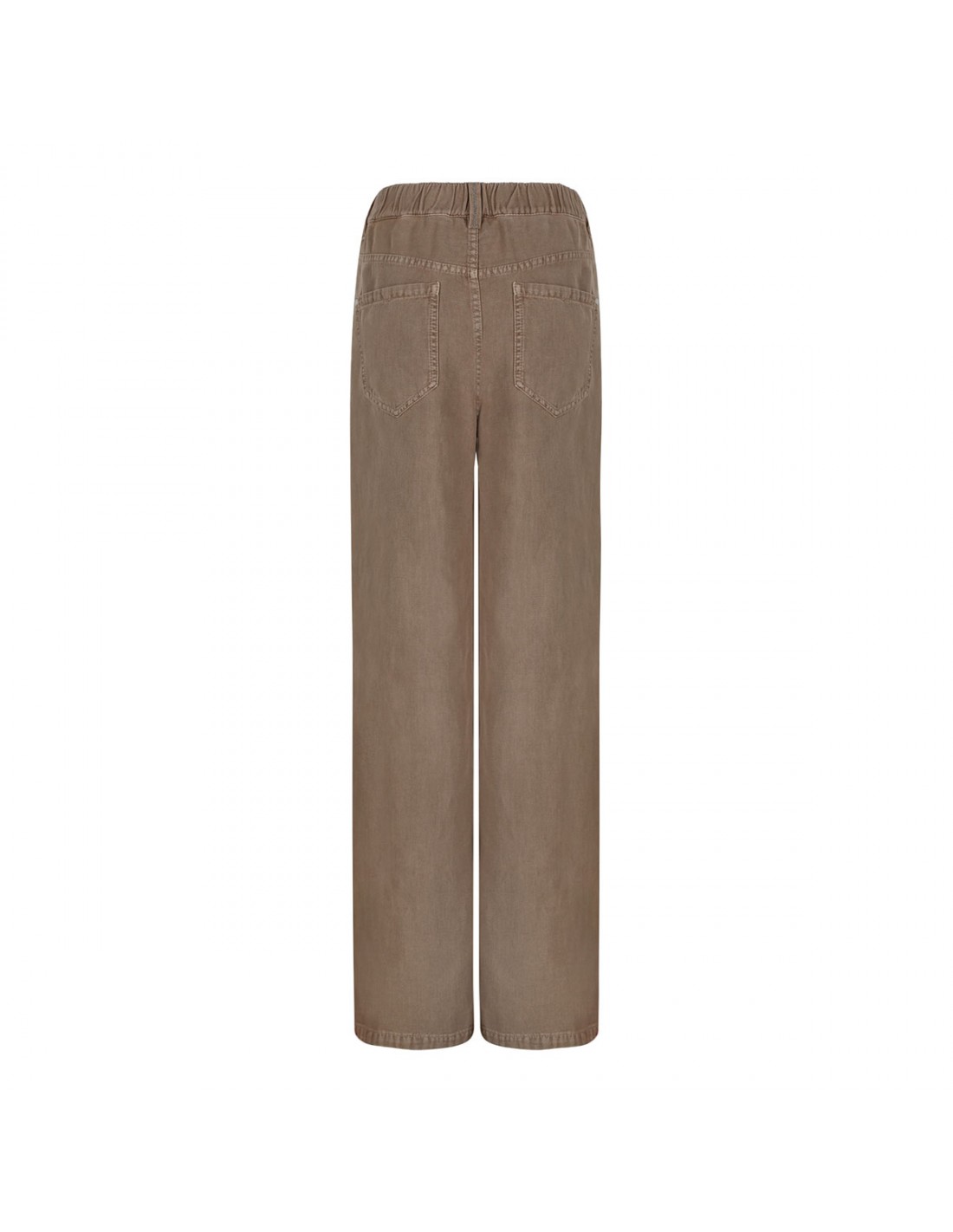 Amber hue cotton and linen pants from Brunello Cucinelli featuring garment-dying, straight-wide leg, signature monili on back belt loop, elastic waist, zip fly and button closure, five-pocket style, full length.