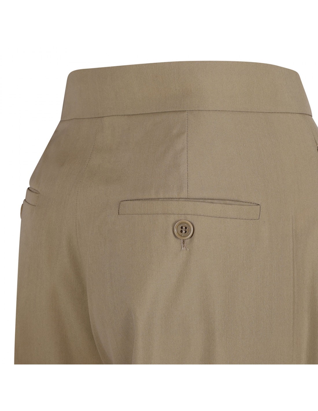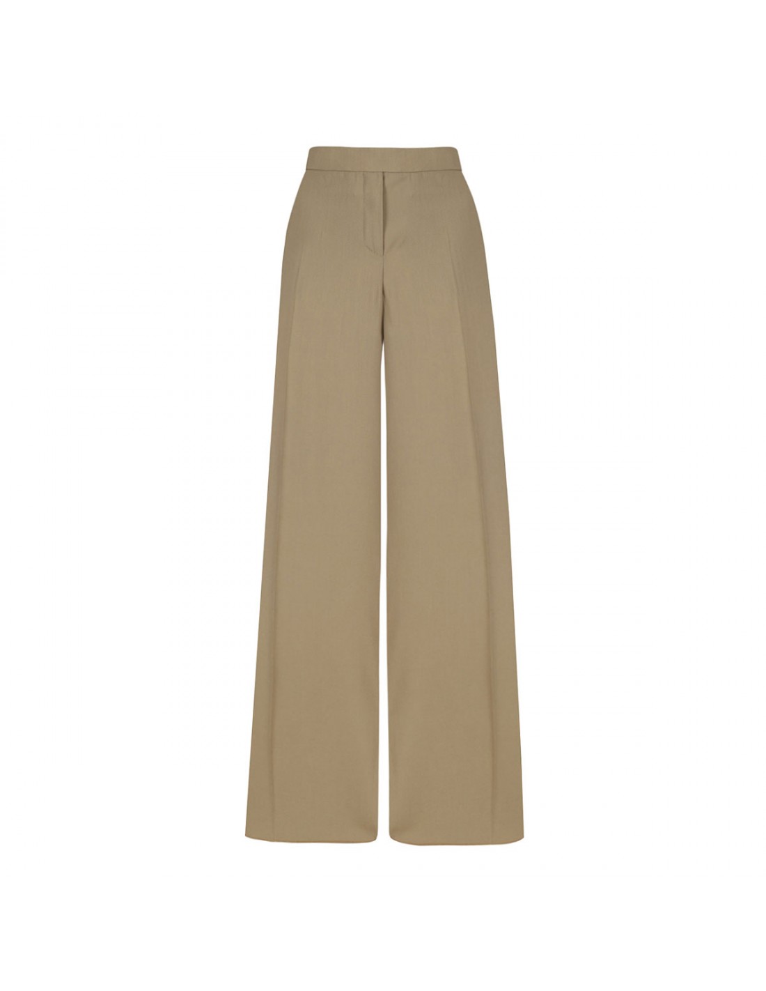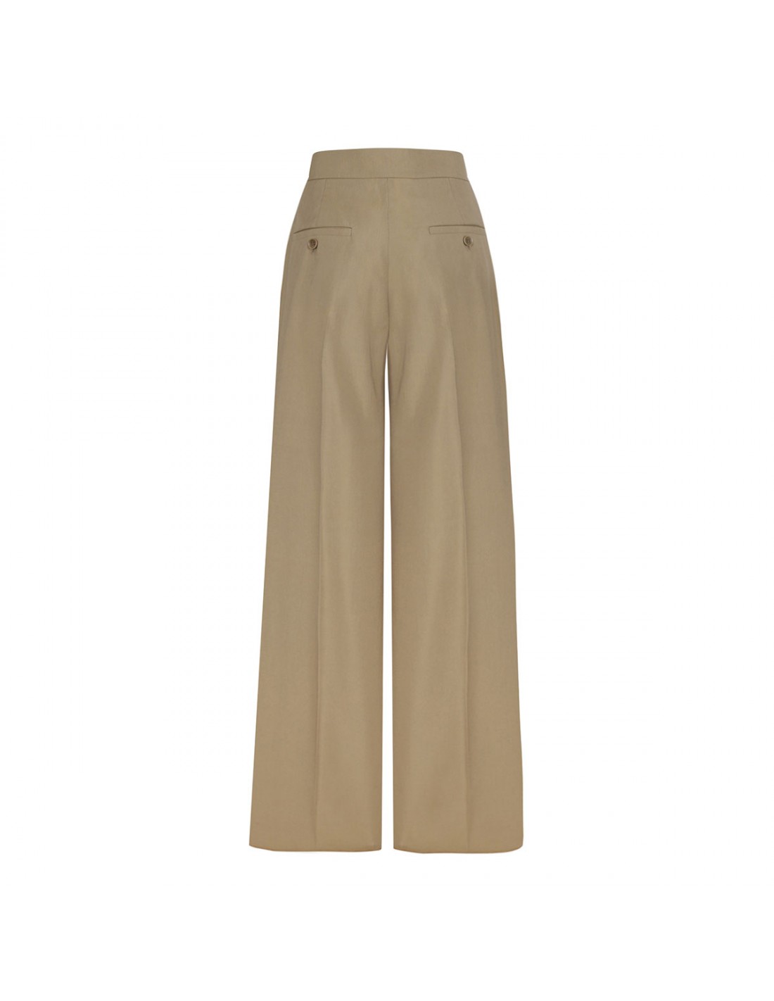 Camel hue wool and silk Bronte pants from Max Mara featuring tailoring-inspired silhouette, wide-leg, creases, wide waistband tab, zip fly and small hook fastening, side pockets, back buttoned pockets, tailored pick stitch and back waist darts.