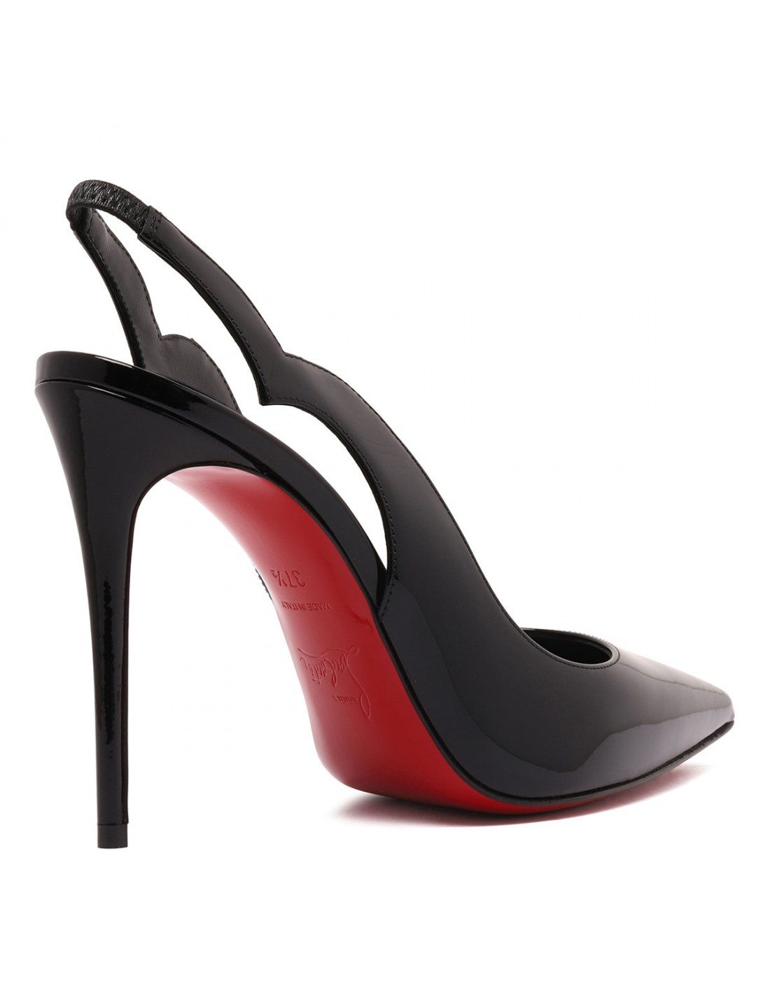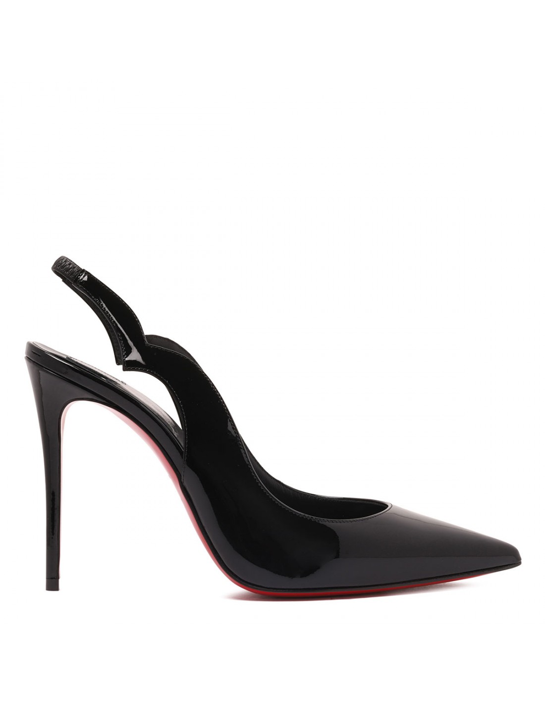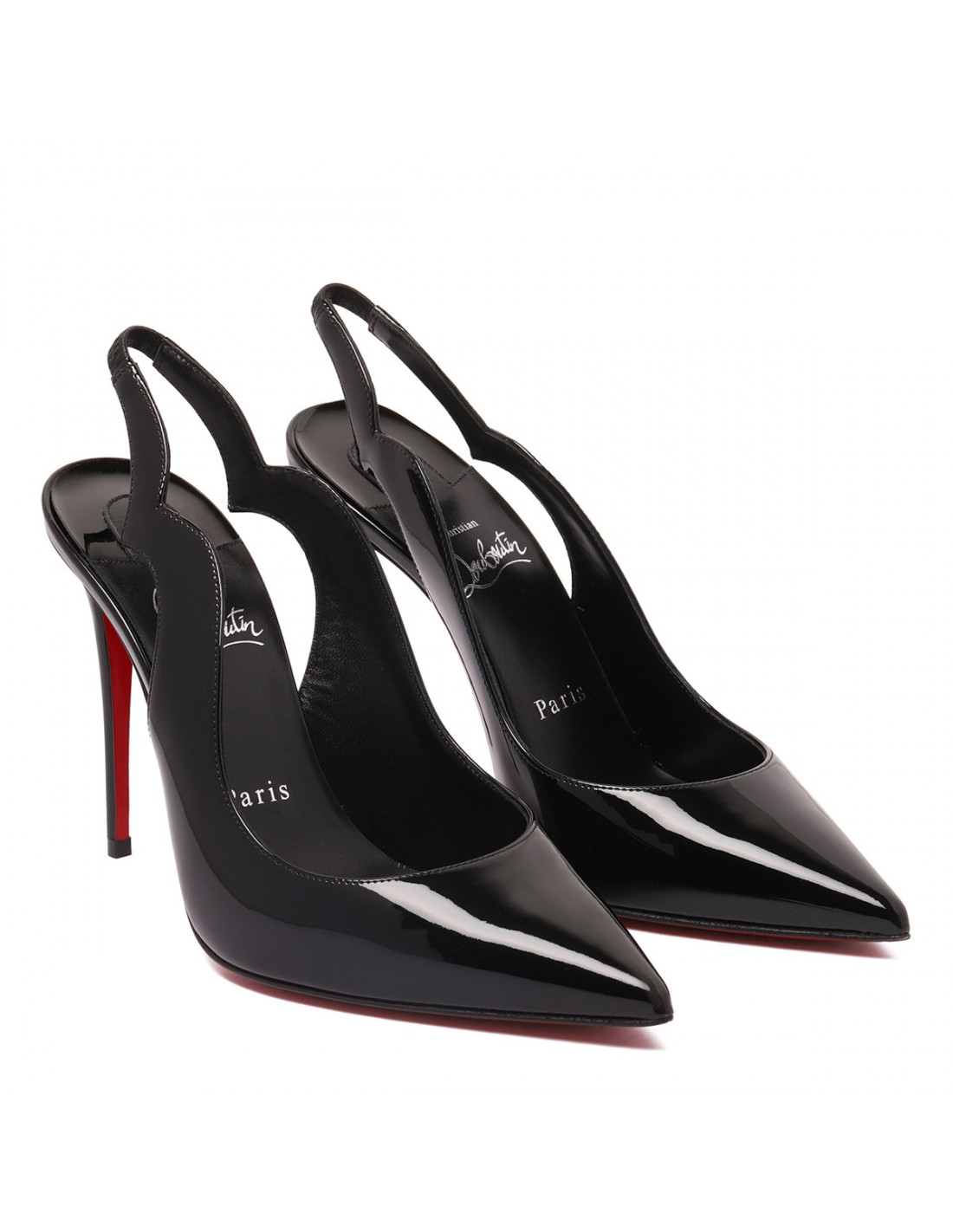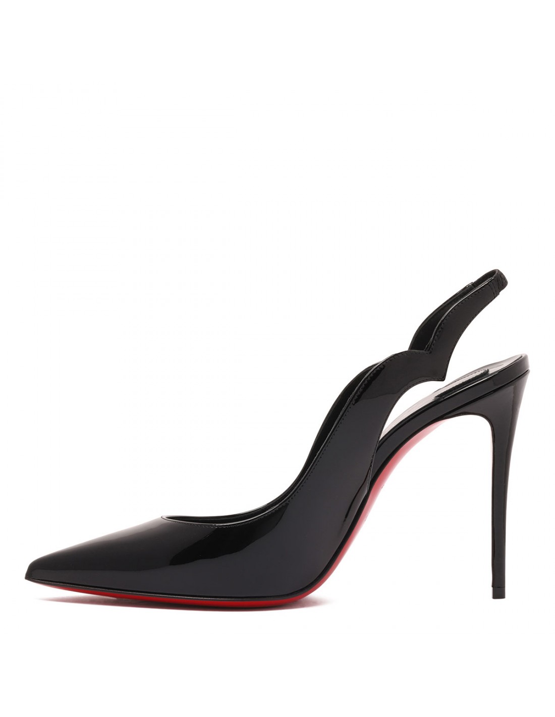 Black patent leather Hot Chick slingback pumps from Christian Louboutin featuring hand-stitched scalloped edges, pointed toe, slingback strap with elastic insert, 100 stiletto heel, leather insole, signature red leather outsole.