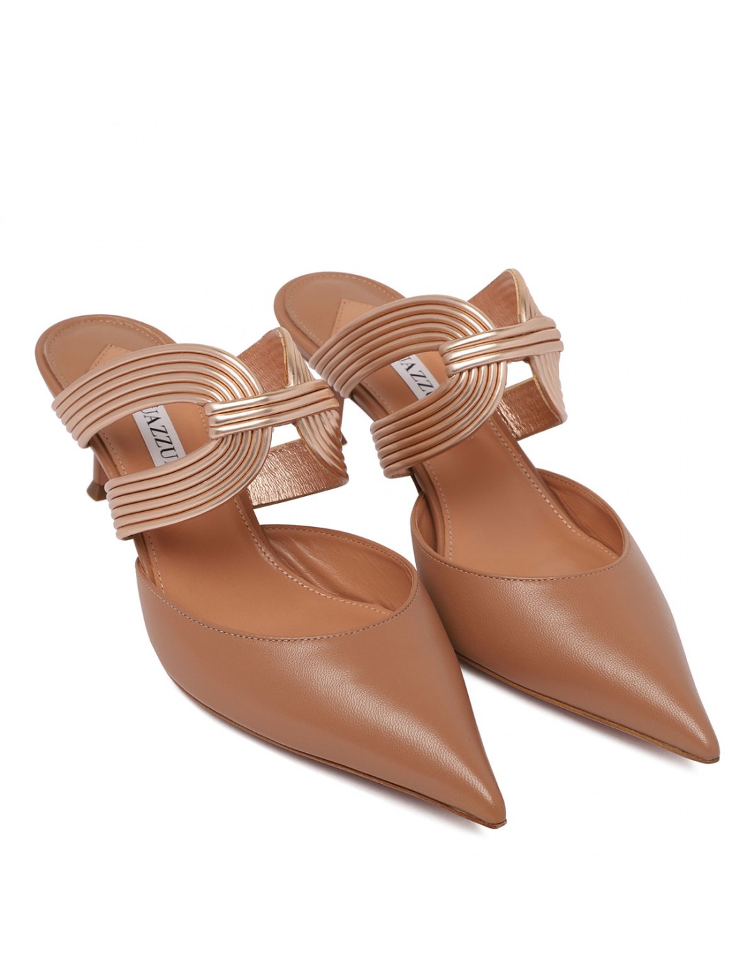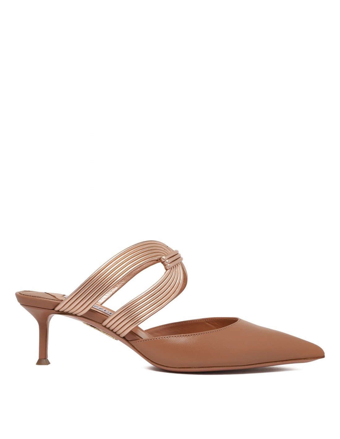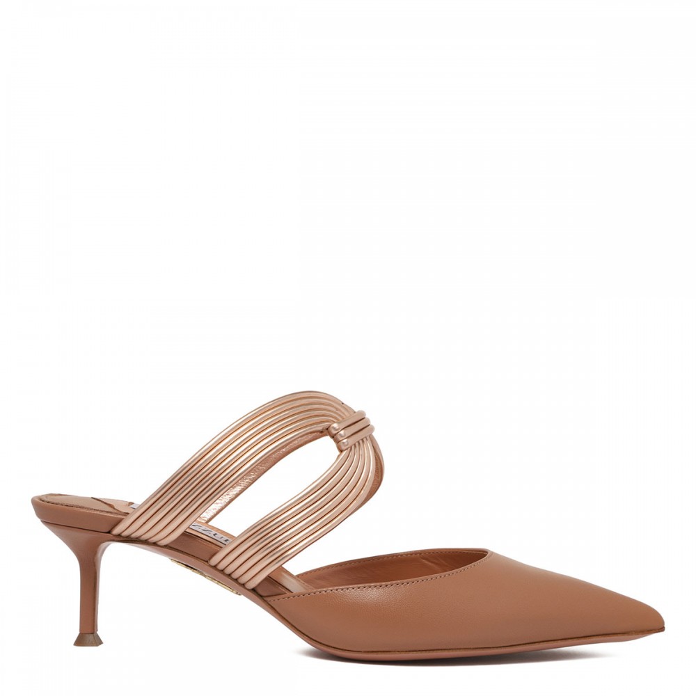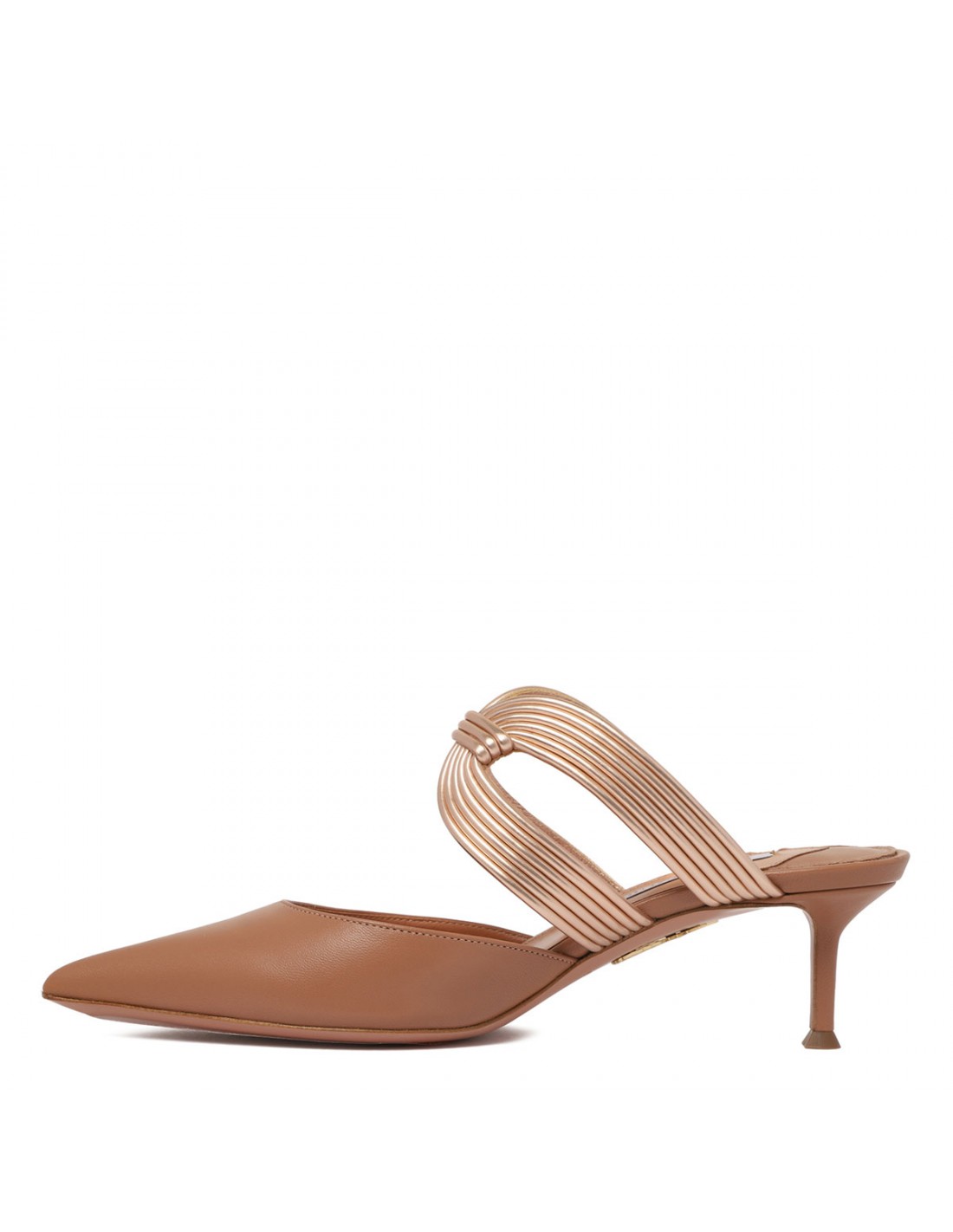 Powder pink nappa leather Esencia mule pumps from Aquazzura featuring curved metallic rose straps, pointed toe, 50 sculpted heel, padded leather insole, leather sole, logo signature.
