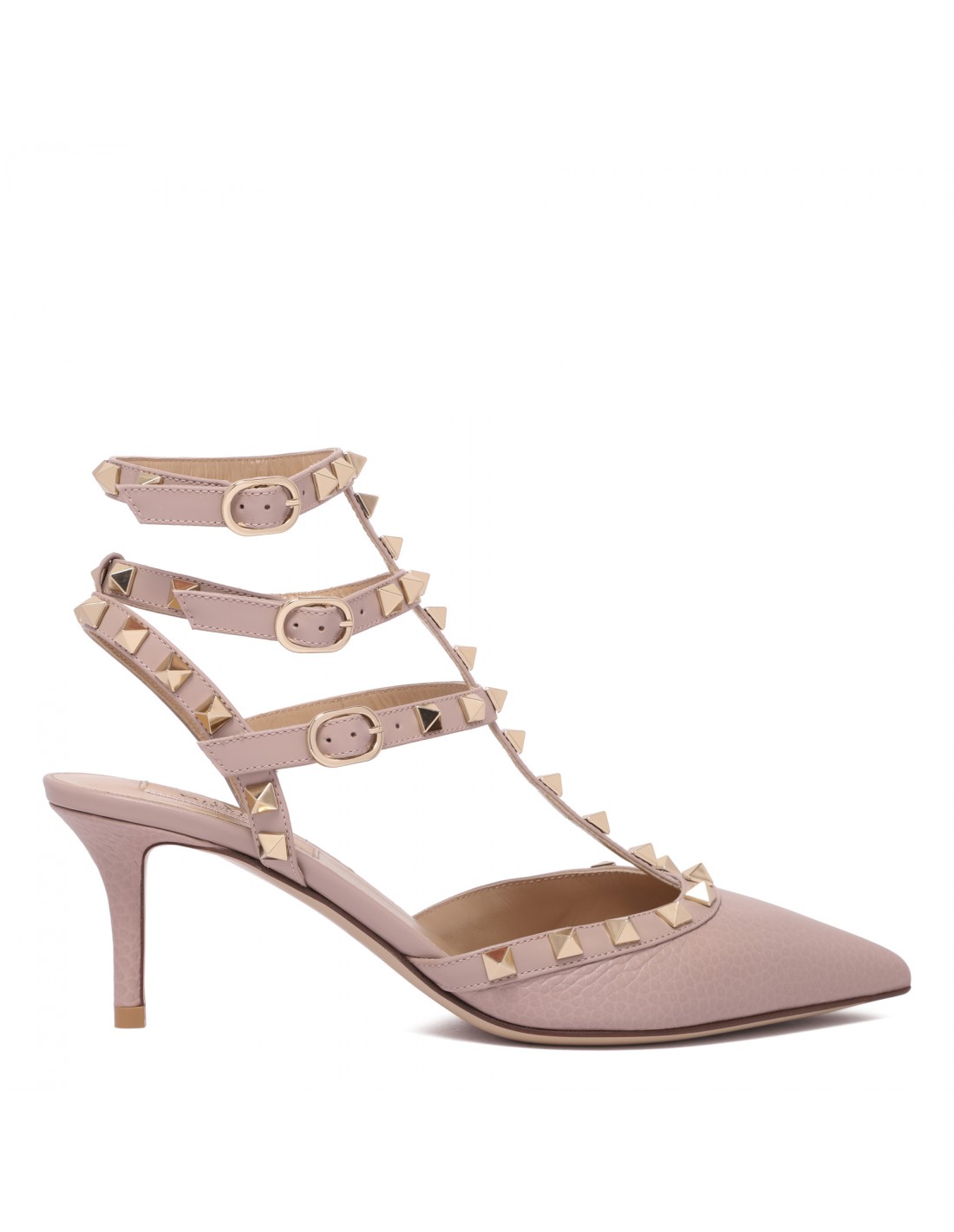 Leather Rockstud ankle strap pumps from Valentino Garavani featuring contrasting poudre leather trims, three straps with buckle fastening, pointed toe, platinum finish studs and hardware, stiletto mid-heel, leather insole and sole.