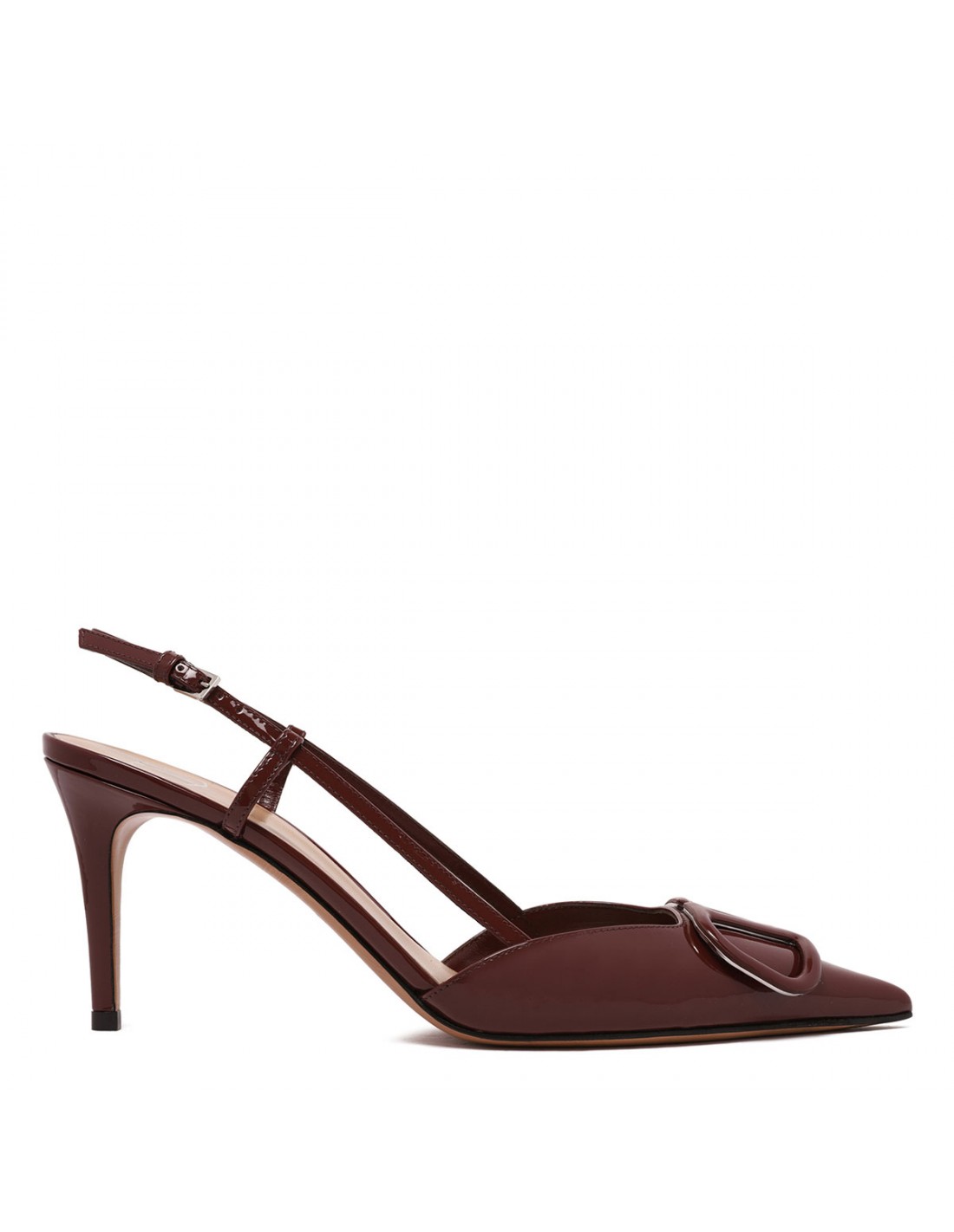 Rosewood patent leather Vlogo Signature slingback pumps from Valentino Garavani featuring VLogo Signature detail covered in patent leather, adjustable slingback strap with buckle closure, pointed toe, 80 stiletto heel, leather insole and sole.